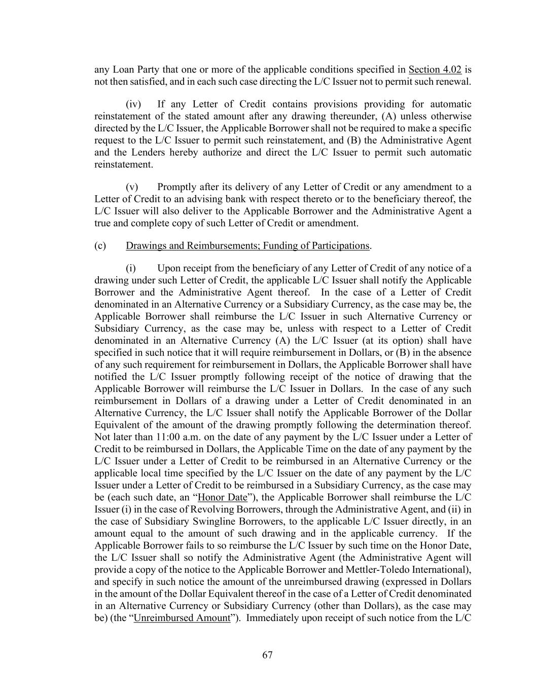 67 any Loan Party that one or more of the applicable conditions specified in Section 4.02 is not then satisfied, and in each such case directing the L/C Issuer not to permit such renewal. (iv) If any Letter of Credit contains provisions providing for automatic reinstatement of the stated amount after any drawing thereunder, (A) unless otherwise directed by the L/C Issuer, the Applicable Borrower shall not be required to make a specific request to the L/C Issuer to permit such reinstatement, and (B) the Administrative Agent and the Lenders hereby authorize and direct the L/C Issuer to permit such automatic reinstatement. (v) Promptly after its delivery of any Letter of Credit or any amendment to a Letter of Credit to an advising bank with respect thereto or to the beneficiary thereof, the L/C Issuer will also deliver to the Applicable Borrower and the Administrative Agent a true and complete copy of such Letter of Credit or amendment. (c) Drawings and Reimbursements; Funding of Participations. (i) Upon receipt from the beneficiary of any Letter of Credit of any notice of a drawing under such Letter of Credit, the applicable L/C Issuer shall notify the Applicable Borrower and the Administrative Agent thereof. In the case of a Letter of Credit denominated in an Alternative Currency or a Subsidiary Currency, as the case may be, the Applicable Borrower shall reimburse the L/C Issuer in such Alternative Currency or Subsidiary Currency, as the case may be, unless with respect to a Letter of Credit denominated in an Alternative Currency (A) the L/C Issuer (at its option) shall have specified in such notice that it will require reimbursement in Dollars, or (B) in the absence of any such requirement for reimbursement in Dollars, the Applicable Borrower shall have notified the L/C Issuer promptly following receipt of the notice of drawing that the Applicable Borrower will reimburse the L/C Issuer in Dollars. In the case of any such reimbursement in Dollars of a drawing under a Letter of Credit denominated in an Alternative Currency, the L/C Issuer shall notify the Applicable Borrower of the Dollar Equivalent of the amount of the drawing promptly following the determination thereof. Not later than 11:00 a.m. on the date of any payment by the L/C Issuer under a Letter of Credit to be reimbursed in Dollars, the Applicable Time on the date of any payment by the L/C Issuer under a Letter of Credit to be reimbursed in an Alternative Currency or the applicable local time specified by the L/C Issuer on the date of any payment by the L/C Issuer under a Letter of Credit to be reimbursed in a Subsidiary Currency, as the case may be (each such date, an “Honor Date”), the Applicable Borrower shall reimburse the L/C Issuer (i) in the case of Revolving Borrowers, through the Administrative Agent, and (ii) in the case of Subsidiary Swingline Borrowers, to the applicable L/C Issuer directly, in an amount equal to the amount of such drawing and in the applicable currency. If the Applicable Borrower fails to so reimburse the L/C Issuer by such time on the Honor Date, the L/C Issuer shall so notify the Administrative Agent (the Administrative Agent will provide a copy of the notice to the Applicable Borrower and Mettler-Toledo International), and specify in such notice the amount of the unreimbursed drawing (expressed in Dollars in the amount of the Dollar Equivalent thereof in the case of a Letter of Credit denominated in an Alternative Currency or Subsidiary Currency (other than Dollars), as the case may be) (the “Unreimbursed Amount”). Immediately upon receipt of such notice from the L/C