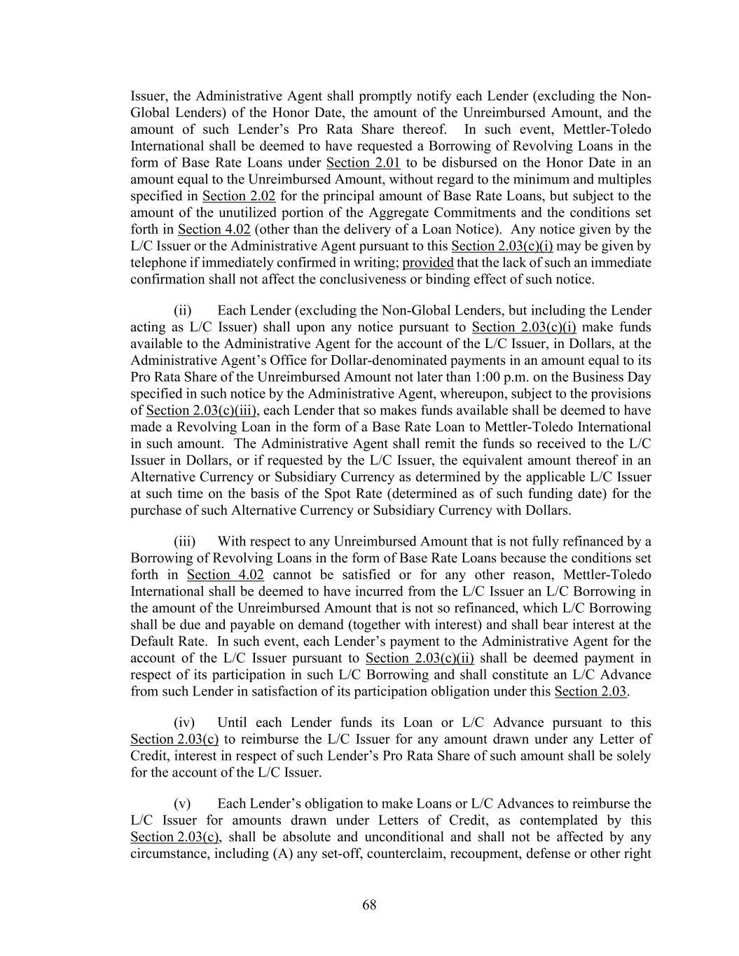 68 Issuer, the Administrative Agent shall promptly notify each Lender (excluding the Non- Global Lenders) of the Honor Date, the amount of the Unreimbursed Amount, and the amount of such Lender’s Pro Rata Share thereof. In such event, Mettler-Toledo International shall be deemed to have requested a Borrowing of Revolving Loans in the form of Base Rate Loans under Section 2.01 to be disbursed on the Honor Date in an amount equal to the Unreimbursed Amount, without regard to the minimum and multiples specified in Section 2.02 for the principal amount of Base Rate Loans, but subject to the amount of the unutilized portion of the Aggregate Commitments and the conditions set forth in Section 4.02 (other than the delivery of a Loan Notice). Any notice given by the L/C Issuer or the Administrative Agent pursuant to this Section 2.03(c)(i) may be given by telephone if immediately confirmed in writing; provided that the lack of such an immediate confirmation shall not affect the conclusiveness or binding effect of such notice. (ii) Each Lender (excluding the Non-Global Lenders, but including the Lender acting as L/C Issuer) shall upon any notice pursuant to Section 2.03(c)(i) make funds available to the Administrative Agent for the account of the L/C Issuer, in Dollars, at the Administrative Agent’s Office for Dollar-denominated payments in an amount equal to its Pro Rata Share of the Unreimbursed Amount not later than 1:00 p.m. on the Business Day specified in such notice by the Administrative Agent, whereupon, subject to the provisions of Section 2.03(c)(iii), each Lender that so makes funds available shall be deemed to have made a Revolving Loan in the form of a Base Rate Loan to Mettler-Toledo International in such amount. The Administrative Agent shall remit the funds so received to the L/C Issuer in Dollars, or if requested by the L/C Issuer, the equivalent amount thereof in an Alternative Currency or Subsidiary Currency as determined by the applicable L/C Issuer at such time on the basis of the Spot Rate (determined as of such funding date) for the purchase of such Alternative Currency or Subsidiary Currency with Dollars. (iii) With respect to any Unreimbursed Amount that is not fully refinanced by a Borrowing of Revolving Loans in the form of Base Rate Loans because the conditions set forth in Section 4.02 cannot be satisfied or for any other reason, Mettler-Toledo International shall be deemed to have incurred from the L/C Issuer an L/C Borrowing in the amount of the Unreimbursed Amount that is not so refinanced, which L/C Borrowing shall be due and payable on demand (together with interest) and shall bear interest at the Default Rate. In such event, each Lender’s payment to the Administrative Agent for the account of the L/C Issuer pursuant to Section 2.03(c)(ii) shall be deemed payment in respect of its participation in such L/C Borrowing and shall constitute an L/C Advance from such Lender in satisfaction of its participation obligation under this Section 2.03. (iv) Until each Lender funds its Loan or L/C Advance pursuant to this Section 2.03(c) to reimburse the L/C Issuer for any amount drawn under any Letter of Credit, interest in respect of such Lender’s Pro Rata Share of such amount shall be solely for the account of the L/C Issuer. (v) Each Lender’s obligation to make Loans or L/C Advances to reimburse the L/C Issuer for amounts drawn under Letters of Credit, as contemplated by this Section 2.03(c), shall be absolute and unconditional and shall not be affected by any circumstance, including (A) any set-off, counterclaim, recoupment, defense or other right