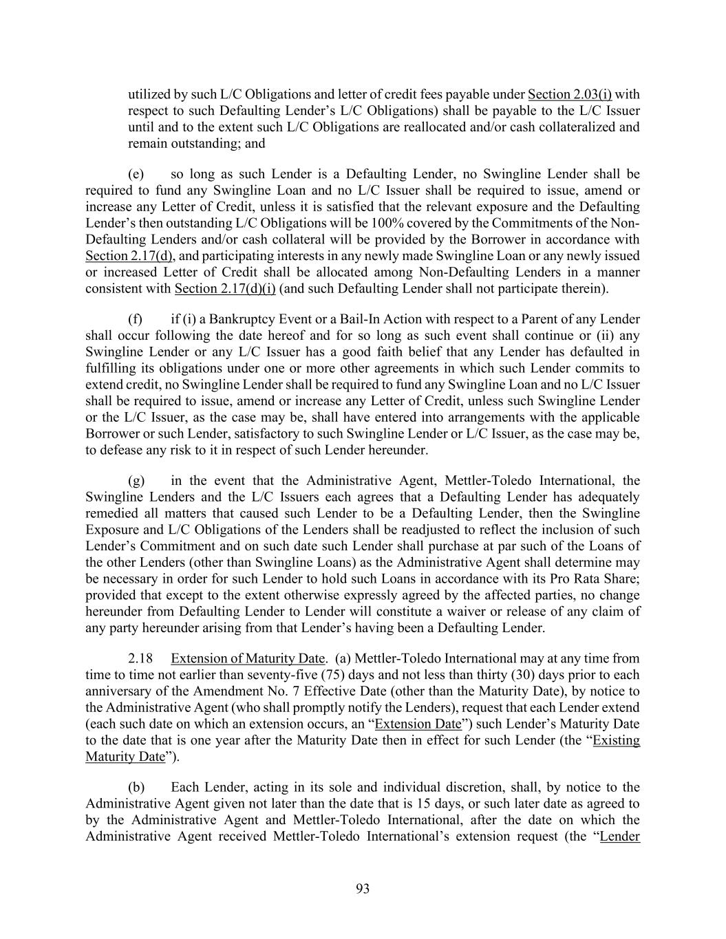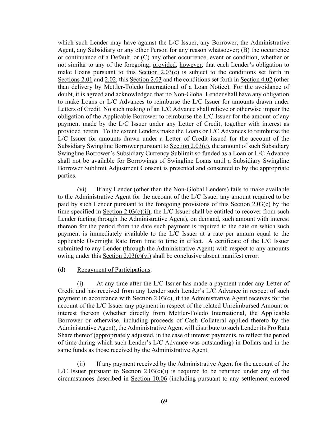 69 which such Lender may have against the L/C Issuer, any Borrower, the Administrative Agent, any Subsidiary or any other Person for any reason whatsoever; (B) the occurrence or continuance of a Default, or (C) any other occurrence, event or condition, whether or not similar to any of the foregoing; provided, however, that each Lender’s obligation to make Loans pursuant to this Section 2.03(c) is subject to the conditions set forth in Sections 2.01 and 2.02, this Section 2.03 and the conditions set forth in Section 4.02 (other than delivery by Mettler-Toledo International of a Loan Notice). For the avoidance of doubt, it is agreed and acknowledged that no Non-Global Lender shall have any obligation to make Loans or L/C Advances to reimburse the L/C Issuer for amounts drawn under Letters of Credit. No such making of an L/C Advance shall relieve or otherwise impair the obligation of the Applicable Borrower to reimburse the L/C Issuer for the amount of any payment made by the L/C Issuer under any Letter of Credit, together with interest as provided herein. To the extent Lenders make the Loans or L/C Advances to reimburse the L/C Issuer for amounts drawn under a Letter of Credit issued for the account of the Subsidiary Swingline Borrower pursuant to Section 2.03(c), the amount of such Subsidiary Swingline Borrower’s Subsidiary Currency Sublimit so funded as a Loan or L/C Advance shall not be available for Borrowings of Swingline Loans until a Subsidiary Swingline Borrower Sublimit Adjustment Consent is presented and consented to by the appropriate parties. (vi) If any Lender (other than the Non-Global Lenders) fails to make available to the Administrative Agent for the account of the L/C Issuer any amount required to be paid by such Lender pursuant to the foregoing provisions of this Section 2.03(c) by the time specified in Section 2.03(c)(ii), the L/C Issuer shall be entitled to recover from such Lender (acting through the Administrative Agent), on demand, such amount with interest thereon for the period from the date such payment is required to the date on which such payment is immediately available to the L/C Issuer at a rate per annum equal to the applicable Overnight Rate from time to time in effect. A certificate of the L/C Issuer submitted to any Lender (through the Administrative Agent) with respect to any amounts owing under this Section 2.03(c)(vi) shall be conclusive absent manifest error. (d) Repayment of Participations. (i) At any time after the L/C Issuer has made a payment under any Letter of Credit and has received from any Lender such Lender’s L/C Advance in respect of such payment in accordance with Section 2.03(c), if the Administrative Agent receives for the account of the L/C Issuer any payment in respect of the related Unreimbursed Amount or interest thereon (whether directly from Mettler-Toledo International, the Applicable Borrower or otherwise, including proceeds of Cash Collateral applied thereto by the Administrative Agent), the Administrative Agent will distribute to such Lender its Pro Rata Share thereof (appropriately adjusted, in the case of interest payments, to reflect the period of time during which such Lender’s L/C Advance was outstanding) in Dollars and in the same funds as those received by the Administrative Agent. (ii) If any payment received by the Administrative Agent for the account of the L/C Issuer pursuant to Section 2.03(c)(i) is required to be returned under any of the circumstances described in Section 10.06 (including pursuant to any settlement entered
