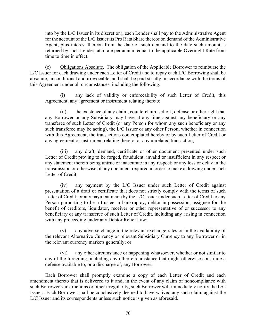 70 into by the L/C Issuer in its discretion), each Lender shall pay to the Administrative Agent for the account of the L/C Issuer its Pro Rata Share thereof on demand of the Administrative Agent, plus interest thereon from the date of such demand to the date such amount is returned by such Lender, at a rate per annum equal to the applicable Overnight Rate from time to time in effect. (e) Obligations Absolute. The obligation of the Applicable Borrower to reimburse the L/C Issuer for each drawing under each Letter of Credit and to repay each L/C Borrowing shall be absolute, unconditional and irrevocable, and shall be paid strictly in accordance with the terms of this Agreement under all circumstances, including the following: (i) any lack of validity or enforceability of such Letter of Credit, this Agreement, any agreement or instrument relating thereto; (ii) the existence of any claim, counterclaim, set-off, defense or other right that any Borrower or any Subsidiary may have at any time against any beneficiary or any transferee of such Letter of Credit (or any Person for whom any such beneficiary or any such transferee may be acting), the L/C Issuer or any other Person, whether in connection with this Agreement, the transactions contemplated hereby or by such Letter of Credit or any agreement or instrument relating thereto, or any unrelated transaction; (iii) any draft, demand, certificate or other document presented under such Letter of Credit proving to be forged, fraudulent, invalid or insufficient in any respect or any statement therein being untrue or inaccurate in any respect; or any loss or delay in the transmission or otherwise of any document required in order to make a drawing under such Letter of Credit; (iv) any payment by the L/C Issuer under such Letter of Credit against presentation of a draft or certificate that does not strictly comply with the terms of such Letter of Credit; or any payment made by the L/C Issuer under such Letter of Credit to any Person purporting to be a trustee in bankruptcy, debtor-in-possession, assignee for the benefit of creditors, liquidator, receiver or other representative of or successor to any beneficiary or any transferee of such Letter of Credit, including any arising in connection with any proceeding under any Debtor Relief Law; (v) any adverse change in the relevant exchange rates or in the availability of the relevant Alternative Currency or relevant Subsidiary Currency to any Borrower or in the relevant currency markets generally; or (vi) any other circumstance or happening whatsoever, whether or not similar to any of the foregoing, including any other circumstance that might otherwise constitute a defense available to, or a discharge of, any Borrower. Each Borrower shall promptly examine a copy of each Letter of Credit and each amendment thereto that is delivered to it and, in the event of any claim of noncompliance with such Borrower’s instructions or other irregularity, such Borrower will immediately notify the L/C Issuer. Each Borrower shall be conclusively deemed to have waived any such claim against the L/C Issuer and its correspondents unless such notice is given as aforesaid.