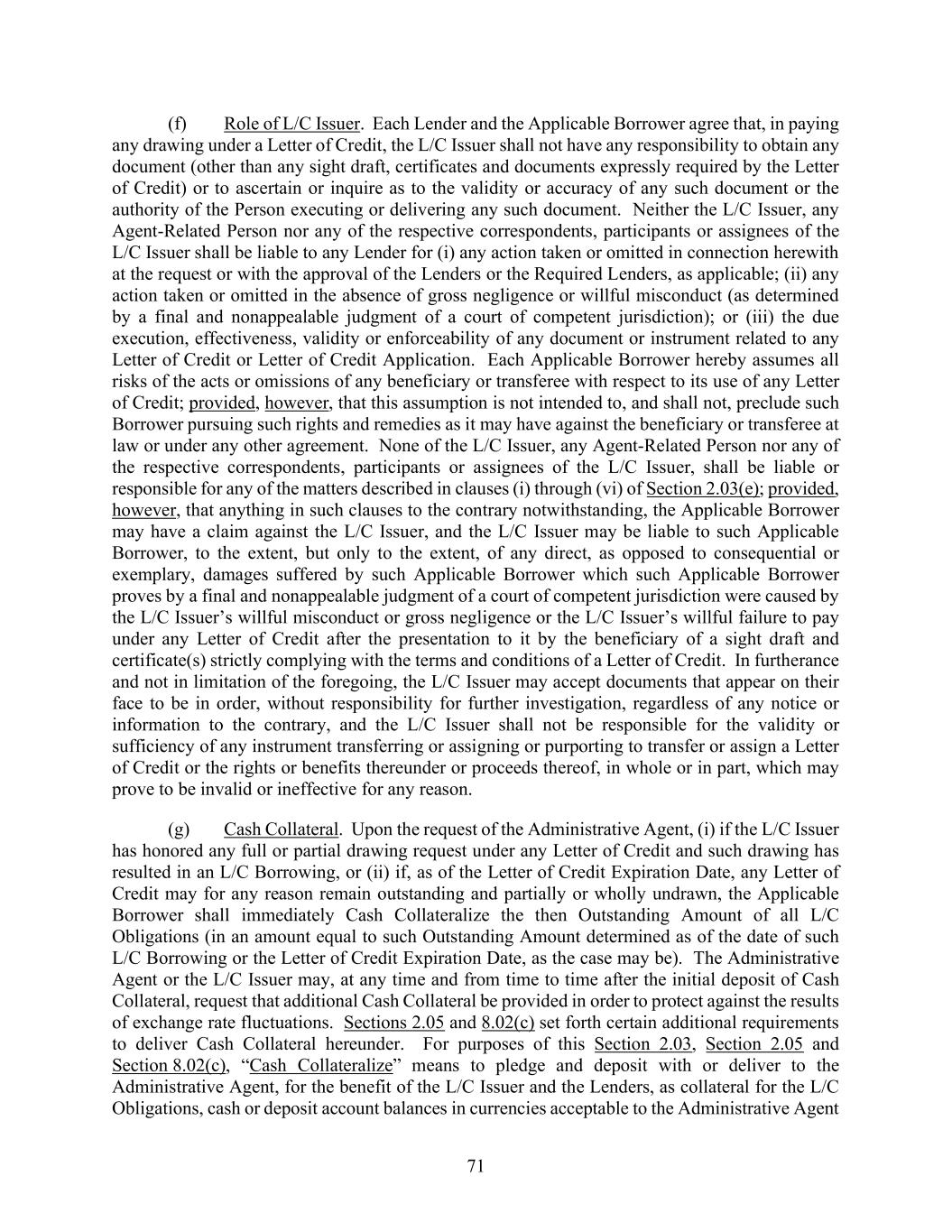 71 (f) Role of L/C Issuer. Each Lender and the Applicable Borrower agree that, in paying any drawing under a Letter of Credit, the L/C Issuer shall not have any responsibility to obtain any document (other than any sight draft, certificates and documents expressly required by the Letter of Credit) or to ascertain or inquire as to the validity or accuracy of any such document or the authority of the Person executing or delivering any such document. Neither the L/C Issuer, any Agent-Related Person nor any of the respective correspondents, participants or assignees of the L/C Issuer shall be liable to any Lender for (i) any action taken or omitted in connection herewith at the request or with the approval of the Lenders or the Required Lenders, as applicable; (ii) any action taken or omitted in the absence of gross negligence or willful misconduct (as determined by a final and nonappealable judgment of a court of competent jurisdiction); or (iii) the due execution, effectiveness, validity or enforceability of any document or instrument related to any Letter of Credit or Letter of Credit Application. Each Applicable Borrower hereby assumes all risks of the acts or omissions of any beneficiary or transferee with respect to its use of any Letter of Credit; provided, however, that this assumption is not intended to, and shall not, preclude such Borrower pursuing such rights and remedies as it may have against the beneficiary or transferee at law or under any other agreement. None of the L/C Issuer, any Agent-Related Person nor any of the respective correspondents, participants or assignees of the L/C Issuer, shall be liable or responsible for any of the matters described in clauses (i) through (vi) of Section 2.03(e); provided, however, that anything in such clauses to the contrary notwithstanding, the Applicable Borrower may have a claim against the L/C Issuer, and the L/C Issuer may be liable to such Applicable Borrower, to the extent, but only to the extent, of any direct, as opposed to consequential or exemplary, damages suffered by such Applicable Borrower which such Applicable Borrower proves by a final and nonappealable judgment of a court of competent jurisdiction were caused by the L/C Issuer’s willful misconduct or gross negligence or the L/C Issuer’s willful failure to pay under any Letter of Credit after the presentation to it by the beneficiary of a sight draft and certificate(s) strictly complying with the terms and conditions of a Letter of Credit. In furtherance and not in limitation of the foregoing, the L/C Issuer may accept documents that appear on their face to be in order, without responsibility for further investigation, regardless of any notice or information to the contrary, and the L/C Issuer shall not be responsible for the validity or sufficiency of any instrument transferring or assigning or purporting to transfer or assign a Letter of Credit or the rights or benefits thereunder or proceeds thereof, in whole or in part, which may prove to be invalid or ineffective for any reason. (g) Cash Collateral. Upon the request of the Administrative Agent, (i) if the L/C Issuer has honored any full or partial drawing request under any Letter of Credit and such drawing has resulted in an L/C Borrowing, or (ii) if, as of the Letter of Credit Expiration Date, any Letter of Credit may for any reason remain outstanding and partially or wholly undrawn, the Applicable Borrower shall immediately Cash Collateralize the then Outstanding Amount of all L/C Obligations (in an amount equal to such Outstanding Amount determined as of the date of such L/C Borrowing or the Letter of Credit Expiration Date, as the case may be). The Administrative Agent or the L/C Issuer may, at any time and from time to time after the initial deposit of Cash Collateral, request that additional Cash Collateral be provided in order to protect against the results of exchange rate fluctuations. Sections 2.05 and 8.02(c) set forth certain additional requirements to deliver Cash Collateral hereunder. For purposes of this Section 2.03, Section 2.05 and Section 8.02(c), “Cash Collateralize” means to pledge and deposit with or deliver to the Administrative Agent, for the benefit of the L/C Issuer and the Lenders, as collateral for the L/C Obligations, cash or deposit account balances in currencies acceptable to the Administrative Agent