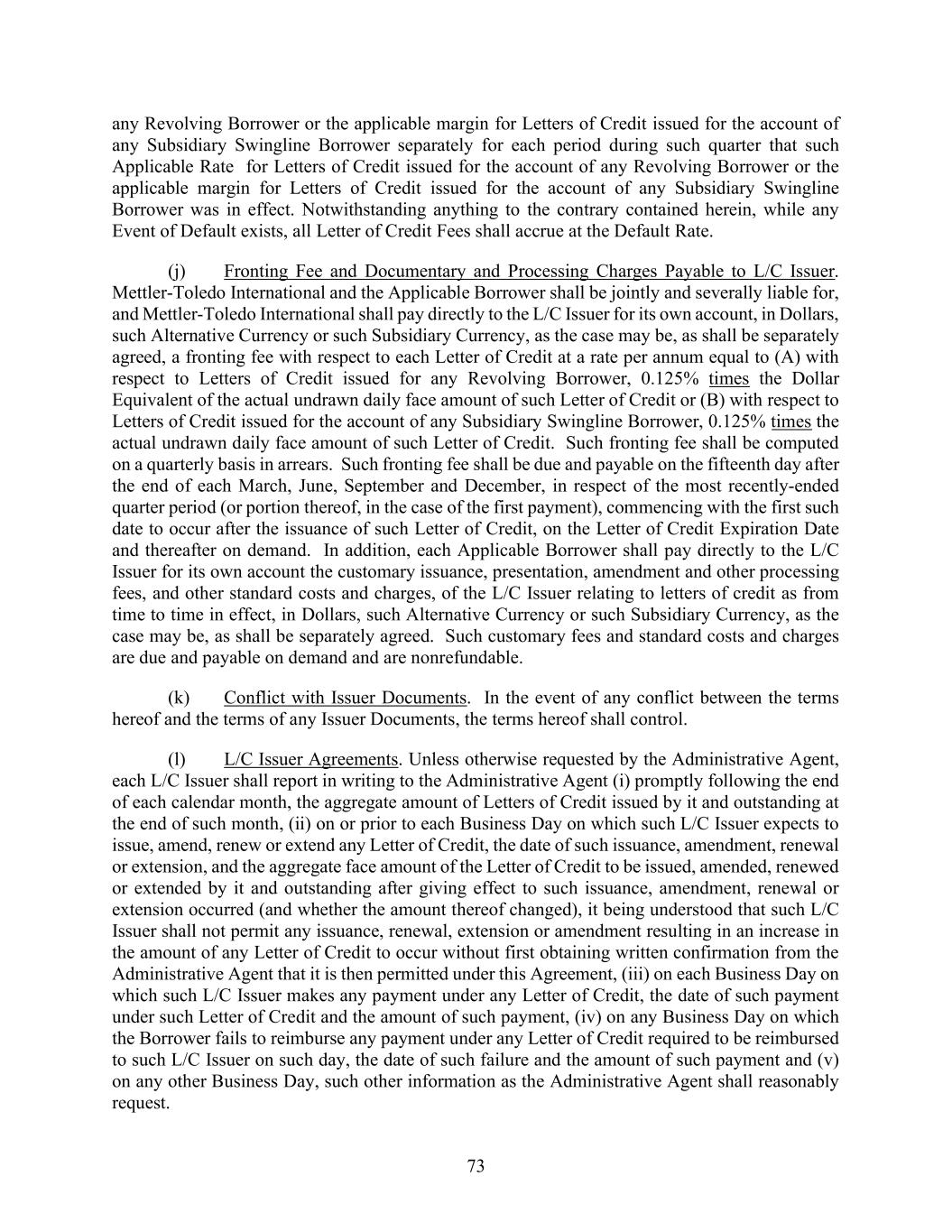 73 any Revolving Borrower or the applicable margin for Letters of Credit issued for the account of any Subsidiary Swingline Borrower separately for each period during such quarter that such Applicable Rate for Letters of Credit issued for the account of any Revolving Borrower or the applicable margin for Letters of Credit issued for the account of any Subsidiary Swingline Borrower was in effect. Notwithstanding anything to the contrary contained herein, while any Event of Default exists, all Letter of Credit Fees shall accrue at the Default Rate. (j) Fronting Fee and Documentary and Processing Charges Payable to L/C Issuer. Mettler-Toledo International and the Applicable Borrower shall be jointly and severally liable for, and Mettler-Toledo International shall pay directly to the L/C Issuer for its own account, in Dollars, such Alternative Currency or such Subsidiary Currency, as the case may be, as shall be separately agreed, a fronting fee with respect to each Letter of Credit at a rate per annum equal to (A) with respect to Letters of Credit issued for any Revolving Borrower, 0.125% times the Dollar Equivalent of the actual undrawn daily face amount of such Letter of Credit or (B) with respect to Letters of Credit issued for the account of any Subsidiary Swingline Borrower, 0.125% times the actual undrawn daily face amount of such Letter of Credit. Such fronting fee shall be computed on a quarterly basis in arrears. Such fronting fee shall be due and payable on the fifteenth day after the end of each March, June, September and December, in respect of the most recently-ended quarter period (or portion thereof, in the case of the first payment), commencing with the first such date to occur after the issuance of such Letter of Credit, on the Letter of Credit Expiration Date and thereafter on demand. In addition, each Applicable Borrower shall pay directly to the L/C Issuer for its own account the customary issuance, presentation, amendment and other processing fees, and other standard costs and charges, of the L/C Issuer relating to letters of credit as from time to time in effect, in Dollars, such Alternative Currency or such Subsidiary Currency, as the case may be, as shall be separately agreed. Such customary fees and standard costs and charges are due and payable on demand and are nonrefundable. (k) Conflict with Issuer Documents. In the event of any conflict between the terms hereof and the terms of any Issuer Documents, the terms hereof shall control. (l) L/C Issuer Agreements. Unless otherwise requested by the Administrative Agent, each L/C Issuer shall report in writing to the Administrative Agent (i) promptly following the end of each calendar month, the aggregate amount of Letters of Credit issued by it and outstanding at the end of such month, (ii) on or prior to each Business Day on which such L/C Issuer expects to issue, amend, renew or extend any Letter of Credit, the date of such issuance, amendment, renewal or extension, and the aggregate face amount of the Letter of Credit to be issued, amended, renewed or extended by it and outstanding after giving effect to such issuance, amendment, renewal or extension occurred (and whether the amount thereof changed), it being understood that such L/C Issuer shall not permit any issuance, renewal, extension or amendment resulting in an increase in the amount of any Letter of Credit to occur without first obtaining written confirmation from the Administrative Agent that it is then permitted under this Agreement, (iii) on each Business Day on which such L/C Issuer makes any payment under any Letter of Credit, the date of such payment under such Letter of Credit and the amount of such payment, (iv) on any Business Day on which the Borrower fails to reimburse any payment under any Letter of Credit required to be reimbursed to such L/C Issuer on such day, the date of such failure and the amount of such payment and (v) on any other Business Day, such other information as the Administrative Agent shall reasonably request.