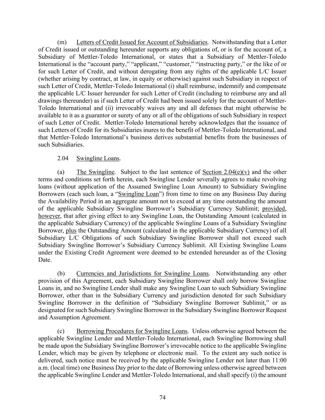 74 (m) Letters of Credit Issued for Account of Subsidiaries. Notwithstanding that a Letter of Credit issued or outstanding hereunder supports any obligations of, or is for the account of, a Subsidiary of Mettler-Toledo International, or states that a Subsidiary of Mettler-Toledo International is the “account party,” “applicant,” “customer,” “instructing party,” or the like of or for such Letter of Credit, and without derogating from any rights of the applicable L/C Issuer (whether arising by contract, at law, in equity or otherwise) against such Subsidiary in respect of such Letter of Credit, Mettler-Toledo International (i) shall reimburse, indemnify and compensate the applicable L/C Issuer hereunder for such Letter of Credit (including to reimburse any and all drawings thereunder) as if such Letter of Credit had been issued solely for the account of Mettler- Toledo International and (ii) irrevocably waives any and all defenses that might otherwise be available to it as a guarantor or surety of any or all of the obligations of such Subsidiary in respect of such Letter of Credit. Mettler-Toledo International hereby acknowledges that the issuance of such Letters of Credit for its Subsidiaries inures to the benefit of Mettler-Toledo International, and that Mettler-Toledo International’s business derives substantial benefits from the businesses of such Subsidiaries. 2.04 Swingline Loans. (a) The Swingline. Subject to the last sentence of Section 2.04(e)(v) and the other terms and conditions set forth herein, each Swingline Lender severally agrees to make revolving loans (without application of the Assumed Swingline Loan Amount) to Subsidiary Swingline Borrowers (each such loan, a “Swingline Loan”) from time to time on any Business Day during the Availability Period in an aggregate amount not to exceed at any time outstanding the amount of the applicable Subsidiary Swingline Borrower’s Subsidiary Currency Sublimit; provided, however, that after giving effect to any Swingline Loan, the Outstanding Amount (calculated in the applicable Subsidiary Currency) of the applicable Swingline Loans of a Subsidiary Swingline Borrower, plus the Outstanding Amount (calculated in the applicable Subsidiary Currency) of all Subsidiary L/C Obligations of such Subsidiary Swingline Borrower shall not exceed such Subsidiary Swingline Borrower’s Subsidiary Currency Sublimit. All Existing Swingline Loans under the Existing Credit Agreement were deemed to be extended hereunder as of the Closing Date. (b) Currencies and Jurisdictions for Swingline Loans. Notwithstanding any other provision of this Agreement, each Subsidiary Swingline Borrower shall only borrow Swingline Loans in, and no Swingline Lender shall make any Swingline Loan to such Subsidiary Swingline Borrower, other than in the Subsidiary Currency and jurisdiction denoted for such Subsidiary Swingline Borrower in the definition of “Subsidiary Swingline Borrower Sublimit,” or as designated for such Subsidiary Swingline Borrower in the Subsidiary Swingline Borrower Request and Assumption Agreement. (c) Borrowing Procedures for Swingline Loans. Unless otherwise agreed between the applicable Swingline Lender and Mettler-Toledo International, each Swingline Borrowing shall be made upon the Subsidiary Swingline Borrower’s irrevocable notice to the applicable Swingline Lender, which may be given by telephone or electronic mail. To the extent any such notice is delivered, such notice must be received by the applicable Swingline Lender not later than 11:00 a.m. (local time) one Business Day prior to the date of Borrowing unless otherwise agreed between the applicable Swingline Lender and Mettler-Toledo International, and shall specify (i) the amount