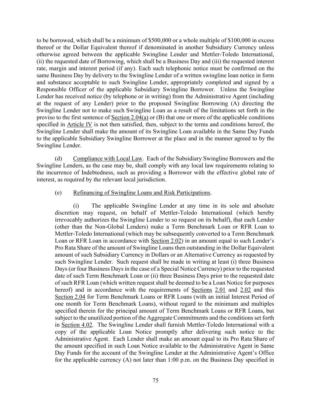 75 to be borrowed, which shall be a minimum of $500,000 or a whole multiple of $100,000 in excess thereof or the Dollar Equivalent thereof if denominated in another Subsidiary Currency unless otherwise agreed between the applicable Swingline Lender and Mettler-Toledo International, (ii) the requested date of Borrowing, which shall be a Business Day and (iii) the requested interest rate, margin and interest period (if any). Each such telephonic notice must be confirmed on the same Business Day by delivery to the Swingline Lender of a written swingline loan notice in form and substance acceptable to such Swingline Lender, appropriately completed and signed by a Responsible Officer of the applicable Subsidiary Swingline Borrower. Unless the Swingline Lender has received notice (by telephone or in writing) from the Administrative Agent (including at the request of any Lender) prior to the proposed Swingline Borrowing (A) directing the Swingline Lender not to make such Swingline Loan as a result of the limitations set forth in the proviso to the first sentence of Section 2.04(a) or (B) that one or more of the applicable conditions specified in Article IV is not then satisfied, then, subject to the terms and conditions hereof, the Swingline Lender shall make the amount of its Swingline Loan available in the Same Day Funds to the applicable Subsidiary Swingline Borrower at the place and in the manner agreed to by the Swingline Lender. (d) Compliance with Local Law. Each of the Subsidiary Swingline Borrowers and the Swingline Lenders, as the case may be, shall comply with any local law requirements relating to the incurrence of Indebtedness, such as providing a Borrower with the effective global rate of interest, as required by the relevant local jurisdiction. (e) Refinancing of Swingline Loans and Risk Participations. (i) The applicable Swingline Lender at any time in its sole and absolute discretion may request, on behalf of Mettler-Toledo International (which hereby irrevocably authorizes the Swingline Lender to so request on its behalf), that each Lender (other than the Non-Global Lenders) make a Term Benchmark Loan or RFR Loan to Mettler-Toledo International (which may be subsequently converted to a Term Benchmark Loan or RFR Loan in accordance with Section 2.02) in an amount equal to such Lender’s Pro Rata Share of the amount of Swingline Loans then outstanding in the Dollar Equivalent amount of such Subsidiary Currency in Dollars or an Alternative Currency as requested by such Swingline Lender. Such request shall be made in writing at least (i) three Business Days (or four Business Days in the case of a Special Notice Currency) prior to the requested date of such Term Benchmark Loan or (ii) three Business Days prior to the requested date of such RFR Loan (which written request shall be deemed to be a Loan Notice for purposes hereof) and in accordance with the requirements of Sections 2.01 and 2.02 and this Section 2.04 for Term Benchmark Loans or RFR Loans (with an initial Interest Period of one month for Term Benchmark Loans), without regard to the minimum and multiples specified therein for the principal amount of Term Benchmark Loans or RFR Loans, but subject to the unutilized portion of the Aggregate Commitments and the conditions set forth in Section 4.02. The Swingline Lender shall furnish Mettler-Toledo International with a copy of the applicable Loan Notice promptly after delivering such notice to the Administrative Agent. Each Lender shall make an amount equal to its Pro Rata Share of the amount specified in such Loan Notice available to the Administrative Agent in Same Day Funds for the account of the Swingline Lender at the Administrative Agent’s Office for the applicable currency (A) not later than 1:00 p.m. on the Business Day specified in