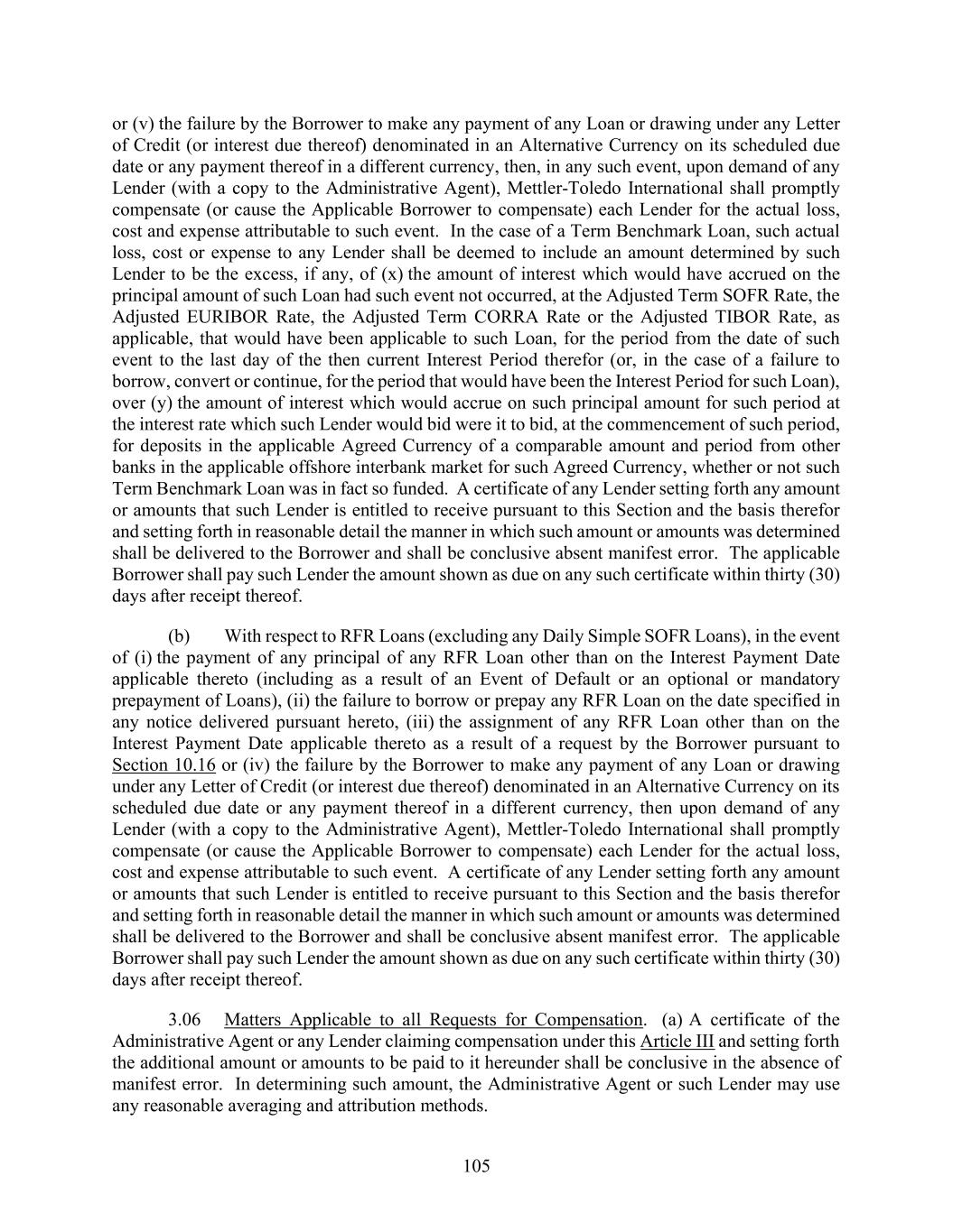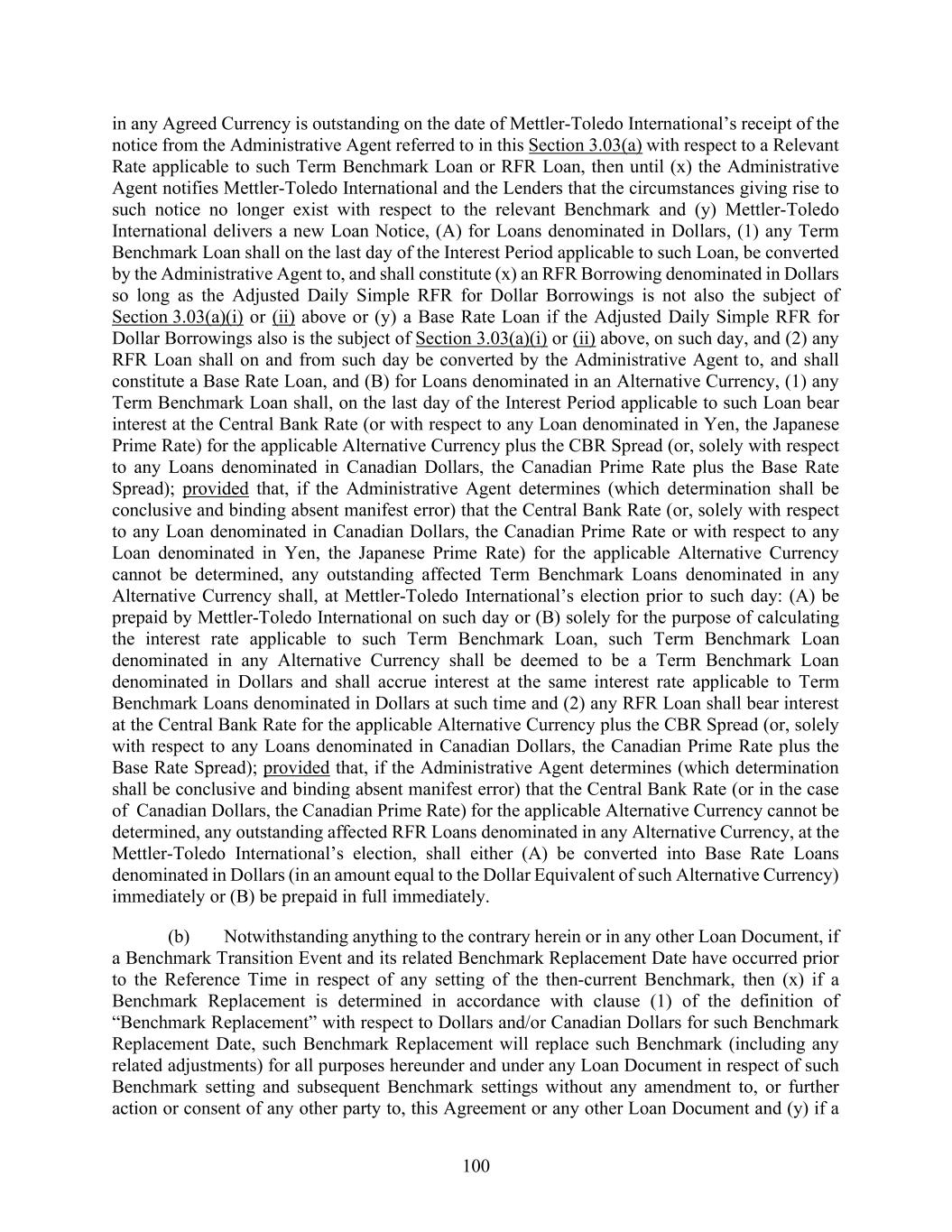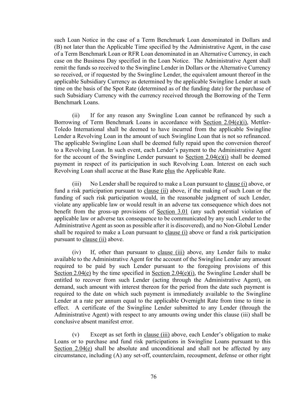 76 such Loan Notice in the case of a Term Benchmark Loan denominated in Dollars and (B) not later than the Applicable Time specified by the Administrative Agent, in the case of a Term Benchmark Loan or RFR Loan denominated in an Alternative Currency, in each case on the Business Day specified in the Loan Notice. The Administrative Agent shall remit the funds so received to the Swingline Lender in Dollars or the Alternative Currency so received, or if requested by the Swingline Lender, the equivalent amount thereof in the applicable Subsidiary Currency as determined by the applicable Swingline Lender at such time on the basis of the Spot Rate (determined as of the funding date) for the purchase of such Subsidiary Currency with the currency received through the Borrowing of the Term Benchmark Loans. (ii) If for any reason any Swingline Loan cannot be refinanced by such a Borrowing of Term Benchmark Loans in accordance with Section 2.04(e)(i), Mettler- Toledo International shall be deemed to have incurred from the applicable Swingline Lender a Revolving Loan in the amount of such Swingline Loan that is not so refinanced. The applicable Swingline Loan shall be deemed fully repaid upon the conversion thereof to a Revolving Loan. In such event, each Lender’s payment to the Administrative Agent for the account of the Swingline Lender pursuant to Section 2.04(e)(i) shall be deemed payment in respect of its participation in such Revolving Loan. Interest on each such Revolving Loan shall accrue at the Base Rate plus the Applicable Rate. (iii) No Lender shall be required to make a Loan pursuant to clause (i) above, or fund a risk participation pursuant to clause (ii) above, if the making of such Loan or the funding of such risk participation would, in the reasonable judgment of such Lender, violate any applicable law or would result in an adverse tax consequence which does not benefit from the gross-up provisions of Section 3.01 (any such potential violation of applicable law or adverse tax consequence to be communicated by any such Lender to the Administrative Agent as soon as possible after it is discovered), and no Non-Global Lender shall be required to make a Loan pursuant to clause (i) above or fund a risk participation pursuant to clause (ii) above. (iv) If, other than pursuant to clause (iii) above, any Lender fails to make available to the Administrative Agent for the account of the Swingline Lender any amount required to be paid by such Lender pursuant to the foregoing provisions of this Section 2.04(e) by the time specified in Section 2.04(e)(i), the Swingline Lender shall be entitled to recover from such Lender (acting through the Administrative Agent), on demand, such amount with interest thereon for the period from the date such payment is required to the date on which such payment is immediately available to the Swingline Lender at a rate per annum equal to the applicable Overnight Rate from time to time in effect. A certificate of the Swingline Lender submitted to any Lender (through the Administrative Agent) with respect to any amounts owing under this clause (iii) shall be conclusive absent manifest error. (v) Except as set forth in clause (iii) above, each Lender’s obligation to make Loans or to purchase and fund risk participations in Swingline Loans pursuant to this Section 2.04(e) shall be absolute and unconditional and shall not be affected by any circumstance, including (A) any set-off, counterclaim, recoupment, defense or other right