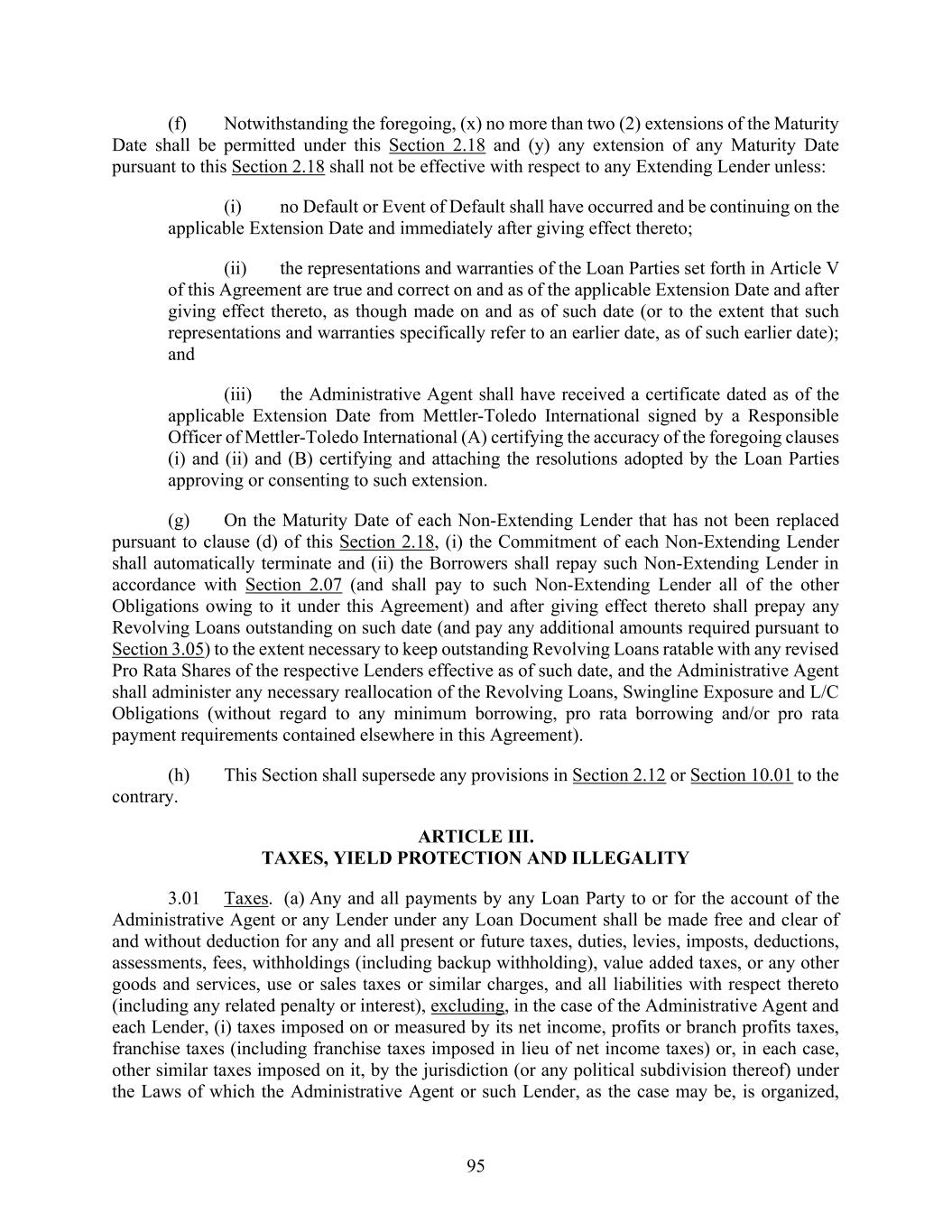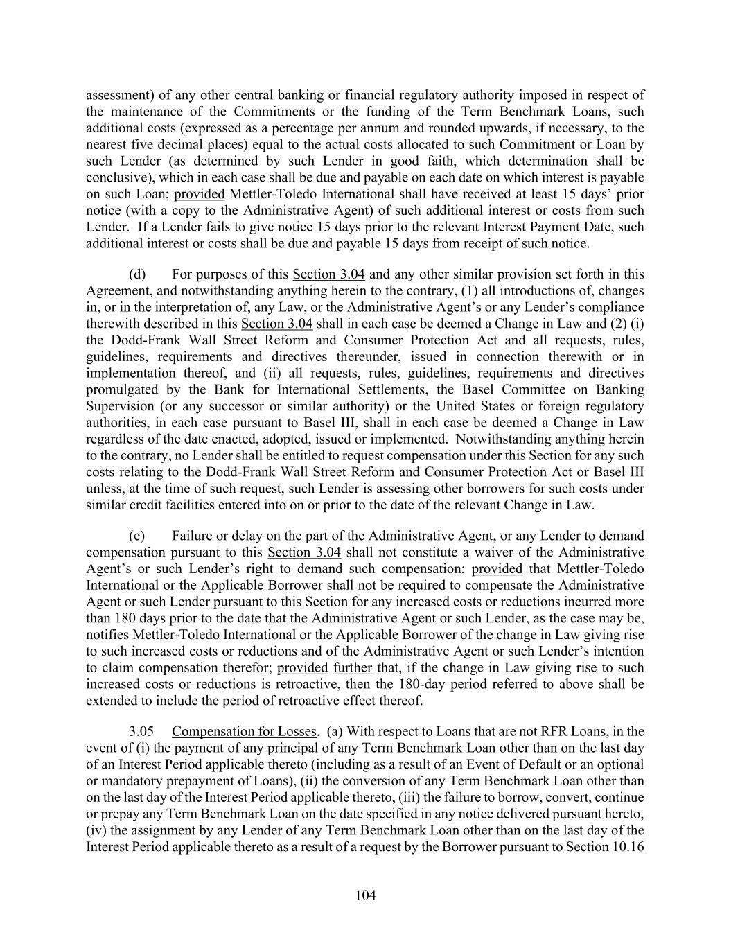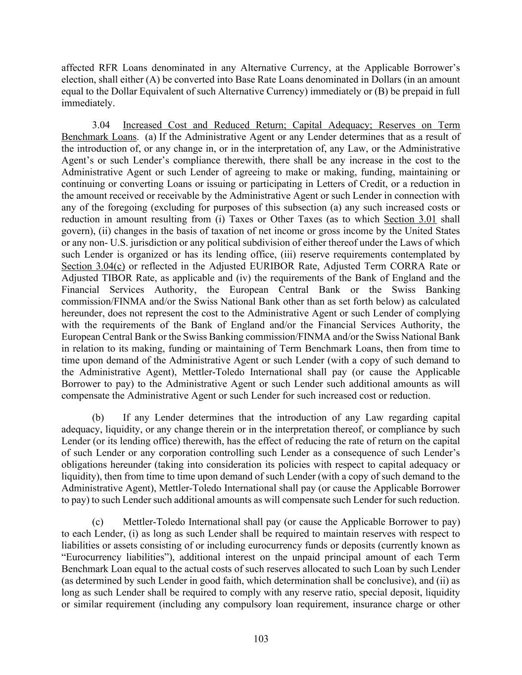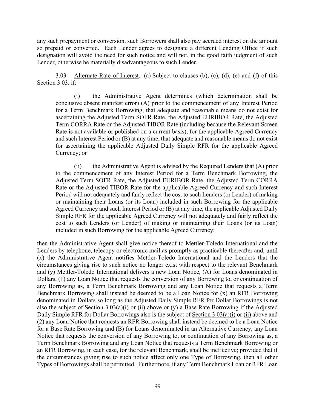 76 such Loan Notice in the case of a Term Benchmark Loan denominated in Dollars and (B) not later than the Applicable Time specified by the Administrative Agent, in the case of a Term Benchmark Loan or RFR Loan denominated in an Alternative Currency, in each case on the Business Day specified in the Loan Notice. The Administrative Agent shall remit the funds so received to the Swingline Lender in Dollars or the Alternative Currency so received, or if requested by the Swingline Lender, the equivalent amount thereof in the applicable Subsidiary Currency as determined by the applicable Swingline Lender at such time on the basis of the Spot Rate (determined as of the funding date) for the purchase of such Subsidiary Currency with the currency received through the Borrowing of the Term Benchmark Loans. (ii) If for any reason any Swingline Loan cannot be refinanced by such a Borrowing of Term Benchmark Loans in accordance with Section 2.04(e)(i), Mettler- Toledo International shall be deemed to have incurred from the applicable Swingline Lender a Revolving Loan in the amount of such Swingline Loan that is not so refinanced. The applicable Swingline Loan shall be deemed fully repaid upon the conversion thereof to a Revolving Loan. In such event, each Lender’s payment to the Administrative Agent for the account of the Swingline Lender pursuant to Section 2.04(e)(i) shall be deemed payment in respect of its participation in such Revolving Loan. Interest on each such Revolving Loan shall accrue at the Base Rate plus the Applicable Rate. (iii) No Lender shall be required to make a Loan pursuant to clause (i) above, or fund a risk participation pursuant to clause (ii) above, if the making of such Loan or the funding of such risk participation would, in the reasonable judgment of such Lender, violate any applicable law or would result in an adverse tax consequence which does not benefit from the gross-up provisions of Section 3.01 (any such potential violation of applicable law or adverse tax consequence to be communicated by any such Lender to the Administrative Agent as soon as possible after it is discovered), and no Non-Global Lender shall be required to make a Loan pursuant to clause (i) above or fund a risk participation pursuant to clause (ii) above. (iv) If, other than pursuant to clause (iii) above, any Lender fails to make available to the Administrative Agent for the account of the Swingline Lender any amount required to be paid by such Lender pursuant to the foregoing provisions of this Section 2.04(e) by the time specified in Section 2.04(e)(i), the Swingline Lender shall be entitled to recover from such Lender (acting through the Administrative Agent), on demand, such amount with interest thereon for the period from the date such payment is required to the date on which such payment is immediately available to the Swingline Lender at a rate per annum equal to the applicable Overnight Rate from time to time in effect. A certificate of the Swingline Lender submitted to any Lender (through the Administrative Agent) with respect to any amounts owing under this clause (iii) shall be conclusive absent manifest error. (v) Except as set forth in clause (iii) above, each Lender’s obligation to make Loans or to purchase and fund risk participations in Swingline Loans pursuant to this Section 2.04(e) shall be absolute and unconditional and shall not be affected by any circumstance, including (A) any set-off, counterclaim, recoupment, defense or other right
