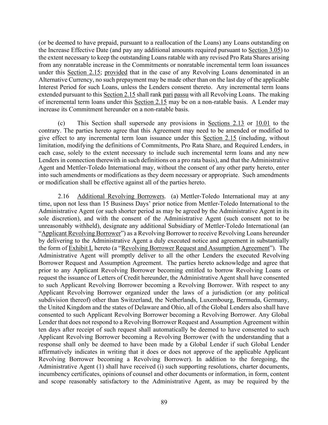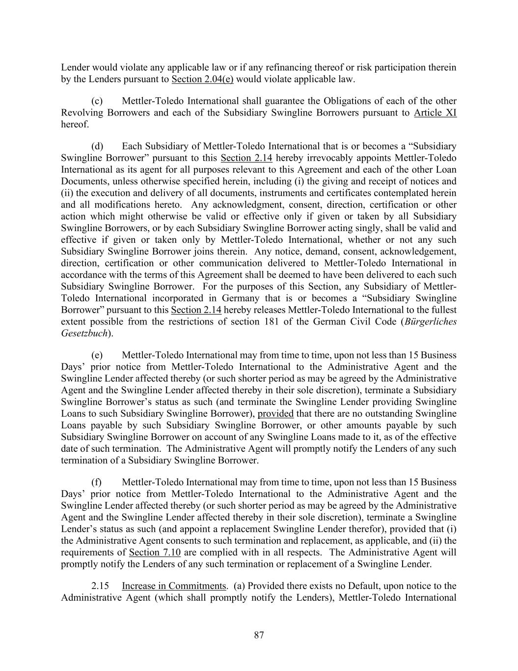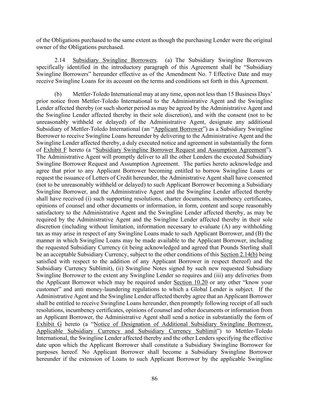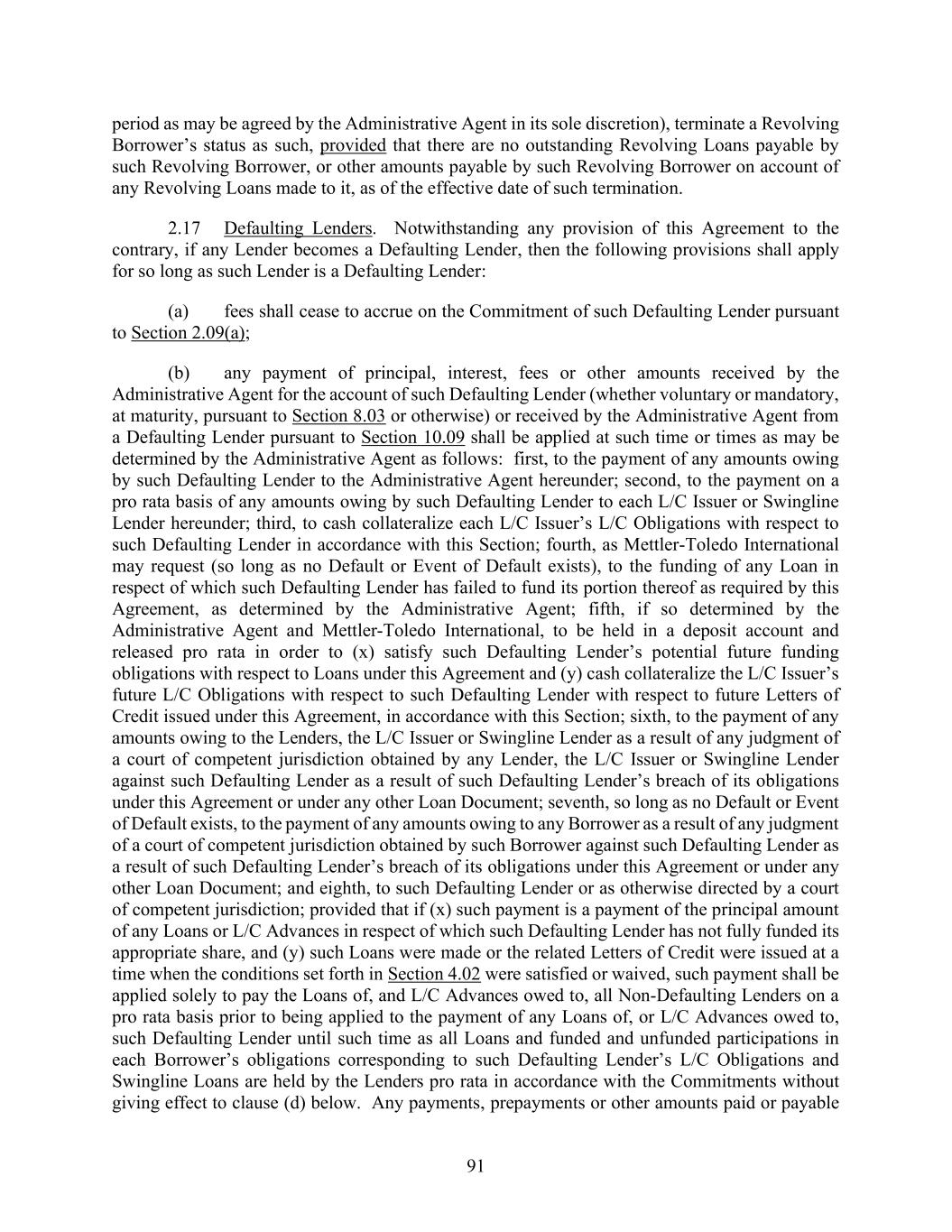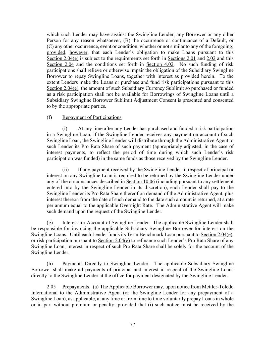 77 which such Lender may have against the Swingline Lender, any Borrower or any other Person for any reason whatsoever, (B) the occurrence or continuance of a Default, or (C) any other occurrence, event or condition, whether or not similar to any of the foregoing; provided, however, that each Lender’s obligation to make Loans pursuant to this Section 2.04(e) is subject to the requirements set forth in Sections 2.01 and 2.02 and this Section 2.04 and the conditions set forth in Section 4.02. No such funding of risk participations shall relieve or otherwise impair the obligation of the Subsidiary Swingline Borrower to repay Swingline Loans, together with interest as provided herein. To the extent Lenders make the Loans or purchase and fund risk participations pursuant to this Section 2.04(e), the amount of such Subsidiary Currency Sublimit so purchased or funded as a risk participation shall not be available for Borrowings of Swingline Loans until a Subsidiary Swingline Borrower Sublimit Adjustment Consent is presented and consented to by the appropriate parties. (f) Repayment of Participations. (i) At any time after any Lender has purchased and funded a risk participation in a Swingline Loan, if the Swingline Lender receives any payment on account of such Swingline Loan, the Swingline Lender will distribute through the Administrative Agent to such Lender its Pro Rata Share of such payment (appropriately adjusted, in the case of interest payments, to reflect the period of time during which such Lender’s risk participation was funded) in the same funds as those received by the Swingline Lender. (ii) If any payment received by the Swingline Lender in respect of principal or interest on any Swingline Loan is required to be returned by the Swingline Lender under any of the circumstances described in Section 10.06 (including pursuant to any settlement entered into by the Swingline Lender in its discretion), each Lender shall pay to the Swingline Lender its Pro Rata Share thereof on demand of the Administrative Agent, plus interest thereon from the date of such demand to the date such amount is returned, at a rate per annum equal to the applicable Overnight Rate. The Administrative Agent will make such demand upon the request of the Swingline Lender. (g) Interest for Account of Swingline Lender. The applicable Swingline Lender shall be responsible for invoicing the applicable Subsidiary Swingline Borrower for interest on the Swingline Loans. Until each Lender funds its Term Benchmark Loan pursuant to Section 2.04(e), or risk participation pursuant to Section 2.04(e) to refinance such Lender’s Pro Rata Share of any Swingline Loan, interest in respect of such Pro Rata Share shall be solely for the account of the Swingline Lender. (h) Payments Directly to Swingline Lender. The applicable Subsidiary Swingline Borrower shall make all payments of principal and interest in respect of the Swingline Loans directly to the Swingline Lender at the office for payment designated by the Swingline Lender. 2.05 Prepayments. (a) The Applicable Borrower may, upon notice from Mettler-Toledo International to the Administrative Agent (or the Swingline Lender for any prepayment of a Swingline Loan), as applicable, at any time or from time to time voluntarily prepay Loans in whole or in part without premium or penalty; provided that (i) such notice must be received by the
