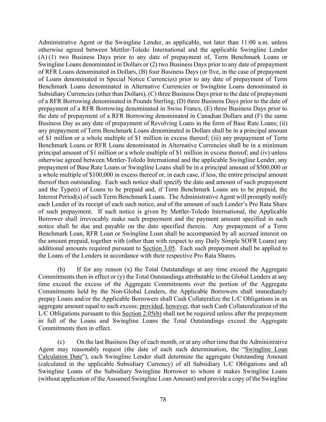 78 Administrative Agent or the Swingline Lender, as applicable, not later than 11:00 a.m. unless otherwise agreed between Mettler-Toledo International and the applicable Swingline Lender (A) (1) two Business Days prior to any date of prepayment of, Term Benchmark Loans or Swingline Loans denominated in Dollars or (2) two Business Days prior to any date of prepayment of RFR Loans denominated in Dollars, (B) four Business Days (or five, in the case of prepayment of Loans denominated in Special Notice Currencies) prior to any date of prepayment of Term Benchmark Loans denominated in Alternative Currencies or Swingline Loans denominated in Subsidiary Currencies (other than Dollars), (C) three Business Days prior to the date of prepayment of a RFR Borrowing denominated in Pounds Sterling, (D) three Business Days prior to the date of prepayment of a RFR Borrowing denominated in Swiss Francs, (E) three Business Days prior to the date of prepayment of a RFR Borrowing denominated in Canadian Dollars and (F) the same Business Day as any date of prepayment of Revolving Loans in the form of Base Rate Loans; (ii) any prepayment of Term Benchmark Loans denominated in Dollars shall be in a principal amount of $1 million or a whole multiple of $1 million in excess thereof; (iii) any prepayment of Term Benchmark Loans or RFR Loans denominated in Alternative Currencies shall be in a minimum principal amount of $1 million or a whole multiple of $1 million in excess thereof; and (iv) unless otherwise agreed between Mettler-Toledo International and the applicable Swingline Lender, any prepayment of Base Rate Loans or Swingline Loans shall be in a principal amount of $500,000 or a whole multiple of $100,000 in excess thereof or, in each case, if less, the entire principal amount thereof then outstanding. Each such notice shall specify the date and amount of such prepayment and the Type(s) of Loans to be prepaid and, if Term Benchmark Loans are to be prepaid, the Interest Period(s) of such Term Benchmark Loans. The Administrative Agent will promptly notify each Lender of its receipt of each such notice, and of the amount of such Lender’s Pro Rata Share of such prepayment. If such notice is given by Mettler-Toledo International, the Applicable Borrower shall irrevocably make such prepayment and the payment amount specified in such notice shall be due and payable on the date specified therein. Any prepayment of a Term Benchmark Loan, RFR Loan or Swingline Loan shall be accompanied by all accrued interest on the amount prepaid, together with (other than with respect to any Daily Simple SOFR Loans) any additional amounts required pursuant to Section 3.05. Each such prepayment shall be applied to the Loans of the Lenders in accordance with their respective Pro Rata Shares. (b) If for any reason (x) the Total Outstandings at any time exceed the Aggregate Commitments then in effect or (y) the Total Outstandings attributable to the Global Lenders at any time exceed the excess of the Aggregate Commitments over the portion of the Aggregate Commitments held by the Non-Global Lenders, the Applicable Borrowers shall immediately prepay Loans and/or the Applicable Borrowers shall Cash Collateralize the L/C Obligations in an aggregate amount equal to such excess; provided, however, that such Cash Collateralization of the L/C Obligations pursuant to this Section 2.05(b) shall not be required unless after the prepayment in full of the Loans and Swingline Loans the Total Outstandings exceed the Aggregate Commitments then in effect. (c) On the last Business Day of each month, or at any other time that the Administrative Agent may reasonably request (the date of each such determination, the “Swingline Loan Calculation Date”), each Swingline Lender shall determine the aggregate Outstanding Amount (calculated in the applicable Subsidiary Currency) of all Subsidiary L/C Obligations and all Swingline Loans of the Subsidiary Swingline Borrower to whom it makes Swingline Loans (without application of the Assumed Swingline Loan Amount) and provide a copy of the Swingline
