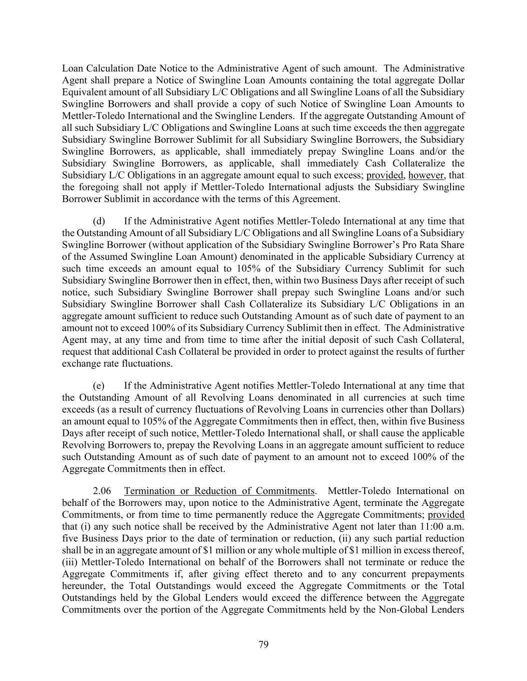 79 Loan Calculation Date Notice to the Administrative Agent of such amount. The Administrative Agent shall prepare a Notice of Swingline Loan Amounts containing the total aggregate Dollar Equivalent amount of all Subsidiary L/C Obligations and all Swingline Loans of all the Subsidiary Swingline Borrowers and shall provide a copy of such Notice of Swingline Loan Amounts to Mettler-Toledo International and the Swingline Lenders. If the aggregate Outstanding Amount of all such Subsidiary L/C Obligations and Swingline Loans at such time exceeds the then aggregate Subsidiary Swingline Borrower Sublimit for all Subsidiary Swingline Borrowers, the Subsidiary Swingline Borrowers, as applicable, shall immediately prepay Swingline Loans and/or the Subsidiary Swingline Borrowers, as applicable, shall immediately Cash Collateralize the Subsidiary L/C Obligations in an aggregate amount equal to such excess; provided, however, that the foregoing shall not apply if Mettler-Toledo International adjusts the Subsidiary Swingline Borrower Sublimit in accordance with the terms of this Agreement. (d) If the Administrative Agent notifies Mettler-Toledo International at any time that the Outstanding Amount of all Subsidiary L/C Obligations and all Swingline Loans of a Subsidiary Swingline Borrower (without application of the Subsidiary Swingline Borrower’s Pro Rata Share of the Assumed Swingline Loan Amount) denominated in the applicable Subsidiary Currency at such time exceeds an amount equal to 105% of the Subsidiary Currency Sublimit for such Subsidiary Swingline Borrower then in effect, then, within two Business Days after receipt of such notice, such Subsidiary Swingline Borrower shall prepay such Swingline Loans and/or such Subsidiary Swingline Borrower shall Cash Collateralize its Subsidiary L/C Obligations in an aggregate amount sufficient to reduce such Outstanding Amount as of such date of payment to an amount not to exceed 100% of its Subsidiary Currency Sublimit then in effect. The Administrative Agent may, at any time and from time to time after the initial deposit of such Cash Collateral, request that additional Cash Collateral be provided in order to protect against the results of further exchange rate fluctuations. (e) If the Administrative Agent notifies Mettler-Toledo International at any time that the Outstanding Amount of all Revolving Loans denominated in all currencies at such time exceeds (as a result of currency fluctuations of Revolving Loans in currencies other than Dollars) an amount equal to 105% of the Aggregate Commitments then in effect, then, within five Business Days after receipt of such notice, Mettler-Toledo International shall, or shall cause the applicable Revolving Borrowers to, prepay the Revolving Loans in an aggregate amount sufficient to reduce such Outstanding Amount as of such date of payment to an amount not to exceed 100% of the Aggregate Commitments then in effect. 2.06 Termination or Reduction of Commitments. Mettler-Toledo International on behalf of the Borrowers may, upon notice to the Administrative Agent, terminate the Aggregate Commitments, or from time to time permanently reduce the Aggregate Commitments; provided that (i) any such notice shall be received by the Administrative Agent not later than 11:00 a.m. five Business Days prior to the date of termination or reduction, (ii) any such partial reduction shall be in an aggregate amount of $1 million or any whole multiple of $1 million in excess thereof, (iii) Mettler-Toledo International on behalf of the Borrowers shall not terminate or reduce the Aggregate Commitments if, after giving effect thereto and to any concurrent prepayments hereunder, the Total Outstandings would exceed the Aggregate Commitments or the Total Outstandings held by the Global Lenders would exceed the difference between the Aggregate Commitments over the portion of the Aggregate Commitments held by the Non-Global Lenders
