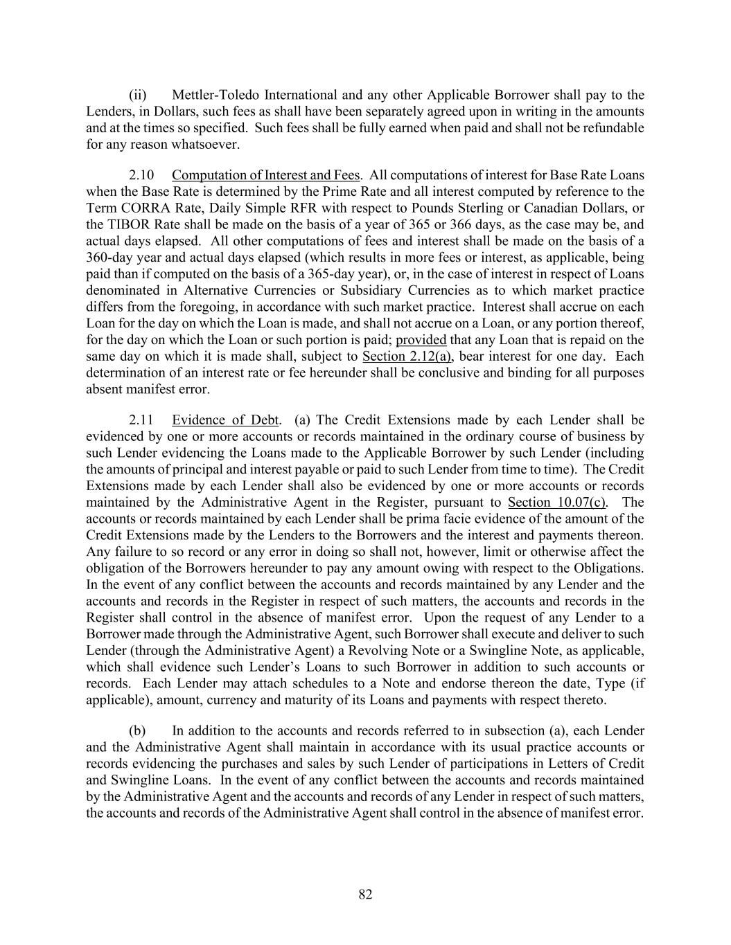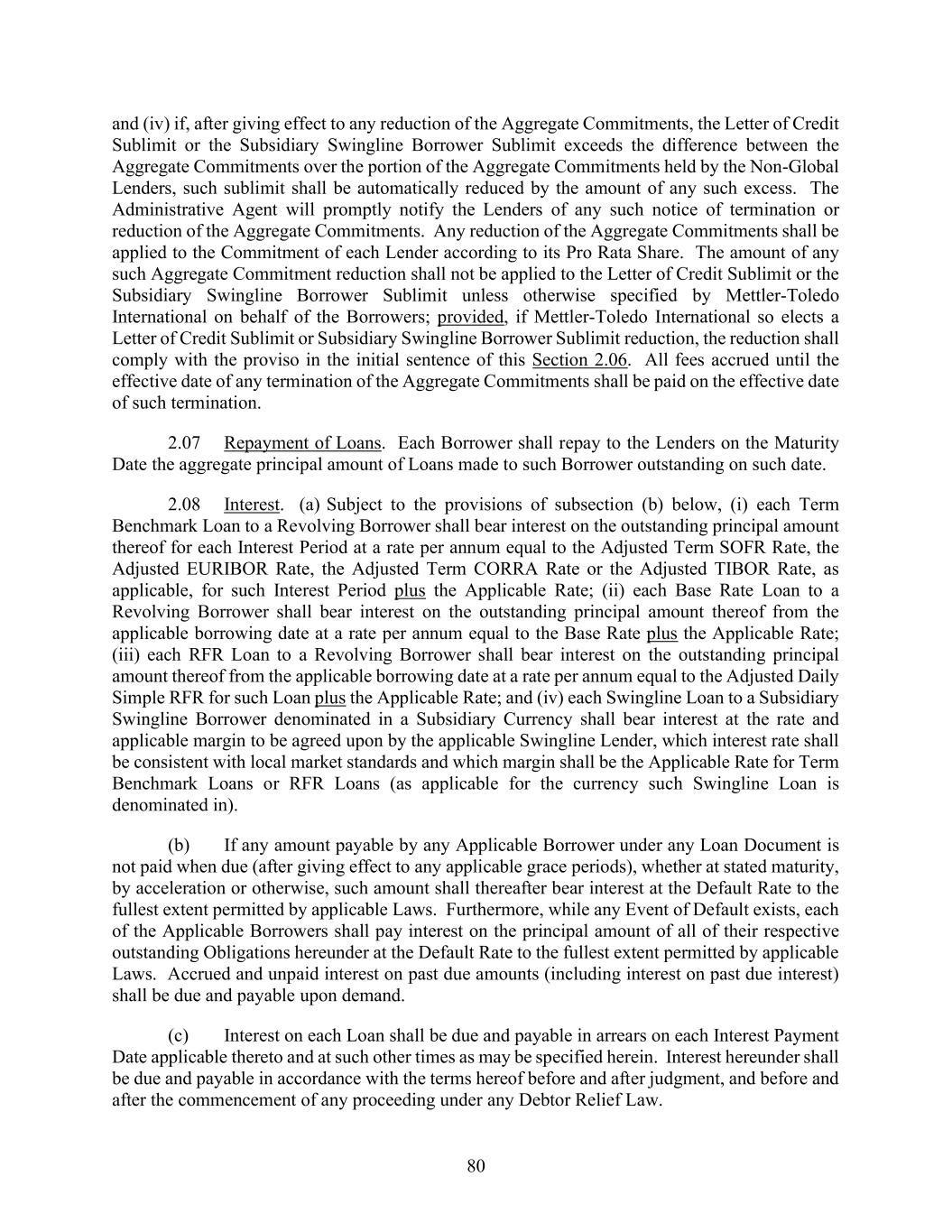 80 and (iv) if, after giving effect to any reduction of the Aggregate Commitments, the Letter of Credit Sublimit or the Subsidiary Swingline Borrower Sublimit exceeds the difference between the Aggregate Commitments over the portion of the Aggregate Commitments held by the Non-Global Lenders, such sublimit shall be automatically reduced by the amount of any such excess. The Administrative Agent will promptly notify the Lenders of any such notice of termination or reduction of the Aggregate Commitments. Any reduction of the Aggregate Commitments shall be applied to the Commitment of each Lender according to its Pro Rata Share. The amount of any such Aggregate Commitment reduction shall not be applied to the Letter of Credit Sublimit or the Subsidiary Swingline Borrower Sublimit unless otherwise specified by Mettler-Toledo International on behalf of the Borrowers; provided, if Mettler-Toledo International so elects a Letter of Credit Sublimit or Subsidiary Swingline Borrower Sublimit reduction, the reduction shall comply with the proviso in the initial sentence of this Section 2.06. All fees accrued until the effective date of any termination of the Aggregate Commitments shall be paid on the effective date of such termination. 2.07 Repayment of Loans. Each Borrower shall repay to the Lenders on the Maturity Date the aggregate principal amount of Loans made to such Borrower outstanding on such date. 2.08 Interest. (a) Subject to the provisions of subsection (b) below, (i) each Term Benchmark Loan to a Revolving Borrower shall bear interest on the outstanding principal amount thereof for each Interest Period at a rate per annum equal to the Adjusted Term SOFR Rate, the Adjusted EURIBOR Rate, the Adjusted Term CORRA Rate or the Adjusted TIBOR Rate, as applicable, for such Interest Period plus the Applicable Rate; (ii) each Base Rate Loan to a Revolving Borrower shall bear interest on the outstanding principal amount thereof from the applicable borrowing date at a rate per annum equal to the Base Rate plus the Applicable Rate; (iii) each RFR Loan to a Revolving Borrower shall bear interest on the outstanding principal amount thereof from the applicable borrowing date at a rate per annum equal to the Adjusted Daily Simple RFR for such Loan plus the Applicable Rate; and (iv) each Swingline Loan to a Subsidiary Swingline Borrower denominated in a Subsidiary Currency shall bear interest at the rate and applicable margin to be agreed upon by the applicable Swingline Lender, which interest rate shall be consistent with local market standards and which margin shall be the Applicable Rate for Term Benchmark Loans or RFR Loans (as applicable for the currency such Swingline Loan is denominated in). (b) If any amount payable by any Applicable Borrower under any Loan Document is not paid when due (after giving effect to any applicable grace periods), whether at stated maturity, by acceleration or otherwise, such amount shall thereafter bear interest at the Default Rate to the fullest extent permitted by applicable Laws. Furthermore, while any Event of Default exists, each of the Applicable Borrowers shall pay interest on the principal amount of all of their respective outstanding Obligations hereunder at the Default Rate to the fullest extent permitted by applicable Laws. Accrued and unpaid interest on past due amounts (including interest on past due interest) shall be due and payable upon demand. (c) Interest on each Loan shall be due and payable in arrears on each Interest Payment Date applicable thereto and at such other times as may be specified herein. Interest hereunder shall be due and payable in accordance with the terms hereof before and after judgment, and before and after the commencement of any proceeding under any Debtor Relief Law.