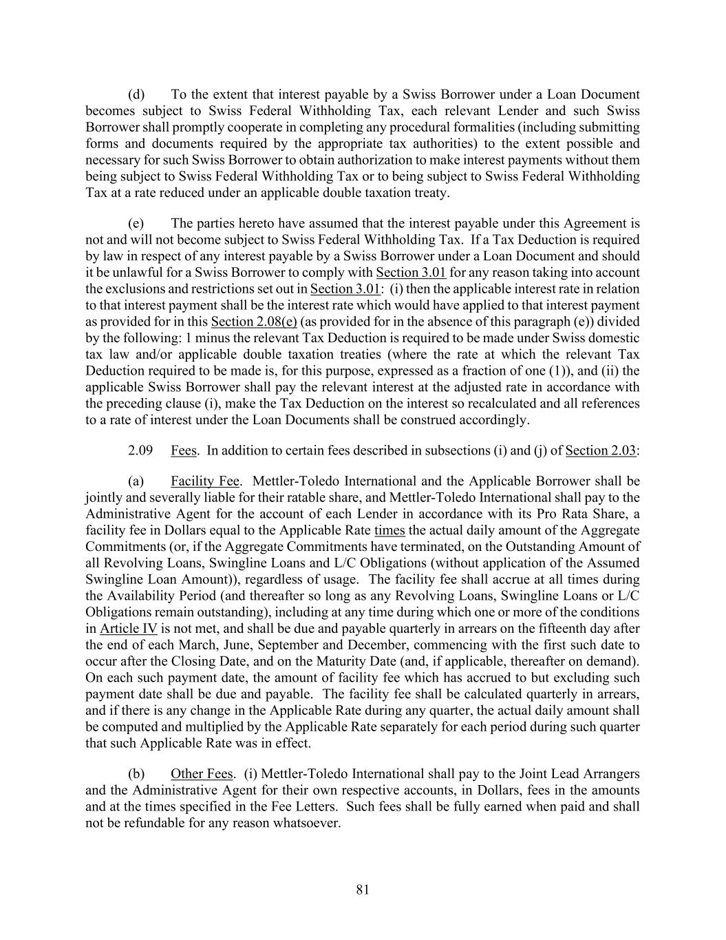 81 (d) To the extent that interest payable by a Swiss Borrower under a Loan Document becomes subject to Swiss Federal Withholding Tax, each relevant Lender and such Swiss Borrower shall promptly cooperate in completing any procedural formalities (including submitting forms and documents required by the appropriate tax authorities) to the extent possible and necessary for such Swiss Borrower to obtain authorization to make interest payments without them being subject to Swiss Federal Withholding Tax or to being subject to Swiss Federal Withholding Tax at a rate reduced under an applicable double taxation treaty. (e) The parties hereto have assumed that the interest payable under this Agreement is not and will not become subject to Swiss Federal Withholding Tax. If a Tax Deduction is required by law in respect of any interest payable by a Swiss Borrower under a Loan Document and should it be unlawful for a Swiss Borrower to comply with Section 3.01 for any reason taking into account the exclusions and restrictions set out in Section 3.01: (i) then the applicable interest rate in relation to that interest payment shall be the interest rate which would have applied to that interest payment as provided for in this Section 2.08(e) (as provided for in the absence of this paragraph (e)) divided by the following: 1 minus the relevant Tax Deduction is required to be made under Swiss domestic tax law and/or applicable double taxation treaties (where the rate at which the relevant Tax Deduction required to be made is, for this purpose, expressed as a fraction of one (1)), and (ii) the applicable Swiss Borrower shall pay the relevant interest at the adjusted rate in accordance with the preceding clause (i), make the Tax Deduction on the interest so recalculated and all references to a rate of interest under the Loan Documents shall be construed accordingly. 2.09 Fees. In addition to certain fees described in subsections (i) and (j) of Section 2.03: (a) Facility Fee. Mettler-Toledo International and the Applicable Borrower shall be jointly and severally liable for their ratable share, and Mettler-Toledo International shall pay to the Administrative Agent for the account of each Lender in accordance with its Pro Rata Share, a facility fee in Dollars equal to the Applicable Rate times the actual daily amount of the Aggregate Commitments (or, if the Aggregate Commitments have terminated, on the Outstanding Amount of all Revolving Loans, Swingline Loans and L/C Obligations (without application of the Assumed Swingline Loan Amount)), regardless of usage. The facility fee shall accrue at all times during the Availability Period (and thereafter so long as any Revolving Loans, Swingline Loans or L/C Obligations remain outstanding), including at any time during which one or more of the conditions in Article IV is not met, and shall be due and payable quarterly in arrears on the fifteenth day after the end of each March, June, September and December, commencing with the first such date to occur after the Closing Date, and on the Maturity Date (and, if applicable, thereafter on demand). On each such payment date, the amount of facility fee which has accrued to but excluding such payment date shall be due and payable. The facility fee shall be calculated quarterly in arrears, and if there is any change in the Applicable Rate during any quarter, the actual daily amount shall be computed and multiplied by the Applicable Rate separately for each period during such quarter that such Applicable Rate was in effect. (b) Other Fees. (i) Mettler-Toledo International shall pay to the Joint Lead Arrangers and the Administrative Agent for their own respective accounts, in Dollars, fees in the amounts and at the times specified in the Fee Letters. Such fees shall be fully earned when paid and shall not be refundable for any reason whatsoever.