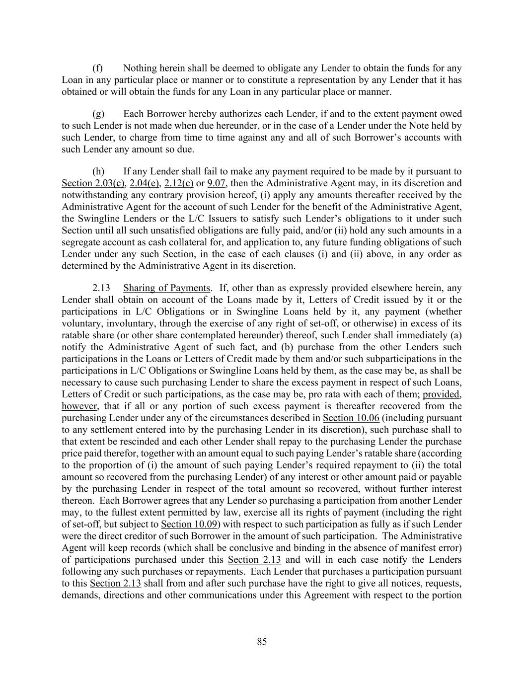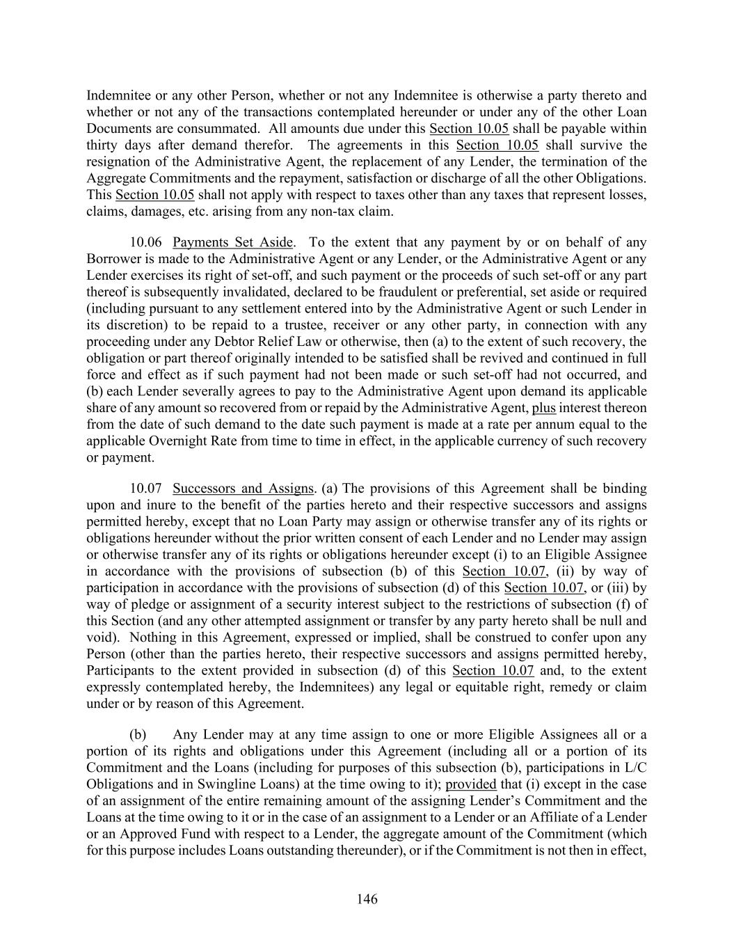 146 Indemnitee or any other Person, whether or not any Indemnitee is otherwise a party thereto and whether or not any of the transactions contemplated hereunder or under any of the other Loan Documents are consummated. All amounts due under this Section 10.05 shall be payable within thirty days after demand therefor. The agreements in this Section 10.05 shall survive the resignation of the Administrative Agent, the replacement of any Lender, the termination of the Aggregate Commitments and the repayment, satisfaction or discharge of all the other Obligations. This Section 10.05 shall not apply with respect to taxes other than any taxes that represent losses, claims, damages, etc. arising from any non-tax claim. 10.06 Payments Set Aside. To the extent that any payment by or on behalf of any Borrower is made to the Administrative Agent or any Lender, or the Administrative Agent or any Lender exercises its right of set-off, and such payment or the proceeds of such set-off or any part thereof is subsequently invalidated, declared to be fraudulent or preferential, set aside or required (including pursuant to any settlement entered into by the Administrative Agent or such Lender in its discretion) to be repaid to a trustee, receiver or any other party, in connection with any proceeding under any Debtor Relief Law or otherwise, then (a) to the extent of such recovery, the obligation or part thereof originally intended to be satisfied shall be revived and continued in full force and effect as if such payment had not been made or such set-off had not occurred, and (b) each Lender severally agrees to pay to the Administrative Agent upon demand its applicable share of any amount so recovered from or repaid by the Administrative Agent, plus interest thereon from the date of such demand to the date such payment is made at a rate per annum equal to the applicable Overnight Rate from time to time in effect, in the applicable currency of such recovery or payment. 10.07 Successors and Assigns. (a) The provisions of this Agreement shall be binding upon and inure to the benefit of the parties hereto and their respective successors and assigns permitted hereby, except that no Loan Party may assign or otherwise transfer any of its rights or obligations hereunder without the prior written consent of each Lender and no Lender may assign or otherwise transfer any of its rights or obligations hereunder except (i) to an Eligible Assignee in accordance with the provisions of subsection (b) of this Section 10.07, (ii) by way of participation in accordance with the provisions of subsection (d) of this Section 10.07, or (iii) by way of pledge or assignment of a security interest subject to the restrictions of subsection (f) of this Section (and any other attempted assignment or transfer by any party hereto shall be null and void). Nothing in this Agreement, expressed or implied, shall be construed to confer upon any Person (other than the parties hereto, their respective successors and assigns permitted hereby, Participants to the extent provided in subsection (d) of this Section 10.07 and, to the extent expressly contemplated hereby, the Indemnitees) any legal or equitable right, remedy or claim under or by reason of this Agreement. (b) Any Lender may at any time assign to one or more Eligible Assignees all or a portion of its rights and obligations under this Agreement (including all or a portion of its Commitment and the Loans (including for purposes of this subsection (b), participations in L/C Obligations and in Swingline Loans) at the time owing to it); provided that (i) except in the case of an assignment of the entire remaining amount of the assigning Lender’s Commitment and the Loans at the time owing to it or in the case of an assignment to a Lender or an Affiliate of a Lender or an Approved Fund with respect to a Lender, the aggregate amount of the Commitment (which for this purpose includes Loans outstanding thereunder), or if the Commitment is not then in effect,