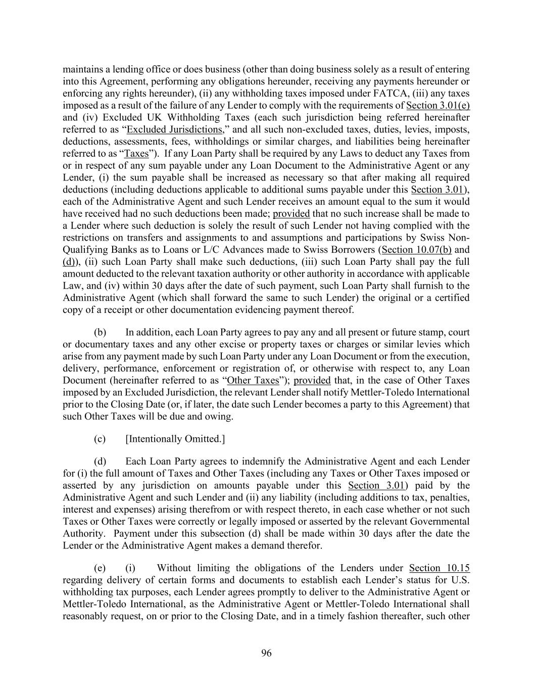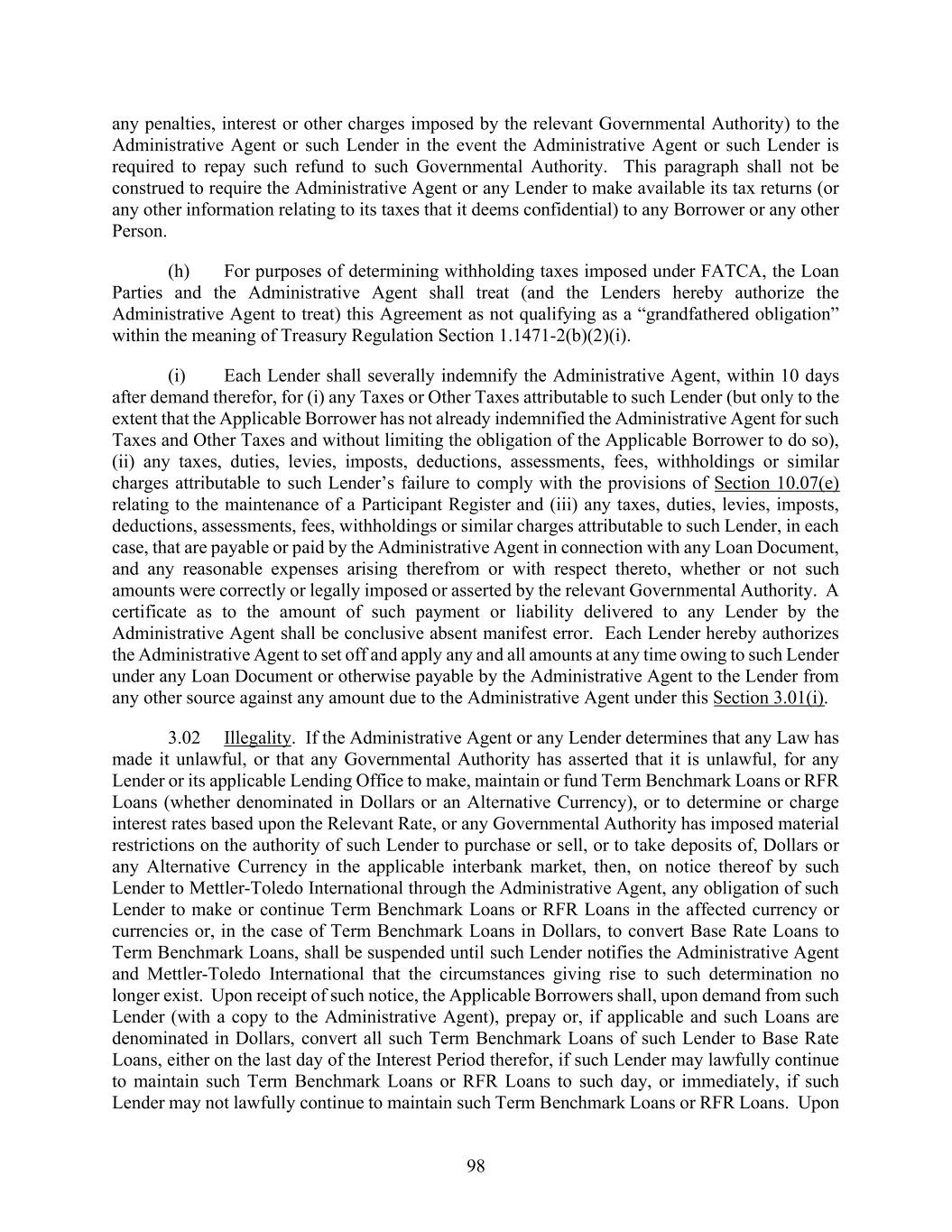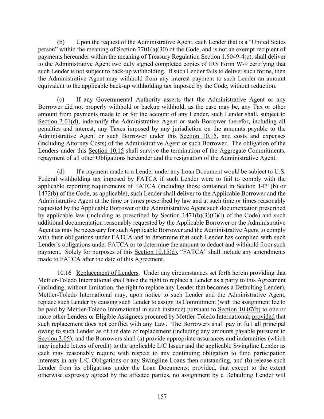 157 (b) Upon the request of the Administrative Agent, each Lender that is a “United States person” within the meaning of Section 7701(a)(30) of the Code, and is not an exempt recipient of payments hereunder within the meaning of Treasury Regulation Section 1.6049-4(c), shall deliver to the Administrative Agent two duly signed completed copies of IRS Form W-9 certifying that such Lender is not subject to back-up withholding. If such Lender fails to deliver such forms, then the Administrative Agent may withhold from any interest payment to such Lender an amount equivalent to the applicable back-up withholding tax imposed by the Code, without reduction. (c) If any Governmental Authority asserts that the Administrative Agent or any Borrower did not properly withhold or backup withhold, as the case may be, any Tax or other amount from payments made to or for the account of any Lender, such Lender shall, subject to Section 3.01(d), indemnify the Administrative Agent or such Borrower therefor, including all penalties and interest, any Taxes imposed by any jurisdiction on the amounts payable to the Administrative Agent or such Borrower under this Section 10.15, and costs and expenses (including Attorney Costs) of the Administrative Agent or such Borrower. The obligation of the Lenders under this Section 10.15 shall survive the termination of the Aggregate Commitments, repayment of all other Obligations hereunder and the resignation of the Administrative Agent. (d) If a payment made to a Lender under any Loan Document would be subject to U.S. Federal withholding tax imposed by FATCA if such Lender were to fail to comply with the applicable reporting requirements of FATCA (including those contained in Section 1471(b) or 1472(b) of the Code, as applicable), such Lender shall deliver to the Applicable Borrower and the Administrative Agent at the time or times prescribed by law and at such time or times reasonably requested by the Applicable Borrower or the Administrative Agent such documentation prescribed by applicable law (including as prescribed by Section 1471(b)(3)(C)(i) of the Code) and such additional documentation reasonably requested by the Applicable Borrower or the Administrative Agent as may be necessary for such Applicable Borrower and the Administrative Agent to comply with their obligations under FATCA and to determine that such Lender has complied with such Lender’s obligations under FATCA or to determine the amount to deduct and withhold from such payment. Solely for purposes of this Section 10.15(d), “FATCA” shall include any amendments made to FATCA after the date of this Agreement. 10.16 Replacement of Lenders. Under any circumstances set forth herein providing that Mettler-Toledo International shall have the right to replace a Lender as a party to this Agreement (including, without limitation, the right to replace any Lender that becomes a Defaulting Lender), Mettler-Toledo International may, upon notice to such Lender and the Administrative Agent, replace such Lender by causing such Lender to assign its Commitment (with the assignment fee to be paid by Mettler-Toledo International in such instance) pursuant to Section 10.07(b) to one or more other Lenders or Eligible Assignees procured by Mettler-Toledo International; provided that such replacement does not conflict with any Law. The Borrowers shall pay in full all principal owing to such Lender as of the date of replacement (including any amounts payable pursuant to Section 3.05); and the Borrowers shall (a) provide appropriate assurances and indemnities (which may include letters of credit) to the applicable L/C Issuer and the applicable Swingline Lender as each may reasonably require with respect to any continuing obligation to fund participation interests in any L/C Obligations or any Swingline Loans then outstanding, and (b) release such Lender from its obligations under the Loan Documents; provided, that except to the extent otherwise expressly agreed by the affected parties, no assignment by a Defaulting Lender will
