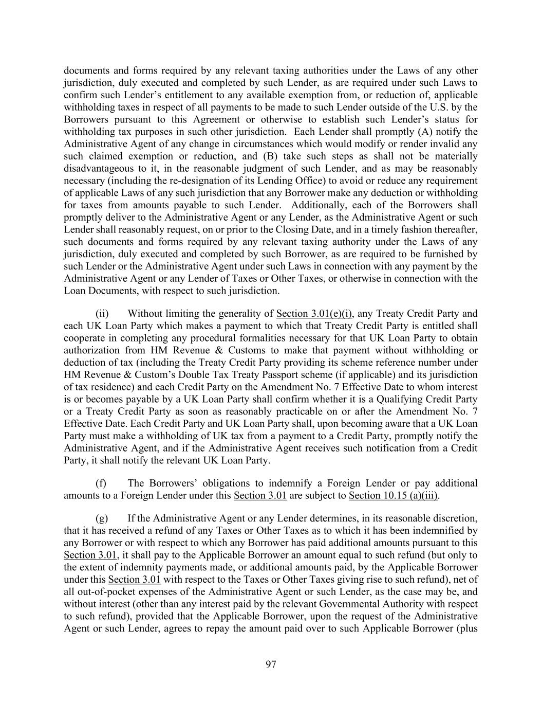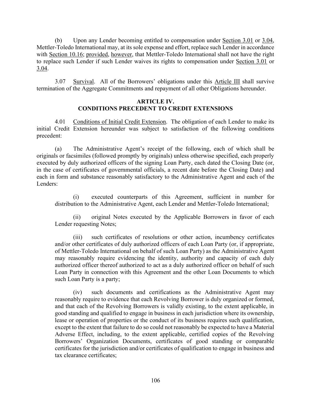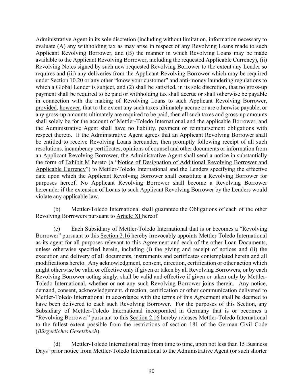 157 (b) Upon the request of the Administrative Agent, each Lender that is a “United States person” within the meaning of Section 7701(a)(30) of the Code, and is not an exempt recipient of payments hereunder within the meaning of Treasury Regulation Section 1.6049-4(c), shall deliver to the Administrative Agent two duly signed completed copies of IRS Form W-9 certifying that such Lender is not subject to back-up withholding. If such Lender fails to deliver such forms, then the Administrative Agent may withhold from any interest payment to such Lender an amount equivalent to the applicable back-up withholding tax imposed by the Code, without reduction. (c) If any Governmental Authority asserts that the Administrative Agent or any Borrower did not properly withhold or backup withhold, as the case may be, any Tax or other amount from payments made to or for the account of any Lender, such Lender shall, subject to Section 3.01(d), indemnify the Administrative Agent or such Borrower therefor, including all penalties and interest, any Taxes imposed by any jurisdiction on the amounts payable to the Administrative Agent or such Borrower under this Section 10.15, and costs and expenses (including Attorney Costs) of the Administrative Agent or such Borrower. The obligation of the Lenders under this Section 10.15 shall survive the termination of the Aggregate Commitments, repayment of all other Obligations hereunder and the resignation of the Administrative Agent. (d) If a payment made to a Lender under any Loan Document would be subject to U.S. Federal withholding tax imposed by FATCA if such Lender were to fail to comply with the applicable reporting requirements of FATCA (including those contained in Section 1471(b) or 1472(b) of the Code, as applicable), such Lender shall deliver to the Applicable Borrower and the Administrative Agent at the time or times prescribed by law and at such time or times reasonably requested by the Applicable Borrower or the Administrative Agent such documentation prescribed by applicable law (including as prescribed by Section 1471(b)(3)(C)(i) of the Code) and such additional documentation reasonably requested by the Applicable Borrower or the Administrative Agent as may be necessary for such Applicable Borrower and the Administrative Agent to comply with their obligations under FATCA and to determine that such Lender has complied with such Lender’s obligations under FATCA or to determine the amount to deduct and withhold from such payment. Solely for purposes of this Section 10.15(d), “FATCA” shall include any amendments made to FATCA after the date of this Agreement. 10.16 Replacement of Lenders. Under any circumstances set forth herein providing that Mettler-Toledo International shall have the right to replace a Lender as a party to this Agreement (including, without limitation, the right to replace any Lender that becomes a Defaulting Lender), Mettler-Toledo International may, upon notice to such Lender and the Administrative Agent, replace such Lender by causing such Lender to assign its Commitment (with the assignment fee to be paid by Mettler-Toledo International in such instance) pursuant to Section 10.07(b) to one or more other Lenders or Eligible Assignees procured by Mettler-Toledo International; provided that such replacement does not conflict with any Law. The Borrowers shall pay in full all principal owing to such Lender as of the date of replacement (including any amounts payable pursuant to Section 3.05); and the Borrowers shall (a) provide appropriate assurances and indemnities (which may include letters of credit) to the applicable L/C Issuer and the applicable Swingline Lender as each may reasonably require with respect to any continuing obligation to fund participation interests in any L/C Obligations or any Swingline Loans then outstanding, and (b) release such Lender from its obligations under the Loan Documents; provided, that except to the extent otherwise expressly agreed by the affected parties, no assignment by a Defaulting Lender will