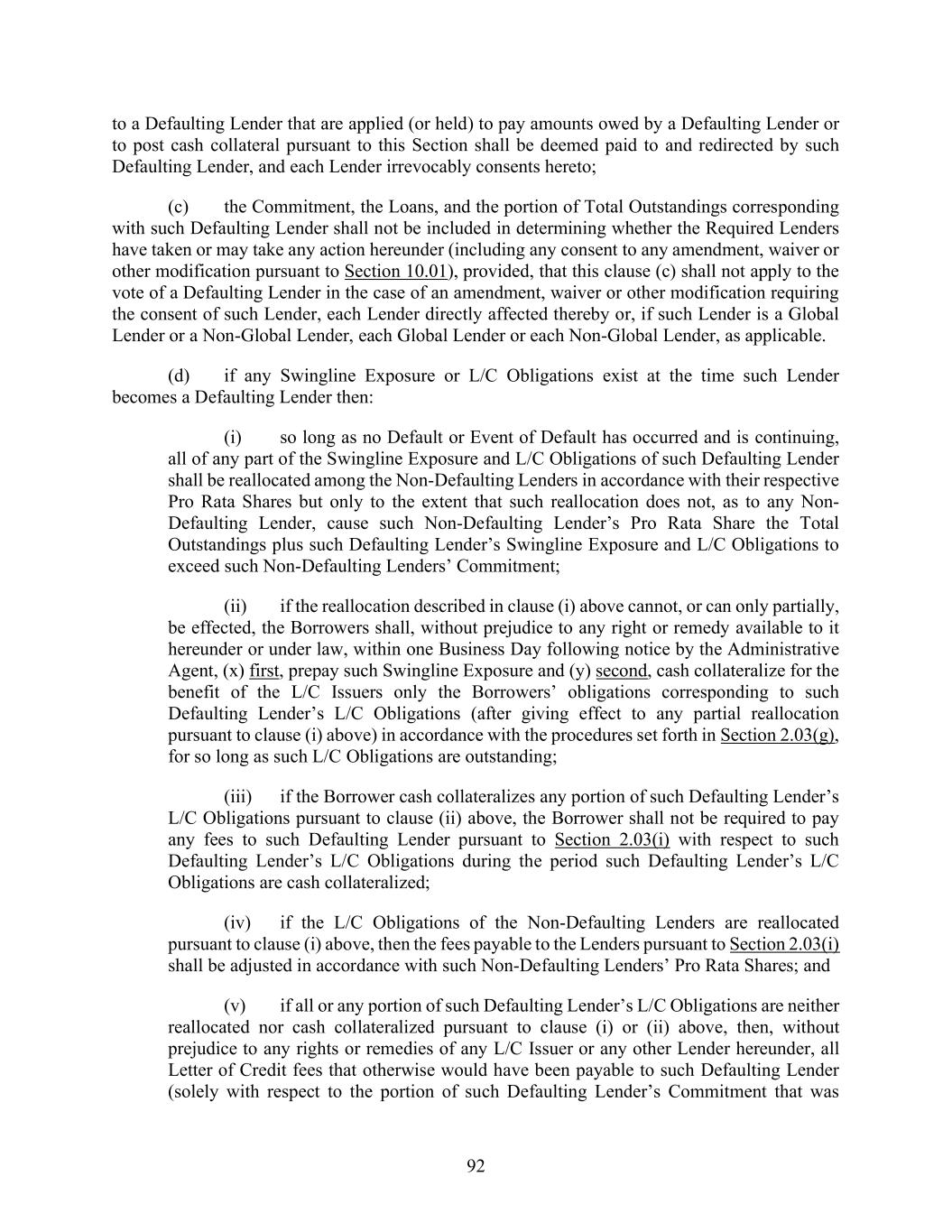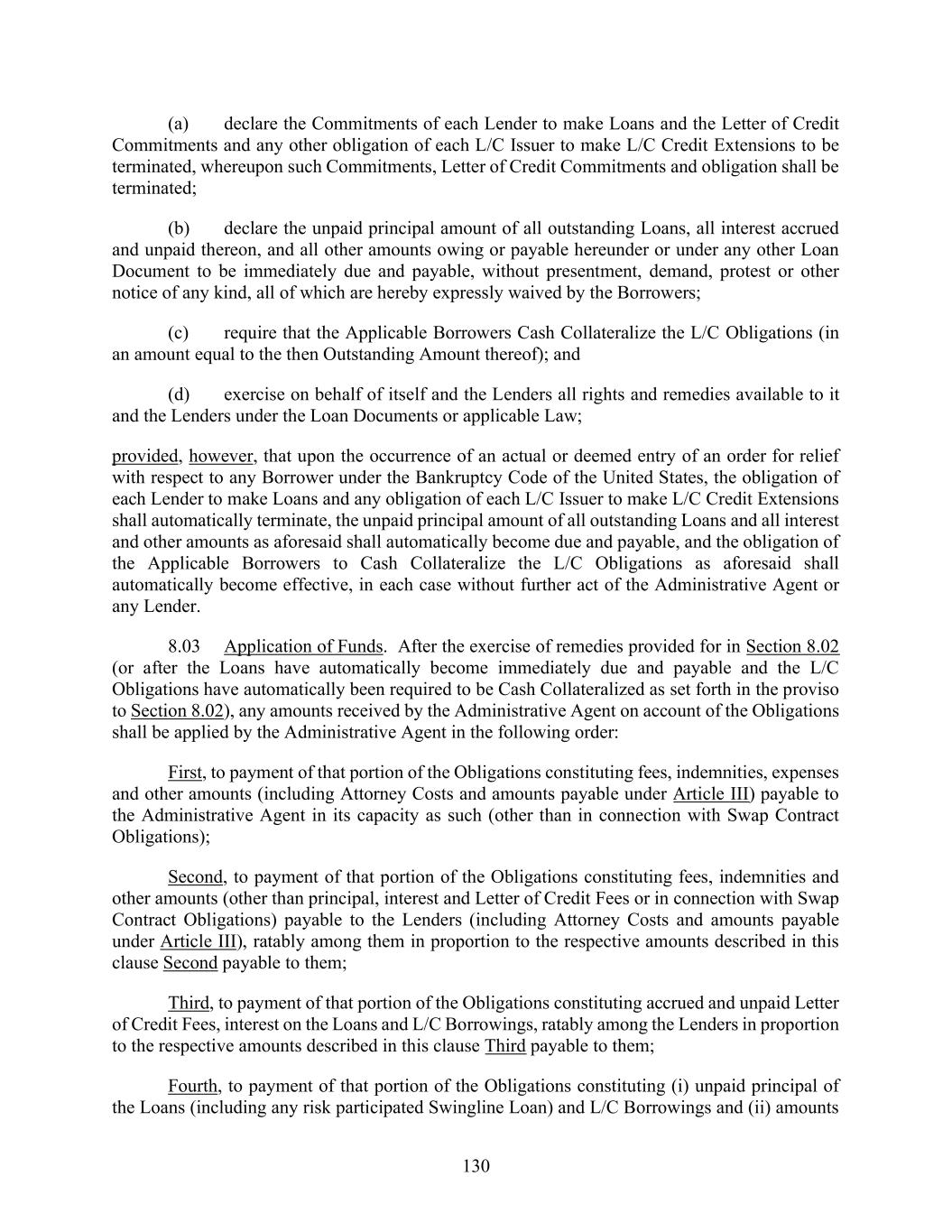 130 (a) declare the Commitments of each Lender to make Loans and the Letter of Credit Commitments and any other obligation of each L/C Issuer to make L/C Credit Extensions to be terminated, whereupon such Commitments, Letter of Credit Commitments and obligation shall be terminated; (b) declare the unpaid principal amount of all outstanding Loans, all interest accrued and unpaid thereon, and all other amounts owing or payable hereunder or under any other Loan Document to be immediately due and payable, without presentment, demand, protest or other notice of any kind, all of which are hereby expressly waived by the Borrowers; (c) require that the Applicable Borrowers Cash Collateralize the L/C Obligations (in an amount equal to the then Outstanding Amount thereof); and (d) exercise on behalf of itself and the Lenders all rights and remedies available to it and the Lenders under the Loan Documents or applicable Law; provided, however, that upon the occurrence of an actual or deemed entry of an order for relief with respect to any Borrower under the Bankruptcy Code of the United States, the obligation of each Lender to make Loans and any obligation of each L/C Issuer to make L/C Credit Extensions shall automatically terminate, the unpaid principal amount of all outstanding Loans and all interest and other amounts as aforesaid shall automatically become due and payable, and the obligation of the Applicable Borrowers to Cash Collateralize the L/C Obligations as aforesaid shall automatically become effective, in each case without further act of the Administrative Agent or any Lender. 8.03 Application of Funds. After the exercise of remedies provided for in Section 8.02 (or after the Loans have automatically become immediately due and payable and the L/C Obligations have automatically been required to be Cash Collateralized as set forth in the proviso to Section 8.02), any amounts received by the Administrative Agent on account of the Obligations shall be applied by the Administrative Agent in the following order: First, to payment of that portion of the Obligations constituting fees, indemnities, expenses and other amounts (including Attorney Costs and amounts payable under Article III) payable to the Administrative Agent in its capacity as such (other than in connection with Swap Contract Obligations); Second, to payment of that portion of the Obligations constituting fees, indemnities and other amounts (other than principal, interest and Letter of Credit Fees or in connection with Swap Contract Obligations) payable to the Lenders (including Attorney Costs and amounts payable under Article III), ratably among them in proportion to the respective amounts described in this clause Second payable to them; Third, to payment of that portion of the Obligations constituting accrued and unpaid Letter of Credit Fees, interest on the Loans and L/C Borrowings, ratably among the Lenders in proportion to the respective amounts described in this clause Third payable to them; Fourth, to payment of that portion of the Obligations constituting (i) unpaid principal of the Loans (including any risk participated Swingline Loan) and L/C Borrowings and (ii) amounts