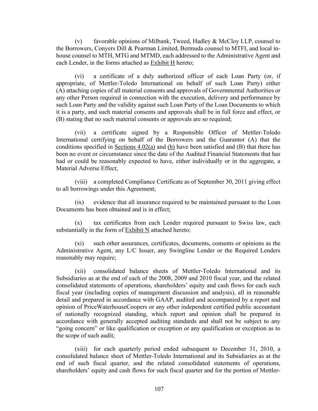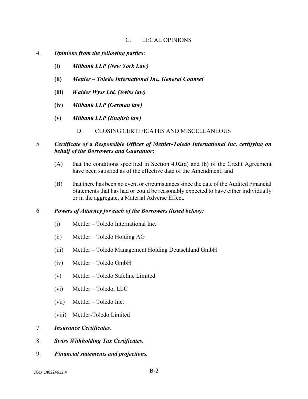 DB1/ 146224612.4 B-2 C. LEGAL OPINIONS 4. Opinions from the following parties: (i) Milbank LLP (New York Law) (ii) Mettler – Toledo International Inc. General Counsel (iii) Walder Wyss Ltd. (Swiss law) (iv) Milbank LLP (German law) (v) Milbank LLP (English law) D. CLOSING CERTIFICATES AND MISCELLANEOUS 5. Certificate of a Responsible Officer of Mettler-Toledo International Inc. certifying on behalf of the Borrowers and Guarantor: (A) that the conditions specified in Section 4.02(a) and (b) of the Credit Agreement have been satisfied as of the effective date of the Amendment; and (B) that there has been no event or circumstances since the date of the Audited Financial Statements that has had or could be reasonably expected to have either individually or in the aggregate, a Material Adverse Effect. 6. Powers of Attorney for each of the Borrowers (listed below): (i) Mettler – Toledo International Inc. (ii) Mettler – Toledo Holding AG (iii) Mettler – Toledo Management Holding Deutschland GmbH (iv) Mettler – Toledo GmbH (v) Mettler – Toledo Safeline Limited (vi) Mettler – Toledo, LLC (vii) Mettler – Toledo Inc. (viii) Mettler-Toledo Limited 7. Insurance Certificates. 8. Swiss Withholding Tax Certificates. 9. Financial statements and projections.
