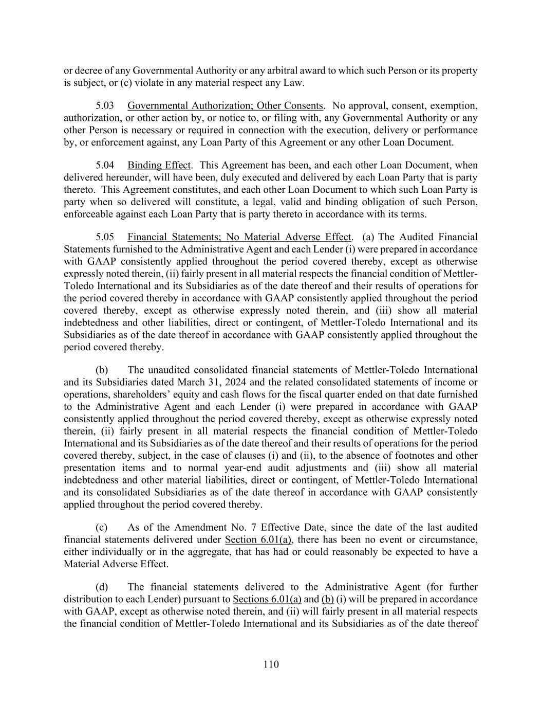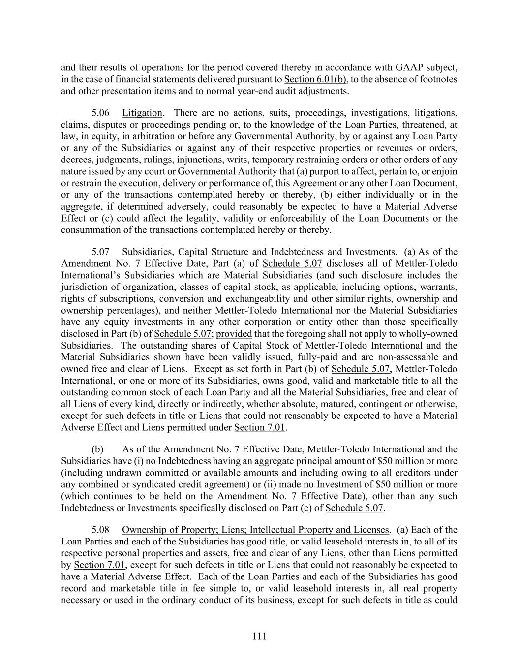 111 and their results of operations for the period covered thereby in accordance with GAAP subject, in the case of financial statements delivered pursuant to Section 6.01(b), to the absence of footnotes and other presentation items and to normal year-end audit adjustments. 5.06 Litigation. There are no actions, suits, proceedings, investigations, litigations, claims, disputes or proceedings pending or, to the knowledge of the Loan Parties, threatened, at law, in equity, in arbitration or before any Governmental Authority, by or against any Loan Party or any of the Subsidiaries or against any of their respective properties or revenues or orders, decrees, judgments, rulings, injunctions, writs, temporary restraining orders or other orders of any nature issued by any court or Governmental Authority that (a) purport to affect, pertain to, or enjoin or restrain the execution, delivery or performance of, this Agreement or any other Loan Document, or any of the transactions contemplated hereby or thereby, (b) either individually or in the aggregate, if determined adversely, could reasonably be expected to have a Material Adverse Effect or (c) could affect the legality, validity or enforceability of the Loan Documents or the consummation of the transactions contemplated hereby or thereby. 5.07 Subsidiaries, Capital Structure and Indebtedness and Investments. (a) As of the Amendment No. 7 Effective Date, Part (a) of Schedule 5.07 discloses all of Mettler-Toledo International’s Subsidiaries which are Material Subsidiaries (and such disclosure includes the jurisdiction of organization, classes of capital stock, as applicable, including options, warrants, rights of subscriptions, conversion and exchangeability and other similar rights, ownership and ownership percentages), and neither Mettler-Toledo International nor the Material Subsidiaries have any equity investments in any other corporation or entity other than those specifically disclosed in Part (b) of Schedule 5.07; provided that the foregoing shall not apply to wholly-owned Subsidiaries. The outstanding shares of Capital Stock of Mettler-Toledo International and the Material Subsidiaries shown have been validly issued, fully-paid and are non-assessable and owned free and clear of Liens. Except as set forth in Part (b) of Schedule 5.07, Mettler-Toledo International, or one or more of its Subsidiaries, owns good, valid and marketable title to all the outstanding common stock of each Loan Party and all the Material Subsidiaries, free and clear of all Liens of every kind, directly or indirectly, whether absolute, matured, contingent or otherwise, except for such defects in title or Liens that could not reasonably be expected to have a Material Adverse Effect and Liens permitted under Section 7.01. (b) As of the Amendment No. 7 Effective Date, Mettler-Toledo International and the Subsidiaries have (i) no Indebtedness having an aggregate principal amount of $50 million or more (including undrawn committed or available amounts and including owing to all creditors under any combined or syndicated credit agreement) or (ii) made no Investment of $50 million or more (which continues to be held on the Amendment No. 7 Effective Date), other than any such Indebtedness or Investments specifically disclosed on Part (c) of Schedule 5.07. 5.08 Ownership of Property; Liens; Intellectual Property and Licenses. (a) Each of the Loan Parties and each of the Subsidiaries has good title, or valid leasehold interests in, to all of its respective personal properties and assets, free and clear of any Liens, other than Liens permitted by Section 7.01, except for such defects in title or Liens that could not reasonably be expected to have a Material Adverse Effect. Each of the Loan Parties and each of the Subsidiaries has good record and marketable title in fee simple to, or valid leasehold interests in, all real property necessary or used in the ordinary conduct of its business, except for such defects in title as could