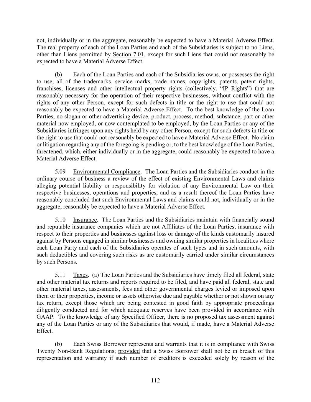 112 not, individually or in the aggregate, reasonably be expected to have a Material Adverse Effect. The real property of each of the Loan Parties and each of the Subsidiaries is subject to no Liens, other than Liens permitted by Section 7.01, except for such Liens that could not reasonably be expected to have a Material Adverse Effect. (b) Each of the Loan Parties and each of the Subsidiaries owns, or possesses the right to use, all of the trademarks, service marks, trade names, copyrights, patents, patent rights, franchises, licenses and other intellectual property rights (collectively, “IP Rights”) that are reasonably necessary for the operation of their respective businesses, without conflict with the rights of any other Person, except for such defects in title or the right to use that could not reasonably be expected to have a Material Adverse Effect. To the best knowledge of the Loan Parties, no slogan or other advertising device, product, process, method, substance, part or other material now employed, or now contemplated to be employed, by the Loan Parties or any of the Subsidiaries infringes upon any rights held by any other Person, except for such defects in title or the right to use that could not reasonably be expected to have a Material Adverse Effect. No claim or litigation regarding any of the foregoing is pending or, to the best knowledge of the Loan Parties, threatened, which, either individually or in the aggregate, could reasonably be expected to have a Material Adverse Effect. 5.09 Environmental Compliance. The Loan Parties and the Subsidiaries conduct in the ordinary course of business a review of the effect of existing Environmental Laws and claims alleging potential liability or responsibility for violation of any Environmental Law on their respective businesses, operations and properties, and as a result thereof the Loan Parties have reasonably concluded that such Environmental Laws and claims could not, individually or in the aggregate, reasonably be expected to have a Material Adverse Effect. 5.10 Insurance. The Loan Parties and the Subsidiaries maintain with financially sound and reputable insurance companies which are not Affiliates of the Loan Parties, insurance with respect to their properties and businesses against loss or damage of the kinds customarily insured against by Persons engaged in similar businesses and owning similar properties in localities where each Loan Party and each of the Subsidiaries operates of such types and in such amounts, with such deductibles and covering such risks as are customarily carried under similar circumstances by such Persons. 5.11 Taxes. (a) The Loan Parties and the Subsidiaries have timely filed all federal, state and other material tax returns and reports required to be filed, and have paid all federal, state and other material taxes, assessments, fees and other governmental charges levied or imposed upon them or their properties, income or assets otherwise due and payable whether or not shown on any tax return, except those which are being contested in good faith by appropriate proceedings diligently conducted and for which adequate reserves have been provided in accordance with GAAP. To the knowledge of any Specified Officer, there is no proposed tax assessment against any of the Loan Parties or any of the Subsidiaries that would, if made, have a Material Adverse Effect. (b) Each Swiss Borrower represents and warrants that it is in compliance with Swiss Twenty Non-Bank Regulations; provided that a Swiss Borrower shall not be in breach of this representation and warranty if such number of creditors is exceeded solely by reason of the