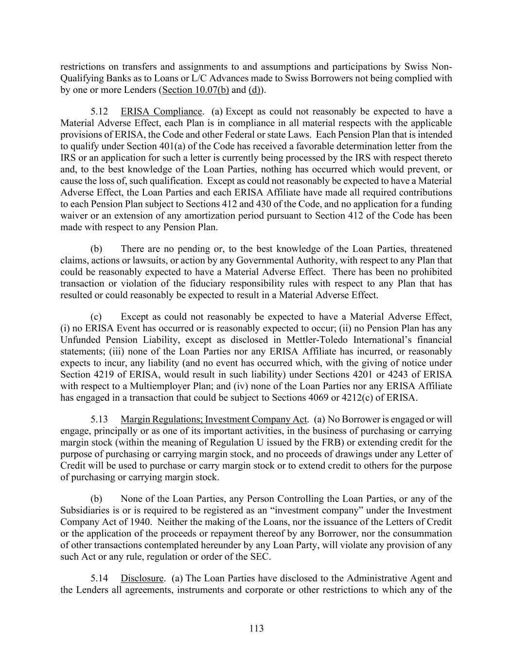 113 restrictions on transfers and assignments to and assumptions and participations by Swiss Non- Qualifying Banks as to Loans or L/C Advances made to Swiss Borrowers not being complied with by one or more Lenders (Section 10.07(b) and (d)). 5.12 ERISA Compliance. (a) Except as could not reasonably be expected to have a Material Adverse Effect, each Plan is in compliance in all material respects with the applicable provisions of ERISA, the Code and other Federal or state Laws. Each Pension Plan that is intended to qualify under Section 401(a) of the Code has received a favorable determination letter from the IRS or an application for such a letter is currently being processed by the IRS with respect thereto and, to the best knowledge of the Loan Parties, nothing has occurred which would prevent, or cause the loss of, such qualification. Except as could not reasonably be expected to have a Material Adverse Effect, the Loan Parties and each ERISA Affiliate have made all required contributions to each Pension Plan subject to Sections 412 and 430 of the Code, and no application for a funding waiver or an extension of any amortization period pursuant to Section 412 of the Code has been made with respect to any Pension Plan. (b) There are no pending or, to the best knowledge of the Loan Parties, threatened claims, actions or lawsuits, or action by any Governmental Authority, with respect to any Plan that could be reasonably expected to have a Material Adverse Effect. There has been no prohibited transaction or violation of the fiduciary responsibility rules with respect to any Plan that has resulted or could reasonably be expected to result in a Material Adverse Effect. (c) Except as could not reasonably be expected to have a Material Adverse Effect, (i) no ERISA Event has occurred or is reasonably expected to occur; (ii) no Pension Plan has any Unfunded Pension Liability, except as disclosed in Mettler-Toledo International’s financial statements; (iii) none of the Loan Parties nor any ERISA Affiliate has incurred, or reasonably expects to incur, any liability (and no event has occurred which, with the giving of notice under Section 4219 of ERISA, would result in such liability) under Sections 4201 or 4243 of ERISA with respect to a Multiemployer Plan; and (iv) none of the Loan Parties nor any ERISA Affiliate has engaged in a transaction that could be subject to Sections 4069 or 4212(c) of ERISA. 5.13 Margin Regulations; Investment Company Act. (a) No Borrower is engaged or will engage, principally or as one of its important activities, in the business of purchasing or carrying margin stock (within the meaning of Regulation U issued by the FRB) or extending credit for the purpose of purchasing or carrying margin stock, and no proceeds of drawings under any Letter of Credit will be used to purchase or carry margin stock or to extend credit to others for the purpose of purchasing or carrying margin stock. (b) None of the Loan Parties, any Person Controlling the Loan Parties, or any of the Subsidiaries is or is required to be registered as an “investment company” under the Investment Company Act of 1940. Neither the making of the Loans, nor the issuance of the Letters of Credit or the application of the proceeds or repayment thereof by any Borrower, nor the consummation of other transactions contemplated hereunder by any Loan Party, will violate any provision of any such Act or any rule, regulation or order of the SEC. 5.14 Disclosure. (a) The Loan Parties have disclosed to the Administrative Agent and the Lenders all agreements, instruments and corporate or other restrictions to which any of the