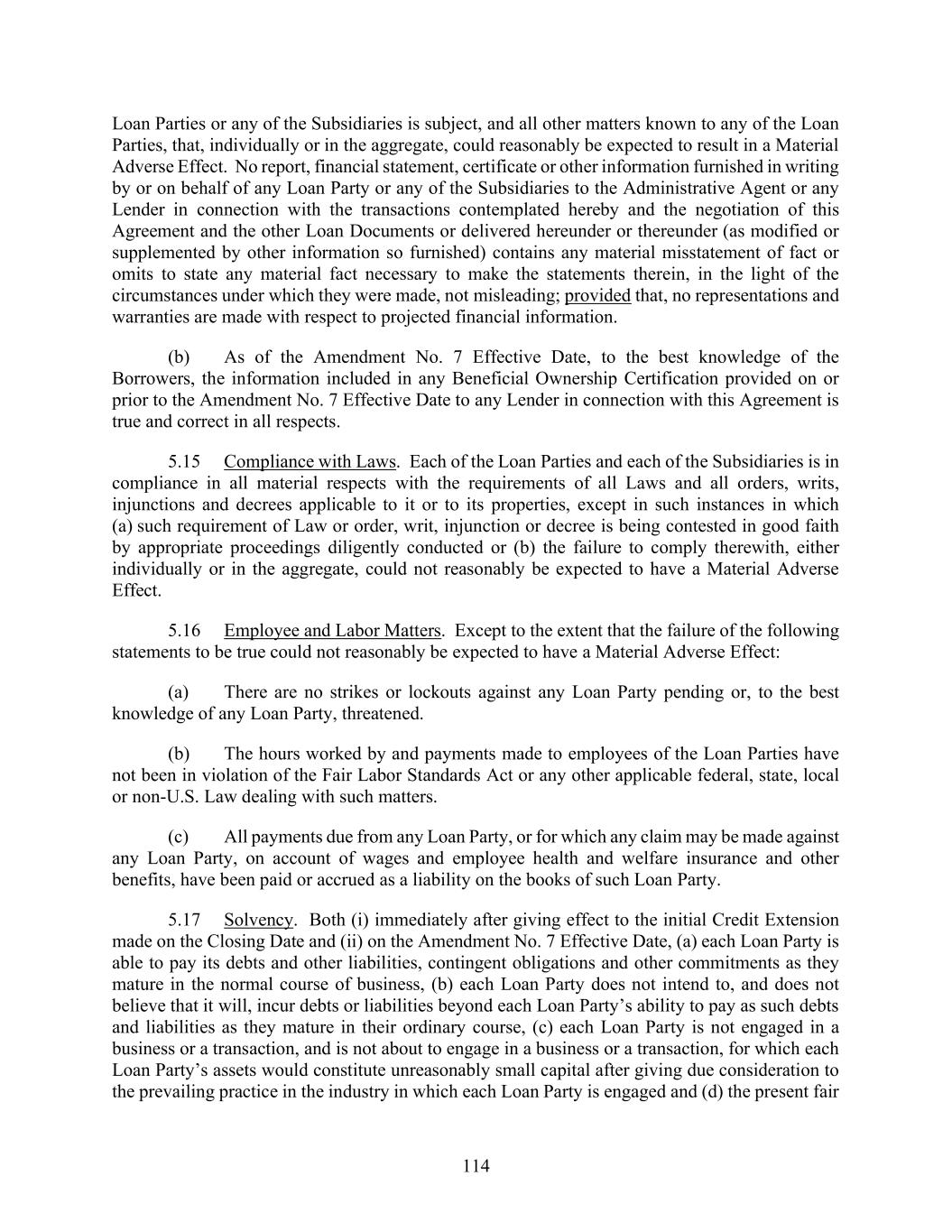 114 Loan Parties or any of the Subsidiaries is subject, and all other matters known to any of the Loan Parties, that, individually or in the aggregate, could reasonably be expected to result in a Material Adverse Effect. No report, financial statement, certificate or other information furnished in writing by or on behalf of any Loan Party or any of the Subsidiaries to the Administrative Agent or any Lender in connection with the transactions contemplated hereby and the negotiation of this Agreement and the other Loan Documents or delivered hereunder or thereunder (as modified or supplemented by other information so furnished) contains any material misstatement of fact or omits to state any material fact necessary to make the statements therein, in the light of the circumstances under which they were made, not misleading; provided that, no representations and warranties are made with respect to projected financial information. (b) As of the Amendment No. 7 Effective Date, to the best knowledge of the Borrowers, the information included in any Beneficial Ownership Certification provided on or prior to the Amendment No. 7 Effective Date to any Lender in connection with this Agreement is true and correct in all respects. 5.15 Compliance with Laws. Each of the Loan Parties and each of the Subsidiaries is in compliance in all material respects with the requirements of all Laws and all orders, writs, injunctions and decrees applicable to it or to its properties, except in such instances in which (a) such requirement of Law or order, writ, injunction or decree is being contested in good faith by appropriate proceedings diligently conducted or (b) the failure to comply therewith, either individually or in the aggregate, could not reasonably be expected to have a Material Adverse Effect. 5.16 Employee and Labor Matters. Except to the extent that the failure of the following statements to be true could not reasonably be expected to have a Material Adverse Effect: (a) There are no strikes or lockouts against any Loan Party pending or, to the best knowledge of any Loan Party, threatened. (b) The hours worked by and payments made to employees of the Loan Parties have not been in violation of the Fair Labor Standards Act or any other applicable federal, state, local or non-U.S. Law dealing with such matters. (c) All payments due from any Loan Party, or for which any claim may be made against any Loan Party, on account of wages and employee health and welfare insurance and other benefits, have been paid or accrued as a liability on the books of such Loan Party. 5.17 Solvency. Both (i) immediately after giving effect to the initial Credit Extension made on the Closing Date and (ii) on the Amendment No. 7 Effective Date, (a) each Loan Party is able to pay its debts and other liabilities, contingent obligations and other commitments as they mature in the normal course of business, (b) each Loan Party does not intend to, and does not believe that it will, incur debts or liabilities beyond each Loan Party’s ability to pay as such debts and liabilities as they mature in their ordinary course, (c) each Loan Party is not engaged in a business or a transaction, and is not about to engage in a business or a transaction, for which each Loan Party’s assets would constitute unreasonably small capital after giving due consideration to the prevailing practice in the industry in which each Loan Party is engaged and (d) the present fair
