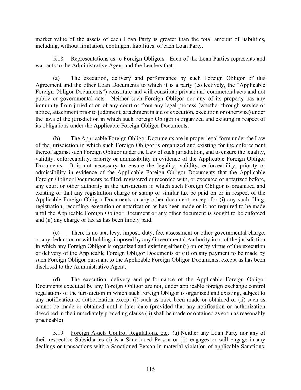 115 market value of the assets of each Loan Party is greater than the total amount of liabilities, including, without limitation, contingent liabilities, of each Loan Party. 5.18 Representations as to Foreign Obligors. Each of the Loan Parties represents and warrants to the Administrative Agent and the Lenders that: (a) The execution, delivery and performance by such Foreign Obligor of this Agreement and the other Loan Documents to which it is a party (collectively, the “Applicable Foreign Obligor Documents”) constitute and will constitute private and commercial acts and not public or governmental acts. Neither such Foreign Obligor nor any of its property has any immunity from jurisdiction of any court or from any legal process (whether through service or notice, attachment prior to judgment, attachment in aid of execution, execution or otherwise) under the laws of the jurisdiction in which such Foreign Obligor is organized and existing in respect of its obligations under the Applicable Foreign Obligor Documents. (b) The Applicable Foreign Obligor Documents are in proper legal form under the Law of the jurisdiction in which such Foreign Obligor is organized and existing for the enforcement thereof against such Foreign Obligor under the Law of such jurisdiction, and to ensure the legality, validity, enforceability, priority or admissibility in evidence of the Applicable Foreign Obligor Documents. It is not necessary to ensure the legality, validity, enforceability, priority or admissibility in evidence of the Applicable Foreign Obligor Documents that the Applicable Foreign Obligor Documents be filed, registered or recorded with, or executed or notarized before, any court or other authority in the jurisdiction in which such Foreign Obligor is organized and existing or that any registration charge or stamp or similar tax be paid on or in respect of the Applicable Foreign Obligor Documents or any other document, except for (i) any such filing, registration, recording, execution or notarization as has been made or is not required to be made until the Applicable Foreign Obligor Document or any other document is sought to be enforced and (ii) any charge or tax as has been timely paid. (c) There is no tax, levy, impost, duty, fee, assessment or other governmental charge, or any deduction or withholding, imposed by any Governmental Authority in or of the jurisdiction in which any Foreign Obligor is organized and existing either (i) on or by virtue of the execution or delivery of the Applicable Foreign Obligor Documents or (ii) on any payment to be made by such Foreign Obligor pursuant to the Applicable Foreign Obligor Documents, except as has been disclosed to the Administrative Agent. (d) The execution, delivery and performance of the Applicable Foreign Obligor Documents executed by any Foreign Obligor are not, under applicable foreign exchange control regulations of the jurisdiction in which such Foreign Obligor is organized and existing, subject to any notification or authorization except (i) such as have been made or obtained or (ii) such as cannot be made or obtained until a later date (provided that any notification or authorization described in the immediately preceding clause (ii) shall be made or obtained as soon as reasonably practicable). 5.19 Foreign Assets Control Regulations, etc. (a) Neither any Loan Party nor any of their respective Subsidiaries (i) is a Sanctioned Person or (ii) engages or will engage in any dealings or transactions with a Sanctioned Person in material violation of applicable Sanctions.