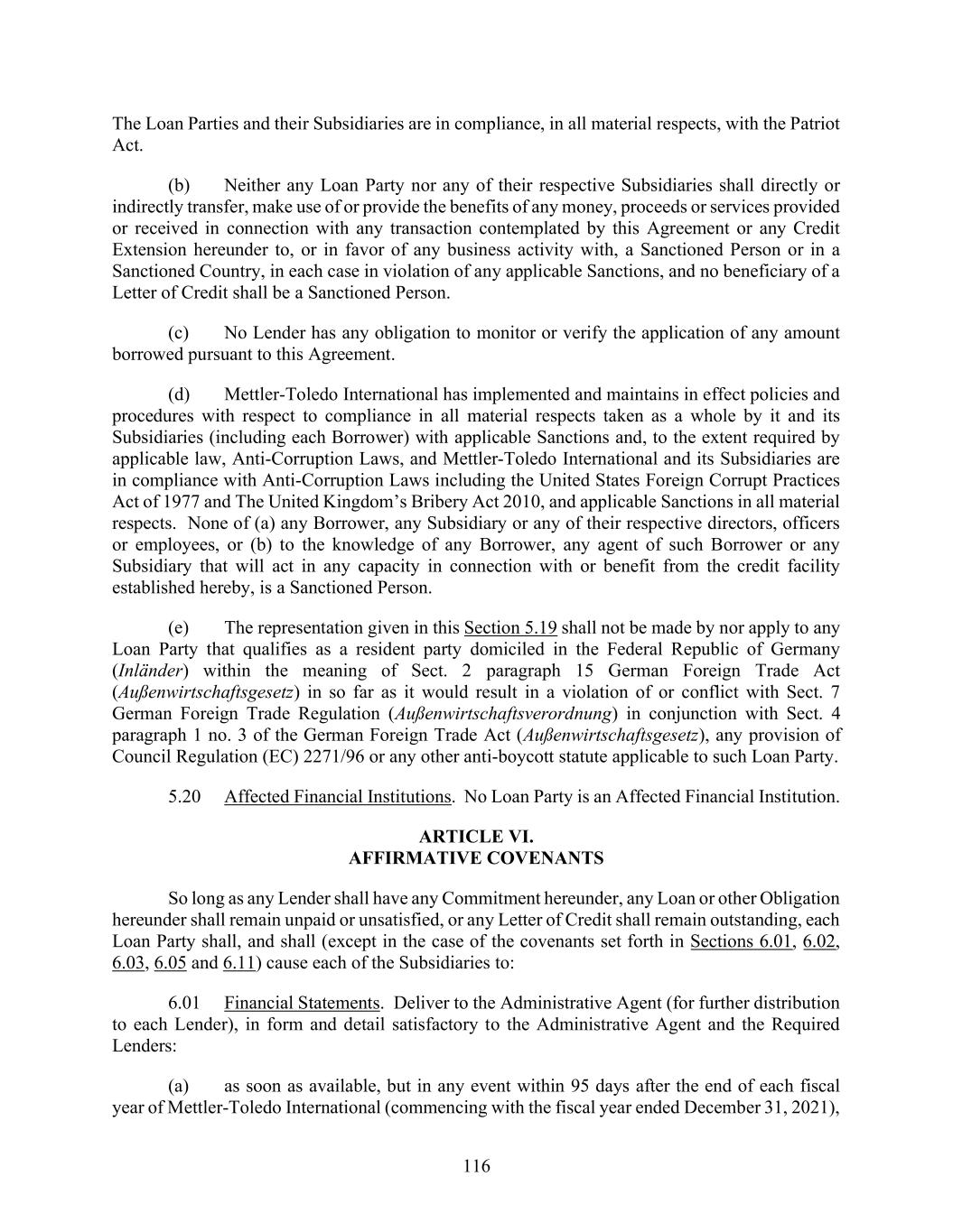116 The Loan Parties and their Subsidiaries are in compliance, in all material respects, with the Patriot Act. (b) Neither any Loan Party nor any of their respective Subsidiaries shall directly or indirectly transfer, make use of or provide the benefits of any money, proceeds or services provided or received in connection with any transaction contemplated by this Agreement or any Credit Extension hereunder to, or in favor of any business activity with, a Sanctioned Person or in a Sanctioned Country, in each case in violation of any applicable Sanctions, and no beneficiary of a Letter of Credit shall be a Sanctioned Person. (c) No Lender has any obligation to monitor or verify the application of any amount borrowed pursuant to this Agreement. (d) Mettler-Toledo International has implemented and maintains in effect policies and procedures with respect to compliance in all material respects taken as a whole by it and its Subsidiaries (including each Borrower) with applicable Sanctions and, to the extent required by applicable law, Anti-Corruption Laws, and Mettler-Toledo International and its Subsidiaries are in compliance with Anti-Corruption Laws including the United States Foreign Corrupt Practices Act of 1977 and The United Kingdom’s Bribery Act 2010, and applicable Sanctions in all material respects. None of (a) any Borrower, any Subsidiary or any of their respective directors, officers or employees, or (b) to the knowledge of any Borrower, any agent of such Borrower or any Subsidiary that will act in any capacity in connection with or benefit from the credit facility established hereby, is a Sanctioned Person. (e) The representation given in this Section 5.19 shall not be made by nor apply to any Loan Party that qualifies as a resident party domiciled in the Federal Republic of Germany (Inländer) within the meaning of Sect. 2 paragraph 15 German Foreign Trade Act (Außenwirtschaftsgesetz) in so far as it would result in a violation of or conflict with Sect. 7 German Foreign Trade Regulation (Außenwirtschaftsverordnung) in conjunction with Sect. 4 paragraph 1 no. 3 of the German Foreign Trade Act (Außenwirtschaftsgesetz), any provision of Council Regulation (EC) 2271/96 or any other anti-boycott statute applicable to such Loan Party. 5.20 Affected Financial Institutions. No Loan Party is an Affected Financial Institution. ARTICLE VI. AFFIRMATIVE COVENANTS So long as any Lender shall have any Commitment hereunder, any Loan or other Obligation hereunder shall remain unpaid or unsatisfied, or any Letter of Credit shall remain outstanding, each Loan Party shall, and shall (except in the case of the covenants set forth in Sections 6.01, 6.02, 6.03, 6.05 and 6.11) cause each of the Subsidiaries to: 6.01 Financial Statements. Deliver to the Administrative Agent (for further distribution to each Lender), in form and detail satisfactory to the Administrative Agent and the Required Lenders: (a) as soon as available, but in any event within 95 days after the end of each fiscal year of Mettler-Toledo International (commencing with the fiscal year ended December 31, 2021),