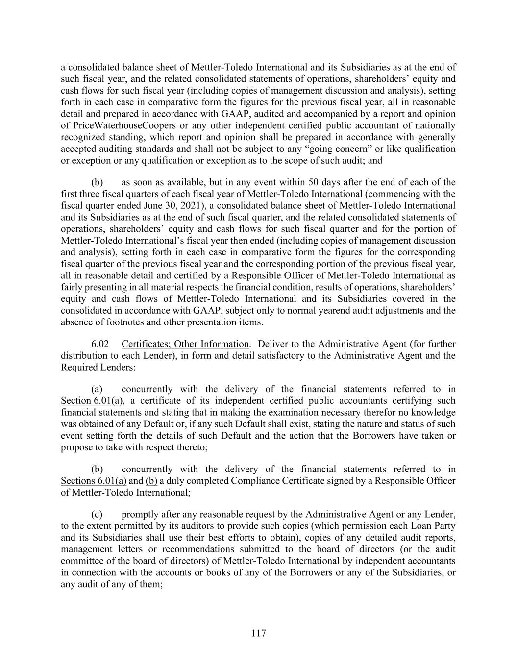 117 a consolidated balance sheet of Mettler-Toledo International and its Subsidiaries as at the end of such fiscal year, and the related consolidated statements of operations, shareholders’ equity and cash flows for such fiscal year (including copies of management discussion and analysis), setting forth in each case in comparative form the figures for the previous fiscal year, all in reasonable detail and prepared in accordance with GAAP, audited and accompanied by a report and opinion of PriceWaterhouseCoopers or any other independent certified public accountant of nationally recognized standing, which report and opinion shall be prepared in accordance with generally accepted auditing standards and shall not be subject to any “going concern” or like qualification or exception or any qualification or exception as to the scope of such audit; and (b) as soon as available, but in any event within 50 days after the end of each of the first three fiscal quarters of each fiscal year of Mettler-Toledo International (commencing with the fiscal quarter ended June 30, 2021), a consolidated balance sheet of Mettler-Toledo International and its Subsidiaries as at the end of such fiscal quarter, and the related consolidated statements of operations, shareholders’ equity and cash flows for such fiscal quarter and for the portion of Mettler-Toledo International’s fiscal year then ended (including copies of management discussion and analysis), setting forth in each case in comparative form the figures for the corresponding fiscal quarter of the previous fiscal year and the corresponding portion of the previous fiscal year, all in reasonable detail and certified by a Responsible Officer of Mettler-Toledo International as fairly presenting in all material respects the financial condition, results of operations, shareholders’ equity and cash flows of Mettler-Toledo International and its Subsidiaries covered in the consolidated in accordance with GAAP, subject only to normal yearend audit adjustments and the absence of footnotes and other presentation items. 6.02 Certificates; Other Information. Deliver to the Administrative Agent (for further distribution to each Lender), in form and detail satisfactory to the Administrative Agent and the Required Lenders: (a) concurrently with the delivery of the financial statements referred to in Section 6.01(a), a certificate of its independent certified public accountants certifying such financial statements and stating that in making the examination necessary therefor no knowledge was obtained of any Default or, if any such Default shall exist, stating the nature and status of such event setting forth the details of such Default and the action that the Borrowers have taken or propose to take with respect thereto; (b) concurrently with the delivery of the financial statements referred to in Sections 6.01(a) and (b) a duly completed Compliance Certificate signed by a Responsible Officer of Mettler-Toledo International; (c) promptly after any reasonable request by the Administrative Agent or any Lender, to the extent permitted by its auditors to provide such copies (which permission each Loan Party and its Subsidiaries shall use their best efforts to obtain), copies of any detailed audit reports, management letters or recommendations submitted to the board of directors (or the audit committee of the board of directors) of Mettler-Toledo International by independent accountants in connection with the accounts or books of any of the Borrowers or any of the Subsidiaries, or any audit of any of them;