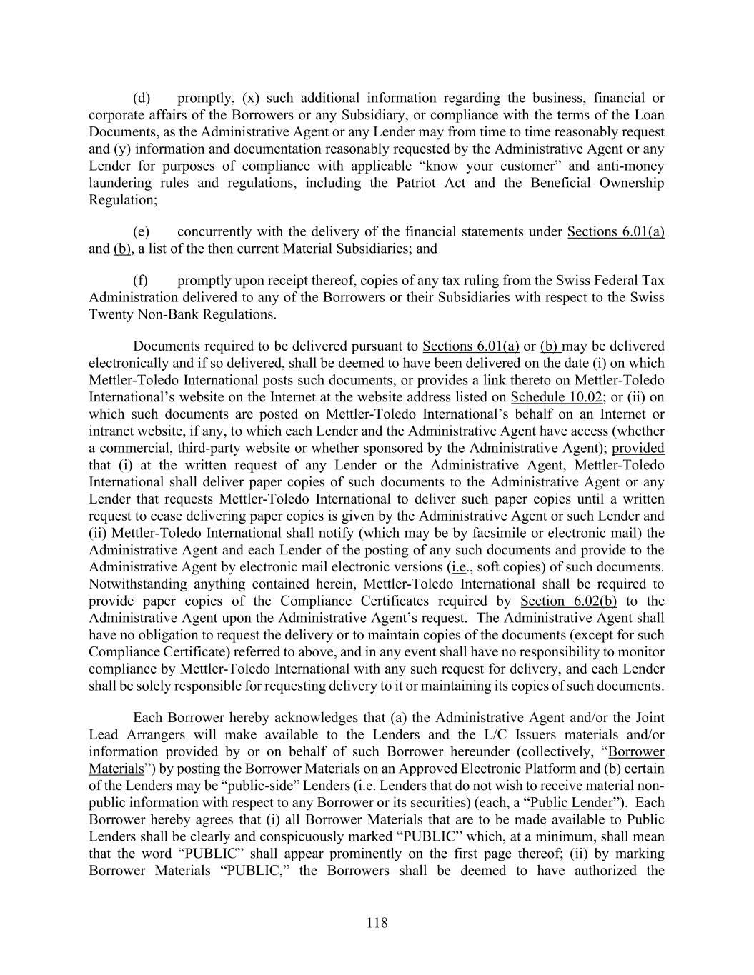 118 (d) promptly, (x) such additional information regarding the business, financial or corporate affairs of the Borrowers or any Subsidiary, or compliance with the terms of the Loan Documents, as the Administrative Agent or any Lender may from time to time reasonably request and (y) information and documentation reasonably requested by the Administrative Agent or any Lender for purposes of compliance with applicable “know your customer” and anti-money laundering rules and regulations, including the Patriot Act and the Beneficial Ownership Regulation; (e) concurrently with the delivery of the financial statements under Sections 6.01(a) and (b), a list of the then current Material Subsidiaries; and (f) promptly upon receipt thereof, copies of any tax ruling from the Swiss Federal Tax Administration delivered to any of the Borrowers or their Subsidiaries with respect to the Swiss Twenty Non-Bank Regulations. Documents required to be delivered pursuant to Sections 6.01(a) or (b) may be delivered electronically and if so delivered, shall be deemed to have been delivered on the date (i) on which Mettler-Toledo International posts such documents, or provides a link thereto on Mettler-Toledo International’s website on the Internet at the website address listed on Schedule 10.02; or (ii) on which such documents are posted on Mettler-Toledo International’s behalf on an Internet or intranet website, if any, to which each Lender and the Administrative Agent have access (whether a commercial, third-party website or whether sponsored by the Administrative Agent); provided that (i) at the written request of any Lender or the Administrative Agent, Mettler-Toledo International shall deliver paper copies of such documents to the Administrative Agent or any Lender that requests Mettler-Toledo International to deliver such paper copies until a written request to cease delivering paper copies is given by the Administrative Agent or such Lender and (ii) Mettler-Toledo International shall notify (which may be by facsimile or electronic mail) the Administrative Agent and each Lender of the posting of any such documents and provide to the Administrative Agent by electronic mail electronic versions (i.e., soft copies) of such documents. Notwithstanding anything contained herein, Mettler-Toledo International shall be required to provide paper copies of the Compliance Certificates required by Section 6.02(b) to the Administrative Agent upon the Administrative Agent’s request. The Administrative Agent shall have no obligation to request the delivery or to maintain copies of the documents (except for such Compliance Certificate) referred to above, and in any event shall have no responsibility to monitor compliance by Mettler-Toledo International with any such request for delivery, and each Lender shall be solely responsible for requesting delivery to it or maintaining its copies of such documents. Each Borrower hereby acknowledges that (a) the Administrative Agent and/or the Joint Lead Arrangers will make available to the Lenders and the L/C Issuers materials and/or information provided by or on behalf of such Borrower hereunder (collectively, “Borrower Materials”) by posting the Borrower Materials on an Approved Electronic Platform and (b) certain of the Lenders may be “public-side” Lenders (i.e. Lenders that do not wish to receive material non- public information with respect to any Borrower or its securities) (each, a “Public Lender”). Each Borrower hereby agrees that (i) all Borrower Materials that are to be made available to Public Lenders shall be clearly and conspicuously marked “PUBLIC” which, at a minimum, shall mean that the word “PUBLIC” shall appear prominently on the first page thereof; (ii) by marking Borrower Materials “PUBLIC,” the Borrowers shall be deemed to have authorized the