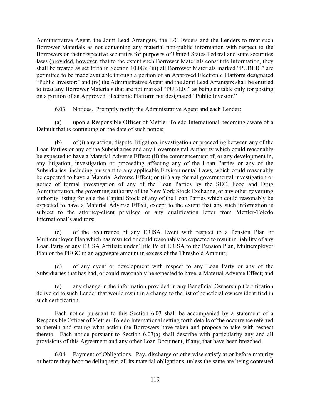 119 Administrative Agent, the Joint Lead Arrangers, the L/C Issuers and the Lenders to treat such Borrower Materials as not containing any material non-public information with respect to the Borrowers or their respective securities for purposes of United States Federal and state securities laws (provided, however, that to the extent such Borrower Materials constitute Information, they shall be treated as set forth in Section 10.08); (iii) all Borrower Materials marked “PUBLIC” are permitted to be made available through a portion of an Approved Electronic Platform designated “Public Investor;” and (iv) the Administrative Agent and the Joint Lead Arrangers shall be entitled to treat any Borrower Materials that are not marked “PUBLIC” as being suitable only for posting on a portion of an Approved Electronic Platform not designated “Public Investor.” 6.03 Notices. Promptly notify the Administrative Agent and each Lender: (a) upon a Responsible Officer of Mettler-Toledo International becoming aware of a Default that is continuing on the date of such notice; (b) of (i) any action, dispute, litigation, investigation or proceeding between any of the Loan Parties or any of the Subsidiaries and any Governmental Authority which could reasonably be expected to have a Material Adverse Effect; (ii) the commencement of, or any development in, any litigation, investigation or proceeding affecting any of the Loan Parties or any of the Subsidiaries, including pursuant to any applicable Environmental Laws, which could reasonably be expected to have a Material Adverse Effect; or (iii) any formal governmental investigation or notice of formal investigation of any of the Loan Parties by the SEC, Food and Drug Administration, the governing authority of the New York Stock Exchange, or any other governing authority listing for sale the Capital Stock of any of the Loan Parties which could reasonably be expected to have a Material Adverse Effect, except to the extent that any such information is subject to the attorney-client privilege or any qualification letter from Mettler-Toledo International’s auditors; (c) of the occurrence of any ERISA Event with respect to a Pension Plan or Multiemployer Plan which has resulted or could reasonably be expected to result in liability of any Loan Party or any ERISA Affiliate under Title IV of ERISA to the Pension Plan, Multiemployer Plan or the PBGC in an aggregate amount in excess of the Threshold Amount; (d) of any event or development with respect to any Loan Party or any of the Subsidiaries that has had, or could reasonably be expected to have, a Material Adverse Effect; and (e) any change in the information provided in any Beneficial Ownership Certification delivered to such Lender that would result in a change to the list of beneficial owners identified in such certification. Each notice pursuant to this Section 6.03 shall be accompanied by a statement of a Responsible Officer of Mettler-Toledo International setting forth details of the occurrence referred to therein and stating what action the Borrowers have taken and propose to take with respect thereto. Each notice pursuant to Section 6.03(a) shall describe with particularity any and all provisions of this Agreement and any other Loan Document, if any, that have been breached. 6.04 Payment of Obligations. Pay, discharge or otherwise satisfy at or before maturity or before they become delinquent, all its material obligations, unless the same are being contested