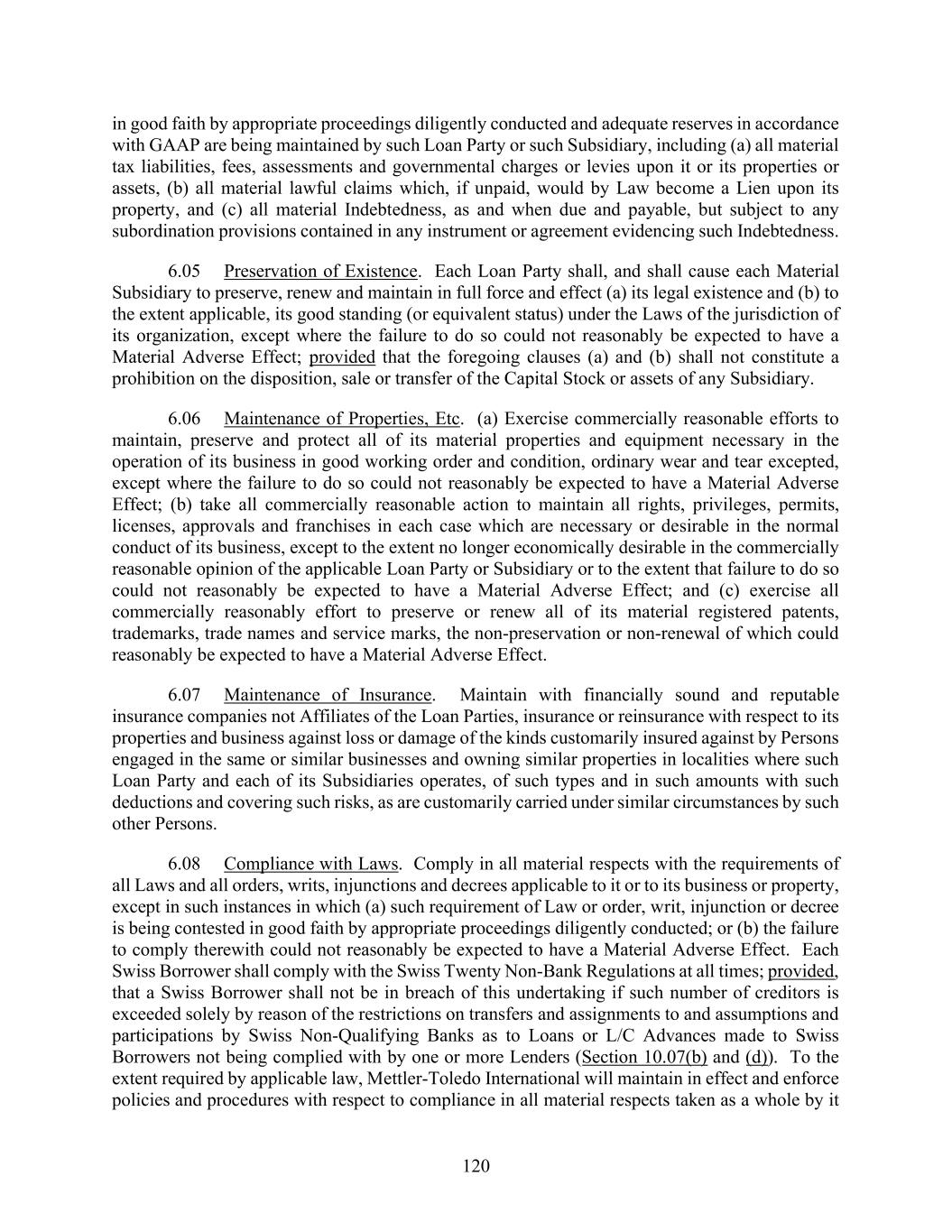 120 in good faith by appropriate proceedings diligently conducted and adequate reserves in accordance with GAAP are being maintained by such Loan Party or such Subsidiary, including (a) all material tax liabilities, fees, assessments and governmental charges or levies upon it or its properties or assets, (b) all material lawful claims which, if unpaid, would by Law become a Lien upon its property, and (c) all material Indebtedness, as and when due and payable, but subject to any subordination provisions contained in any instrument or agreement evidencing such Indebtedness. 6.05 Preservation of Existence. Each Loan Party shall, and shall cause each Material Subsidiary to preserve, renew and maintain in full force and effect (a) its legal existence and (b) to the extent applicable, its good standing (or equivalent status) under the Laws of the jurisdiction of its organization, except where the failure to do so could not reasonably be expected to have a Material Adverse Effect; provided that the foregoing clauses (a) and (b) shall not constitute a prohibition on the disposition, sale or transfer of the Capital Stock or assets of any Subsidiary. 6.06 Maintenance of Properties, Etc. (a) Exercise commercially reasonable efforts to maintain, preserve and protect all of its material properties and equipment necessary in the operation of its business in good working order and condition, ordinary wear and tear excepted, except where the failure to do so could not reasonably be expected to have a Material Adverse Effect; (b) take all commercially reasonable action to maintain all rights, privileges, permits, licenses, approvals and franchises in each case which are necessary or desirable in the normal conduct of its business, except to the extent no longer economically desirable in the commercially reasonable opinion of the applicable Loan Party or Subsidiary or to the extent that failure to do so could not reasonably be expected to have a Material Adverse Effect; and (c) exercise all commercially reasonably effort to preserve or renew all of its material registered patents, trademarks, trade names and service marks, the non-preservation or non-renewal of which could reasonably be expected to have a Material Adverse Effect. 6.07 Maintenance of Insurance. Maintain with financially sound and reputable insurance companies not Affiliates of the Loan Parties, insurance or reinsurance with respect to its properties and business against loss or damage of the kinds customarily insured against by Persons engaged in the same or similar businesses and owning similar properties in localities where such Loan Party and each of its Subsidiaries operates, of such types and in such amounts with such deductions and covering such risks, as are customarily carried under similar circumstances by such other Persons. 6.08 Compliance with Laws. Comply in all material respects with the requirements of all Laws and all orders, writs, injunctions and decrees applicable to it or to its business or property, except in such instances in which (a) such requirement of Law or order, writ, injunction or decree is being contested in good faith by appropriate proceedings diligently conducted; or (b) the failure to comply therewith could not reasonably be expected to have a Material Adverse Effect. Each Swiss Borrower shall comply with the Swiss Twenty Non-Bank Regulations at all times; provided, that a Swiss Borrower shall not be in breach of this undertaking if such number of creditors is exceeded solely by reason of the restrictions on transfers and assignments to and assumptions and participations by Swiss Non-Qualifying Banks as to Loans or L/C Advances made to Swiss Borrowers not being complied with by one or more Lenders (Section 10.07(b) and (d)). To the extent required by applicable law, Mettler-Toledo International will maintain in effect and enforce policies and procedures with respect to compliance in all material respects taken as a whole by it