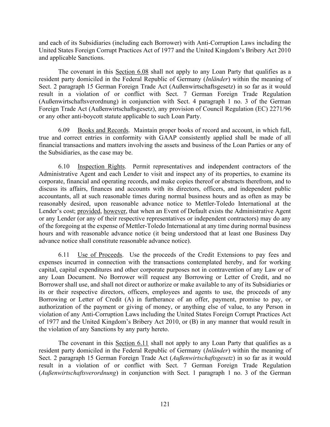 121 and each of its Subsidiaries (including each Borrower) with Anti-Corruption Laws including the United States Foreign Corrupt Practices Act of 1977 and the United Kingdom’s Bribery Act 2010 and applicable Sanctions. The covenant in this Section 6.08 shall not apply to any Loan Party that qualifies as a resident party domiciled in the Federal Republic of Germany (Inländer) within the meaning of Sect. 2 paragraph 15 German Foreign Trade Act (Außenwirtschaftsgesetz) in so far as it would result in a violation of or conflict with Sect. 7 German Foreign Trade Regulation (Außenwirtschaftsverordnung) in conjunction with Sect. 4 paragraph 1 no. 3 of the German Foreign Trade Act (Außenwirtschaftsgesetz), any provision of Council Regulation (EC) 2271/96 or any other anti-boycott statute applicable to such Loan Party. 6.09 Books and Records. Maintain proper books of record and account, in which full, true and correct entries in conformity with GAAP consistently applied shall be made of all financial transactions and matters involving the assets and business of the Loan Parties or any of the Subsidiaries, as the case may be. 6.10 Inspection Rights. Permit representatives and independent contractors of the Administrative Agent and each Lender to visit and inspect any of its properties, to examine its corporate, financial and operating records, and make copies thereof or abstracts therefrom, and to discuss its affairs, finances and accounts with its directors, officers, and independent public accountants, all at such reasonable times during normal business hours and as often as may be reasonably desired, upon reasonable advance notice to Mettler-Toledo International at the Lender’s cost; provided, however, that when an Event of Default exists the Administrative Agent or any Lender (or any of their respective representatives or independent contractors) may do any of the foregoing at the expense of Mettler-Toledo International at any time during normal business hours and with reasonable advance notice (it being understood that at least one Business Day advance notice shall constitute reasonable advance notice). 6.11 Use of Proceeds. Use the proceeds of the Credit Extensions to pay fees and expenses incurred in connection with the transactions contemplated hereby, and for working capital, capital expenditures and other corporate purposes not in contravention of any Law or of any Loan Document. No Borrower will request any Borrowing or Letter of Credit, and no Borrower shall use, and shall not direct or authorize or make available to any of its Subsidiaries or its or their respective directors, officers, employees and agents to use, the proceeds of any Borrowing or Letter of Credit (A) in furtherance of an offer, payment, promise to pay, or authorization of the payment or giving of money, or anything else of value, to any Person in violation of any Anti-Corruption Laws including the United States Foreign Corrupt Practices Act of 1977 and the United Kingdom’s Bribery Act 2010, or (B) in any manner that would result in the violation of any Sanctions by any party hereto. The covenant in this Section 6.11 shall not apply to any Loan Party that qualifies as a resident party domiciled in the Federal Republic of Germany (Inländer) within the meaning of Sect. 2 paragraph 15 German Foreign Trade Act (Außenwirtschaftsgesetz) in so far as it would result in a violation of or conflict with Sect. 7 German Foreign Trade Regulation (Außenwirtschaftsverordnung) in conjunction with Sect. 1 paragraph 1 no. 3 of the German