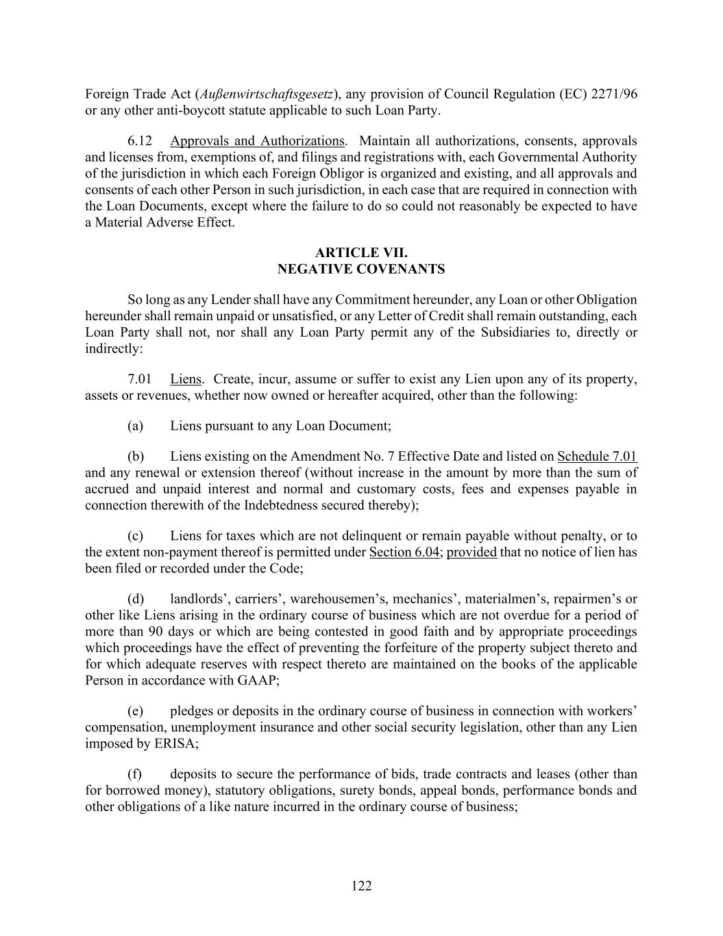 122 Foreign Trade Act (Außenwirtschaftsgesetz), any provision of Council Regulation (EC) 2271/96 or any other anti-boycott statute applicable to such Loan Party. 6.12 Approvals and Authorizations. Maintain all authorizations, consents, approvals and licenses from, exemptions of, and filings and registrations with, each Governmental Authority of the jurisdiction in which each Foreign Obligor is organized and existing, and all approvals and consents of each other Person in such jurisdiction, in each case that are required in connection with the Loan Documents, except where the failure to do so could not reasonably be expected to have a Material Adverse Effect. ARTICLE VII. NEGATIVE COVENANTS So long as any Lender shall have any Commitment hereunder, any Loan or other Obligation hereunder shall remain unpaid or unsatisfied, or any Letter of Credit shall remain outstanding, each Loan Party shall not, nor shall any Loan Party permit any of the Subsidiaries to, directly or indirectly: 7.01 Liens. Create, incur, assume or suffer to exist any Lien upon any of its property, assets or revenues, whether now owned or hereafter acquired, other than the following: (a) Liens pursuant to any Loan Document; (b) Liens existing on the Amendment No. 7 Effective Date and listed on Schedule 7.01 and any renewal or extension thereof (without increase in the amount by more than the sum of accrued and unpaid interest and normal and customary costs, fees and expenses payable in connection therewith of the Indebtedness secured thereby); (c) Liens for taxes which are not delinquent or remain payable without penalty, or to the extent non-payment thereof is permitted under Section 6.04; provided that no notice of lien has been filed or recorded under the Code; (d) landlords’, carriers’, warehousemen’s, mechanics’, materialmen’s, repairmen’s or other like Liens arising in the ordinary course of business which are not overdue for a period of more than 90 days or which are being contested in good faith and by appropriate proceedings which proceedings have the effect of preventing the forfeiture of the property subject thereto and for which adequate reserves with respect thereto are maintained on the books of the applicable Person in accordance with GAAP; (e) pledges or deposits in the ordinary course of business in connection with workers’ compensation, unemployment insurance and other social security legislation, other than any Lien imposed by ERISA; (f) deposits to secure the performance of bids, trade contracts and leases (other than for borrowed money), statutory obligations, surety bonds, appeal bonds, performance bonds and other obligations of a like nature incurred in the ordinary course of business;