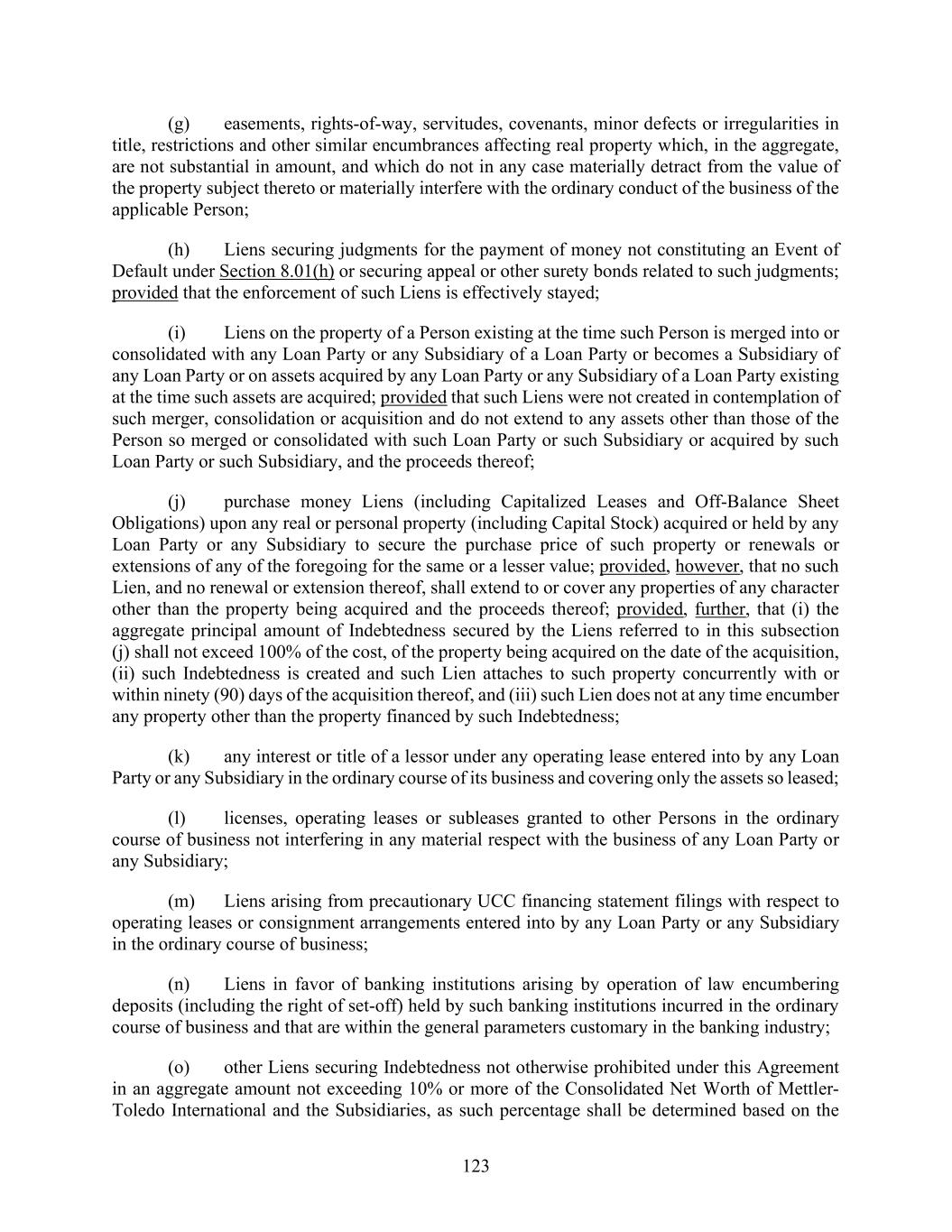 123 (g) easements, rights-of-way, servitudes, covenants, minor defects or irregularities in title, restrictions and other similar encumbrances affecting real property which, in the aggregate, are not substantial in amount, and which do not in any case materially detract from the value of the property subject thereto or materially interfere with the ordinary conduct of the business of the applicable Person; (h) Liens securing judgments for the payment of money not constituting an Event of Default under Section 8.01(h) or securing appeal or other surety bonds related to such judgments; provided that the enforcement of such Liens is effectively stayed; (i) Liens on the property of a Person existing at the time such Person is merged into or consolidated with any Loan Party or any Subsidiary of a Loan Party or becomes a Subsidiary of any Loan Party or on assets acquired by any Loan Party or any Subsidiary of a Loan Party existing at the time such assets are acquired; provided that such Liens were not created in contemplation of such merger, consolidation or acquisition and do not extend to any assets other than those of the Person so merged or consolidated with such Loan Party or such Subsidiary or acquired by such Loan Party or such Subsidiary, and the proceeds thereof; (j) purchase money Liens (including Capitalized Leases and Off-Balance Sheet Obligations) upon any real or personal property (including Capital Stock) acquired or held by any Loan Party or any Subsidiary to secure the purchase price of such property or renewals or extensions of any of the foregoing for the same or a lesser value; provided, however, that no such Lien, and no renewal or extension thereof, shall extend to or cover any properties of any character other than the property being acquired and the proceeds thereof; provided, further, that (i) the aggregate principal amount of Indebtedness secured by the Liens referred to in this subsection (j) shall not exceed 100% of the cost, of the property being acquired on the date of the acquisition, (ii) such Indebtedness is created and such Lien attaches to such property concurrently with or within ninety (90) days of the acquisition thereof, and (iii) such Lien does not at any time encumber any property other than the property financed by such Indebtedness; (k) any interest or title of a lessor under any operating lease entered into by any Loan Party or any Subsidiary in the ordinary course of its business and covering only the assets so leased; (l) licenses, operating leases or subleases granted to other Persons in the ordinary course of business not interfering in any material respect with the business of any Loan Party or any Subsidiary; (m) Liens arising from precautionary UCC financing statement filings with respect to operating leases or consignment arrangements entered into by any Loan Party or any Subsidiary in the ordinary course of business; (n) Liens in favor of banking institutions arising by operation of law encumbering deposits (including the right of set-off) held by such banking institutions incurred in the ordinary course of business and that are within the general parameters customary in the banking industry; (o) other Liens securing Indebtedness not otherwise prohibited under this Agreement in an aggregate amount not exceeding 10% or more of the Consolidated Net Worth of Mettler- Toledo International and the Subsidiaries, as such percentage shall be determined based on the