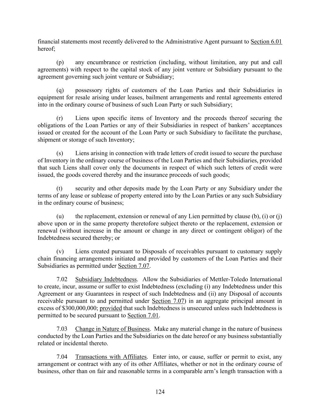 124 financial statements most recently delivered to the Administrative Agent pursuant to Section 6.01 hereof; (p) any encumbrance or restriction (including, without limitation, any put and call agreements) with respect to the capital stock of any joint venture or Subsidiary pursuant to the agreement governing such joint venture or Subsidiary; (q) possessory rights of customers of the Loan Parties and their Subsidiaries in equipment for resale arising under leases, bailment arrangements and rental agreements entered into in the ordinary course of business of such Loan Party or such Subsidiary; (r) Liens upon specific items of Inventory and the proceeds thereof securing the obligations of the Loan Parties or any of their Subsidiaries in respect of bankers’ acceptances issued or created for the account of the Loan Party or such Subsidiary to facilitate the purchase, shipment or storage of such Inventory; (s) Liens arising in connection with trade letters of credit issued to secure the purchase of Inventory in the ordinary course of business of the Loan Parties and their Subsidiaries, provided that such Liens shall cover only the documents in respect of which such letters of credit were issued, the goods covered thereby and the insurance proceeds of such goods; (t) security and other deposits made by the Loan Party or any Subsidiary under the terms of any lease or sublease of property entered into by the Loan Parties or any such Subsidiary in the ordinary course of business; (u) the replacement, extension or renewal of any Lien permitted by clause (b), (i) or (j) above upon or in the same property theretofore subject thereto or the replacement, extension or renewal (without increase in the amount or change in any direct or contingent obligor) of the Indebtedness secured thereby; or (v) Liens created pursuant to Disposals of receivables pursuant to customary supply chain financing arrangements initiated and provided by customers of the Loan Parties and their Subsidiaries as permitted under Section 7.07. 7.02 Subsidiary Indebtedness. Allow the Subsidiaries of Mettler-Toledo International to create, incur, assume or suffer to exist Indebtedness (excluding (i) any Indebtedness under this Agreement or any Guarantees in respect of such Indebtedness and (ii) any Disposal of accounts receivable pursuant to and permitted under Section 7.07) in an aggregate principal amount in excess of $300,000,000; provided that such Indebtedness is unsecured unless such Indebtedness is permitted to be secured pursuant to Section 7.01. 7.03 Change in Nature of Business. Make any material change in the nature of business conducted by the Loan Parties and the Subsidiaries on the date hereof or any business substantially related or incidental thereto. 7.04 Transactions with Affiliates. Enter into, or cause, suffer or permit to exist, any arrangement or contract with any of its other Affiliates, whether or not in the ordinary course of business, other than on fair and reasonable terms in a comparable arm’s length transaction with a