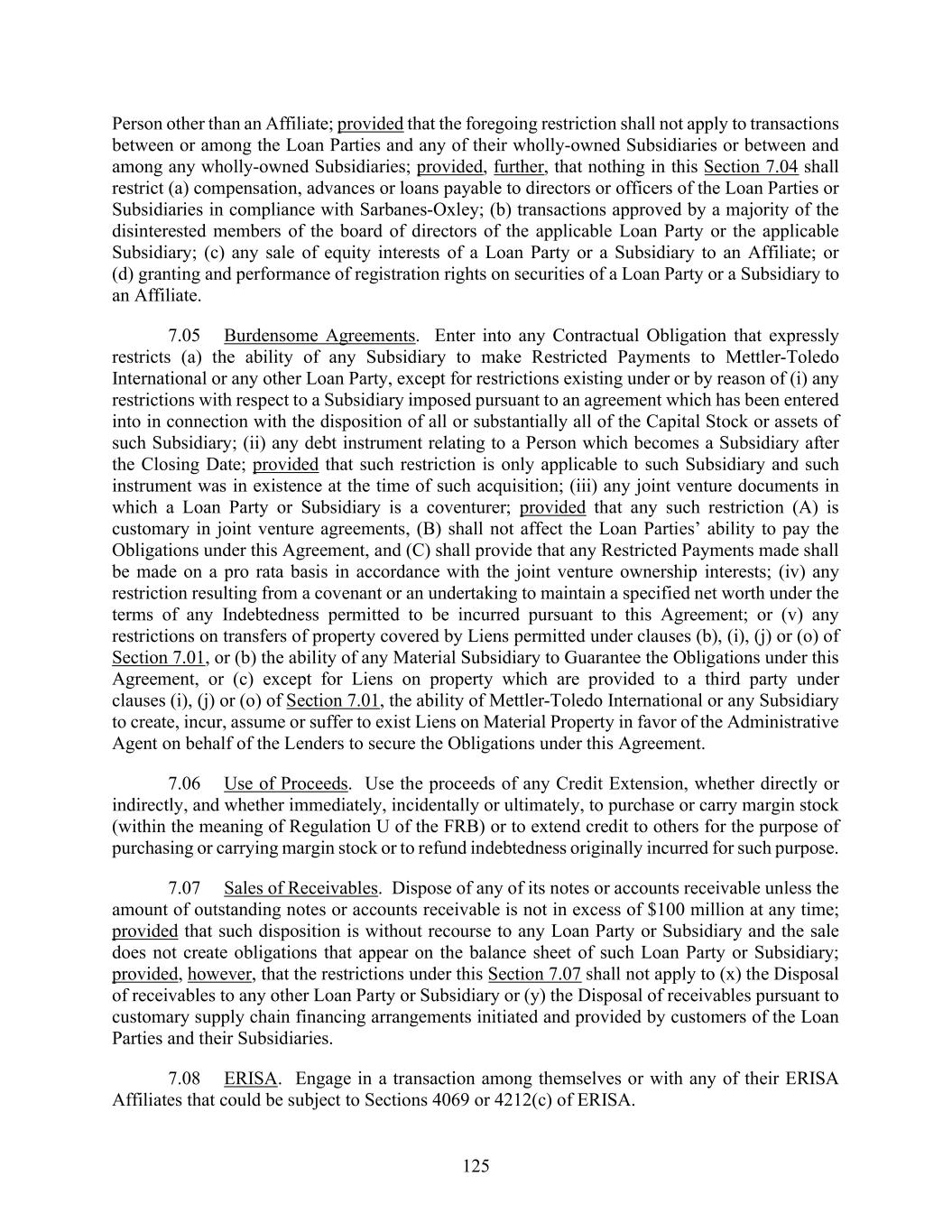 125 Person other than an Affiliate; provided that the foregoing restriction shall not apply to transactions between or among the Loan Parties and any of their wholly-owned Subsidiaries or between and among any wholly-owned Subsidiaries; provided, further, that nothing in this Section 7.04 shall restrict (a) compensation, advances or loans payable to directors or officers of the Loan Parties or Subsidiaries in compliance with Sarbanes-Oxley; (b) transactions approved by a majority of the disinterested members of the board of directors of the applicable Loan Party or the applicable Subsidiary; (c) any sale of equity interests of a Loan Party or a Subsidiary to an Affiliate; or (d) granting and performance of registration rights on securities of a Loan Party or a Subsidiary to an Affiliate. 7.05 Burdensome Agreements. Enter into any Contractual Obligation that expressly restricts (a) the ability of any Subsidiary to make Restricted Payments to Mettler-Toledo International or any other Loan Party, except for restrictions existing under or by reason of (i) any restrictions with respect to a Subsidiary imposed pursuant to an agreement which has been entered into in connection with the disposition of all or substantially all of the Capital Stock or assets of such Subsidiary; (ii) any debt instrument relating to a Person which becomes a Subsidiary after the Closing Date; provided that such restriction is only applicable to such Subsidiary and such instrument was in existence at the time of such acquisition; (iii) any joint venture documents in which a Loan Party or Subsidiary is a coventurer; provided that any such restriction (A) is customary in joint venture agreements, (B) shall not affect the Loan Parties’ ability to pay the Obligations under this Agreement, and (C) shall provide that any Restricted Payments made shall be made on a pro rata basis in accordance with the joint venture ownership interests; (iv) any restriction resulting from a covenant or an undertaking to maintain a specified net worth under the terms of any Indebtedness permitted to be incurred pursuant to this Agreement; or (v) any restrictions on transfers of property covered by Liens permitted under clauses (b), (i), (j) or (o) of Section 7.01, or (b) the ability of any Material Subsidiary to Guarantee the Obligations under this Agreement, or (c) except for Liens on property which are provided to a third party under clauses (i), (j) or (o) of Section 7.01, the ability of Mettler-Toledo International or any Subsidiary to create, incur, assume or suffer to exist Liens on Material Property in favor of the Administrative Agent on behalf of the Lenders to secure the Obligations under this Agreement. 7.06 Use of Proceeds. Use the proceeds of any Credit Extension, whether directly or indirectly, and whether immediately, incidentally or ultimately, to purchase or carry margin stock (within the meaning of Regulation U of the FRB) or to extend credit to others for the purpose of purchasing or carrying margin stock or to refund indebtedness originally incurred for such purpose. 7.07 Sales of Receivables. Dispose of any of its notes or accounts receivable unless the amount of outstanding notes or accounts receivable is not in excess of $100 million at any time; provided that such disposition is without recourse to any Loan Party or Subsidiary and the sale does not create obligations that appear on the balance sheet of such Loan Party or Subsidiary; provided, however, that the restrictions under this Section 7.07 shall not apply to (x) the Disposal of receivables to any other Loan Party or Subsidiary or (y) the Disposal of receivables pursuant to customary supply chain financing arrangements initiated and provided by customers of the Loan Parties and their Subsidiaries. 7.08 ERISA. Engage in a transaction among themselves or with any of their ERISA Affiliates that could be subject to Sections 4069 or 4212(c) of ERISA.
