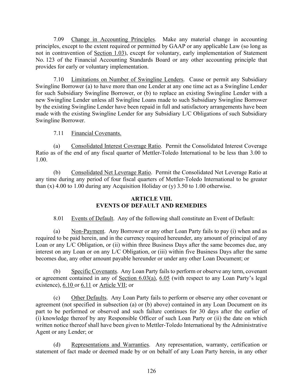 126 7.09 Change in Accounting Principles. Make any material change in accounting principles, except to the extent required or permitted by GAAP or any applicable Law (so long as not in contravention of Section 1.03), except for voluntary, early implementation of Statement No. 123 of the Financial Accounting Standards Board or any other accounting principle that provides for early or voluntary implementation. 7.10 Limitations on Number of Swingline Lenders. Cause or permit any Subsidiary Swingline Borrower (a) to have more than one Lender at any one time act as a Swingline Lender for such Subsidiary Swingline Borrower, or (b) to replace an existing Swingline Lender with a new Swingline Lender unless all Swingline Loans made to such Subsidiary Swingline Borrower by the existing Swingline Lender have been repaid in full and satisfactory arrangements have been made with the existing Swingline Lender for any Subsidiary L/C Obligations of such Subsidiary Swingline Borrower. 7.11 Financial Covenants. (a) Consolidated Interest Coverage Ratio. Permit the Consolidated Interest Coverage Ratio as of the end of any fiscal quarter of Mettler-Toledo International to be less than 3.00 to 1.00. (b) Consolidated Net Leverage Ratio. Permit the Consolidated Net Leverage Ratio at any time during any period of four fiscal quarters of Mettler-Toledo International to be greater than (x) 4.00 to 1.00 during any Acquisition Holiday or (y) 3.50 to 1.00 otherwise. ARTICLE VIII. EVENTS OF DEFAULT AND REMEDIES 8.01 Events of Default. Any of the following shall constitute an Event of Default: (a) Non-Payment. Any Borrower or any other Loan Party fails to pay (i) when and as required to be paid herein, and in the currency required hereunder, any amount of principal of any Loan or any L/C Obligation, or (ii) within three Business Days after the same becomes due, any interest on any Loan or on any L/C Obligation, or (iii) within five Business Days after the same becomes due, any other amount payable hereunder or under any other Loan Document; or (b) Specific Covenants. Any Loan Party fails to perform or observe any term, covenant or agreement contained in any of Section 6.03(a), 6.05 (with respect to any Loan Party’s legal existence), 6.10 or 6.11 or Article VII; or (c) Other Defaults. Any Loan Party fails to perform or observe any other covenant or agreement (not specified in subsection (a) or (b) above) contained in any Loan Document on its part to be performed or observed and such failure continues for 30 days after the earlier of (i) knowledge thereof by any Responsible Officer of such Loan Party or (ii) the date on which written notice thereof shall have been given to Mettler-Toledo International by the Administrative Agent or any Lender; or (d) Representations and Warranties. Any representation, warranty, certification or statement of fact made or deemed made by or on behalf of any Loan Party herein, in any other