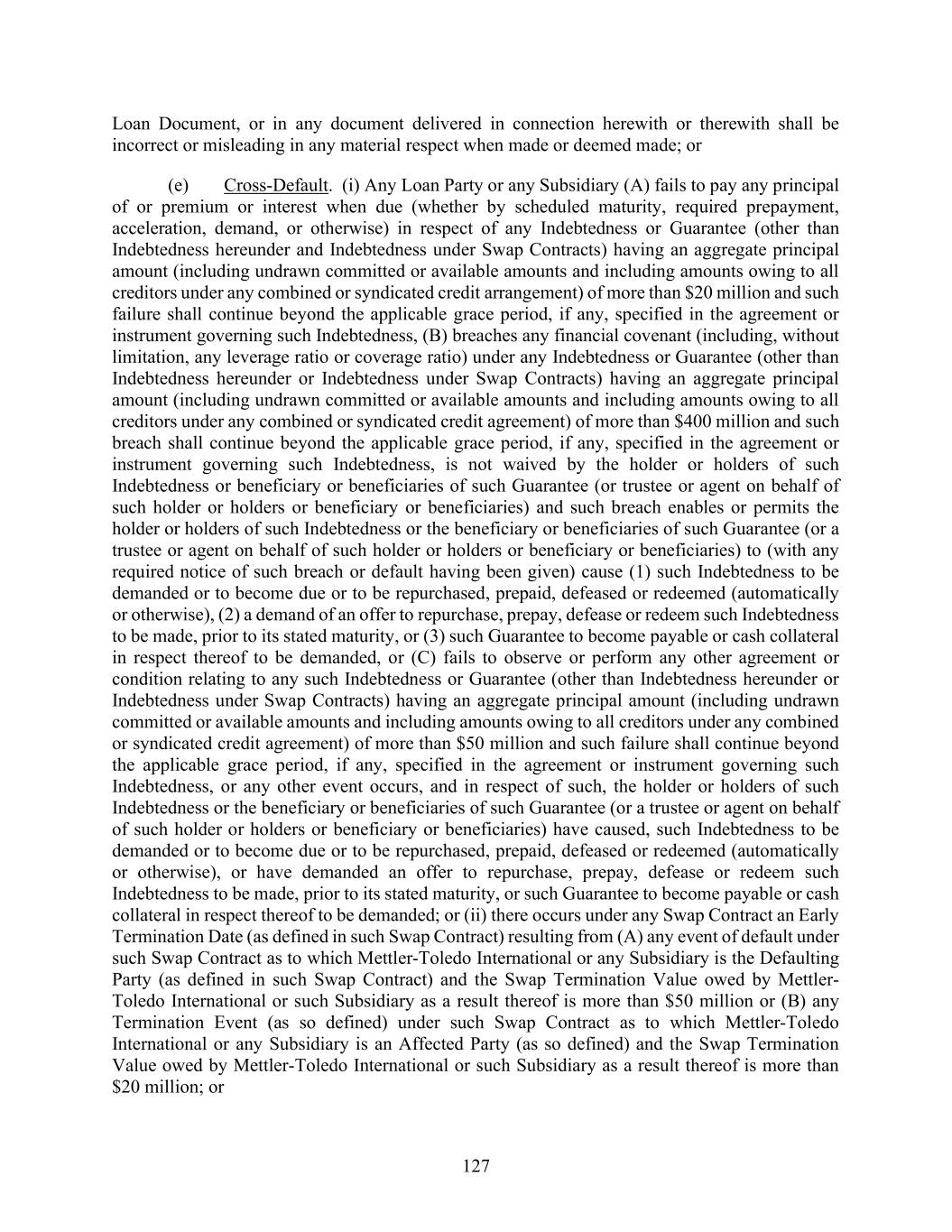 127 Loan Document, or in any document delivered in connection herewith or therewith shall be incorrect or misleading in any material respect when made or deemed made; or (e) Cross-Default. (i) Any Loan Party or any Subsidiary (A) fails to pay any principal of or premium or interest when due (whether by scheduled maturity, required prepayment, acceleration, demand, or otherwise) in respect of any Indebtedness or Guarantee (other than Indebtedness hereunder and Indebtedness under Swap Contracts) having an aggregate principal amount (including undrawn committed or available amounts and including amounts owing to all creditors under any combined or syndicated credit arrangement) of more than $20 million and such failure shall continue beyond the applicable grace period, if any, specified in the agreement or instrument governing such Indebtedness, (B) breaches any financial covenant (including, without limitation, any leverage ratio or coverage ratio) under any Indebtedness or Guarantee (other than Indebtedness hereunder or Indebtedness under Swap Contracts) having an aggregate principal amount (including undrawn committed or available amounts and including amounts owing to all creditors under any combined or syndicated credit agreement) of more than $400 million and such breach shall continue beyond the applicable grace period, if any, specified in the agreement or instrument governing such Indebtedness, is not waived by the holder or holders of such Indebtedness or beneficiary or beneficiaries of such Guarantee (or trustee or agent on behalf of such holder or holders or beneficiary or beneficiaries) and such breach enables or permits the holder or holders of such Indebtedness or the beneficiary or beneficiaries of such Guarantee (or a trustee or agent on behalf of such holder or holders or beneficiary or beneficiaries) to (with any required notice of such breach or default having been given) cause (1) such Indebtedness to be demanded or to become due or to be repurchased, prepaid, defeased or redeemed (automatically or otherwise), (2) a demand of an offer to repurchase, prepay, defease or redeem such Indebtedness to be made, prior to its stated maturity, or (3) such Guarantee to become payable or cash collateral in respect thereof to be demanded, or (C) fails to observe or perform any other agreement or condition relating to any such Indebtedness or Guarantee (other than Indebtedness hereunder or Indebtedness under Swap Contracts) having an aggregate principal amount (including undrawn committed or available amounts and including amounts owing to all creditors under any combined or syndicated credit agreement) of more than $50 million and such failure shall continue beyond the applicable grace period, if any, specified in the agreement or instrument governing such Indebtedness, or any other event occurs, and in respect of such, the holder or holders of such Indebtedness or the beneficiary or beneficiaries of such Guarantee (or a trustee or agent on behalf of such holder or holders or beneficiary or beneficiaries) have caused, such Indebtedness to be demanded or to become due or to be repurchased, prepaid, defeased or redeemed (automatically or otherwise), or have demanded an offer to repurchase, prepay, defease or redeem such Indebtedness to be made, prior to its stated maturity, or such Guarantee to become payable or cash collateral in respect thereof to be demanded; or (ii) there occurs under any Swap Contract an Early Termination Date (as defined in such Swap Contract) resulting from (A) any event of default under such Swap Contract as to which Mettler-Toledo International or any Subsidiary is the Defaulting Party (as defined in such Swap Contract) and the Swap Termination Value owed by Mettler- Toledo International or such Subsidiary as a result thereof is more than $50 million or (B) any Termination Event (as so defined) under such Swap Contract as to which Mettler-Toledo International or any Subsidiary is an Affected Party (as so defined) and the Swap Termination Value owed by Mettler-Toledo International or such Subsidiary as a result thereof is more than $20 million; or