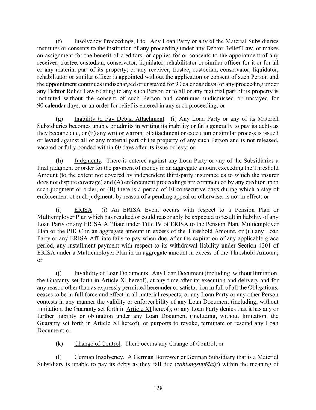 128 (f) Insolvency Proceedings, Etc. Any Loan Party or any of the Material Subsidiaries institutes or consents to the institution of any proceeding under any Debtor Relief Law, or makes an assignment for the benefit of creditors, or applies for or consents to the appointment of any receiver, trustee, custodian, conservator, liquidator, rehabilitator or similar officer for it or for all or any material part of its property; or any receiver, trustee, custodian, conservator, liquidator, rehabilitator or similar officer is appointed without the application or consent of such Person and the appointment continues undischarged or unstayed for 90 calendar days; or any proceeding under any Debtor Relief Law relating to any such Person or to all or any material part of its property is instituted without the consent of such Person and continues undismissed or unstayed for 90 calendar days, or an order for relief is entered in any such proceeding; or (g) Inability to Pay Debts; Attachment. (i) Any Loan Party or any of its Material Subsidiaries becomes unable or admits in writing its inability or fails generally to pay its debts as they become due, or (ii) any writ or warrant of attachment or execution or similar process is issued or levied against all or any material part of the property of any such Person and is not released, vacated or fully bonded within 60 days after its issue or levy; or (h) Judgments. There is entered against any Loan Party or any of the Subsidiaries a final judgment or order for the payment of money in an aggregate amount exceeding the Threshold Amount (to the extent not covered by independent third-party insurance as to which the insurer does not dispute coverage) and (A) enforcement proceedings are commenced by any creditor upon such judgment or order, or (B) there is a period of 10 consecutive days during which a stay of enforcement of such judgment, by reason of a pending appeal or otherwise, is not in effect; or (i) ERISA. (i) An ERISA Event occurs with respect to a Pension Plan or Multiemployer Plan which has resulted or could reasonably be expected to result in liability of any Loan Party or any ERISA Affiliate under Title IV of ERISA to the Pension Plan, Multiemployer Plan or the PBGC in an aggregate amount in excess of the Threshold Amount, or (ii) any Loan Party or any ERISA Affiliate fails to pay when due, after the expiration of any applicable grace period, any installment payment with respect to its withdrawal liability under Section 4201 of ERISA under a Multiemployer Plan in an aggregate amount in excess of the Threshold Amount; or (j) Invalidity of Loan Documents. Any Loan Document (including, without limitation, the Guaranty set forth in Article XI hereof), at any time after its execution and delivery and for any reason other than as expressly permitted hereunder or satisfaction in full of all the Obligations, ceases to be in full force and effect in all material respects; or any Loan Party or any other Person contests in any manner the validity or enforceability of any Loan Document (including, without limitation, the Guaranty set forth in Article XI hereof); or any Loan Party denies that it has any or further liability or obligation under any Loan Document (including, without limitation, the Guaranty set forth in Article XI hereof), or purports to revoke, terminate or rescind any Loan Document; or (k) Change of Control. There occurs any Change of Control; or (l) German Insolvency. A German Borrower or German Subsidiary that is a Material Subsidiary is unable to pay its debts as they fall due (zahlungsunfähig) within the meaning of