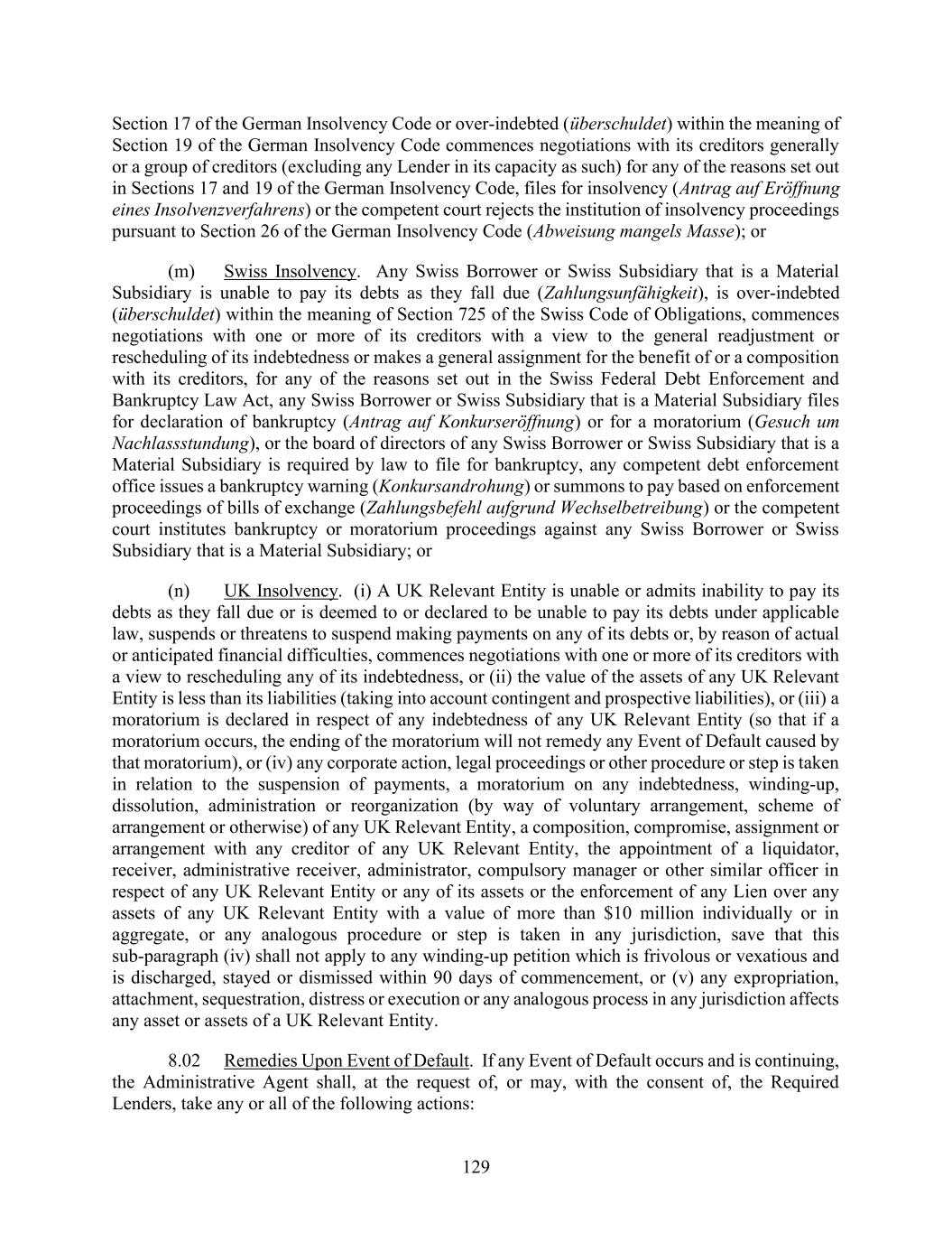 129 Section 17 of the German Insolvency Code or over-indebted (überschuldet) within the meaning of Section 19 of the German Insolvency Code commences negotiations with its creditors generally or a group of creditors (excluding any Lender in its capacity as such) for any of the reasons set out in Sections 17 and 19 of the German Insolvency Code, files for insolvency (Antrag auf Eröffnung eines Insolvenzverfahrens) or the competent court rejects the institution of insolvency proceedings pursuant to Section 26 of the German Insolvency Code (Abweisung mangels Masse); or (m) Swiss Insolvency. Any Swiss Borrower or Swiss Subsidiary that is a Material Subsidiary is unable to pay its debts as they fall due (Zahlungsunfähigkeit), is over-indebted (überschuldet) within the meaning of Section 725 of the Swiss Code of Obligations, commences negotiations with one or more of its creditors with a view to the general readjustment or rescheduling of its indebtedness or makes a general assignment for the benefit of or a composition with its creditors, for any of the reasons set out in the Swiss Federal Debt Enforcement and Bankruptcy Law Act, any Swiss Borrower or Swiss Subsidiary that is a Material Subsidiary files for declaration of bankruptcy (Antrag auf Konkurseröffnung) or for a moratorium (Gesuch um Nachlassstundung), or the board of directors of any Swiss Borrower or Swiss Subsidiary that is a Material Subsidiary is required by law to file for bankruptcy, any competent debt enforcement office issues a bankruptcy warning (Konkursandrohung) or summons to pay based on enforcement proceedings of bills of exchange (Zahlungsbefehl aufgrund Wechselbetreibung) or the competent court institutes bankruptcy or moratorium proceedings against any Swiss Borrower or Swiss Subsidiary that is a Material Subsidiary; or (n) UK Insolvency. (i) A UK Relevant Entity is unable or admits inability to pay its debts as they fall due or is deemed to or declared to be unable to pay its debts under applicable law, suspends or threatens to suspend making payments on any of its debts or, by reason of actual or anticipated financial difficulties, commences negotiations with one or more of its creditors with a view to rescheduling any of its indebtedness, or (ii) the value of the assets of any UK Relevant Entity is less than its liabilities (taking into account contingent and prospective liabilities), or (iii) a moratorium is declared in respect of any indebtedness of any UK Relevant Entity (so that if a moratorium occurs, the ending of the moratorium will not remedy any Event of Default caused by that moratorium), or (iv) any corporate action, legal proceedings or other procedure or step is taken in relation to the suspension of payments, a moratorium on any indebtedness, winding-up, dissolution, administration or reorganization (by way of voluntary arrangement, scheme of arrangement or otherwise) of any UK Relevant Entity, a composition, compromise, assignment or arrangement with any creditor of any UK Relevant Entity, the appointment of a liquidator, receiver, administrative receiver, administrator, compulsory manager or other similar officer in respect of any UK Relevant Entity or any of its assets or the enforcement of any Lien over any assets of any UK Relevant Entity with a value of more than $10 million individually or in aggregate, or any analogous procedure or step is taken in any jurisdiction, save that this sub-paragraph (iv) shall not apply to any winding-up petition which is frivolous or vexatious and is discharged, stayed or dismissed within 90 days of commencement, or (v) any expropriation, attachment, sequestration, distress or execution or any analogous process in any jurisdiction affects any asset or assets of a UK Relevant Entity. 8.02 Remedies Upon Event of Default. If any Event of Default occurs and is continuing, the Administrative Agent shall, at the request of, or may, with the consent of, the Required Lenders, take any or all of the following actions: