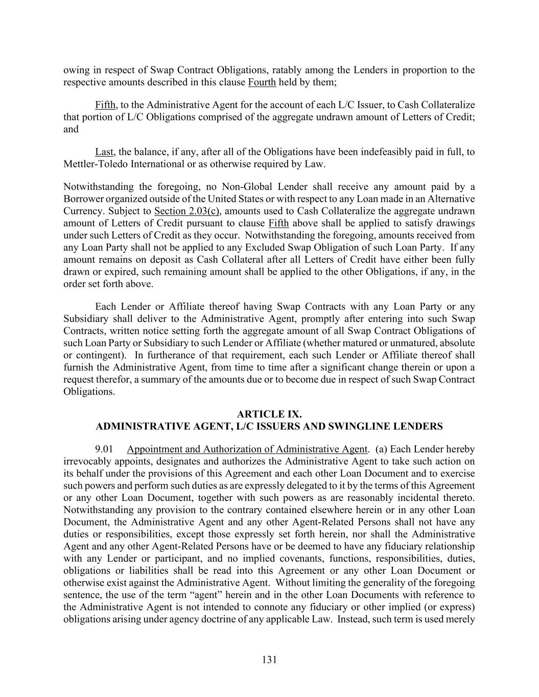 131 owing in respect of Swap Contract Obligations, ratably among the Lenders in proportion to the respective amounts described in this clause Fourth held by them; Fifth, to the Administrative Agent for the account of each L/C Issuer, to Cash Collateralize that portion of L/C Obligations comprised of the aggregate undrawn amount of Letters of Credit; and Last, the balance, if any, after all of the Obligations have been indefeasibly paid in full, to Mettler-Toledo International or as otherwise required by Law. Notwithstanding the foregoing, no Non-Global Lender shall receive any amount paid by a Borrower organized outside of the United States or with respect to any Loan made in an Alternative Currency. Subject to Section 2.03(c), amounts used to Cash Collateralize the aggregate undrawn amount of Letters of Credit pursuant to clause Fifth above shall be applied to satisfy drawings under such Letters of Credit as they occur. Notwithstanding the foregoing, amounts received from any Loan Party shall not be applied to any Excluded Swap Obligation of such Loan Party. If any amount remains on deposit as Cash Collateral after all Letters of Credit have either been fully drawn or expired, such remaining amount shall be applied to the other Obligations, if any, in the order set forth above. Each Lender or Affiliate thereof having Swap Contracts with any Loan Party or any Subsidiary shall deliver to the Administrative Agent, promptly after entering into such Swap Contracts, written notice setting forth the aggregate amount of all Swap Contract Obligations of such Loan Party or Subsidiary to such Lender or Affiliate (whether matured or unmatured, absolute or contingent). In furtherance of that requirement, each such Lender or Affiliate thereof shall furnish the Administrative Agent, from time to time after a significant change therein or upon a request therefor, a summary of the amounts due or to become due in respect of such Swap Contract Obligations. ARTICLE IX. ADMINISTRATIVE AGENT, L/C ISSUERS AND SWINGLINE LENDERS 9.01 Appointment and Authorization of Administrative Agent. (a) Each Lender hereby irrevocably appoints, designates and authorizes the Administrative Agent to take such action on its behalf under the provisions of this Agreement and each other Loan Document and to exercise such powers and perform such duties as are expressly delegated to it by the terms of this Agreement or any other Loan Document, together with such powers as are reasonably incidental thereto. Notwithstanding any provision to the contrary contained elsewhere herein or in any other Loan Document, the Administrative Agent and any other Agent-Related Persons shall not have any duties or responsibilities, except those expressly set forth herein, nor shall the Administrative Agent and any other Agent-Related Persons have or be deemed to have any fiduciary relationship with any Lender or participant, and no implied covenants, functions, responsibilities, duties, obligations or liabilities shall be read into this Agreement or any other Loan Document or otherwise exist against the Administrative Agent. Without limiting the generality of the foregoing sentence, the use of the term “agent” herein and in the other Loan Documents with reference to the Administrative Agent is not intended to connote any fiduciary or other implied (or express) obligations arising under agency doctrine of any applicable Law. Instead, such term is used merely