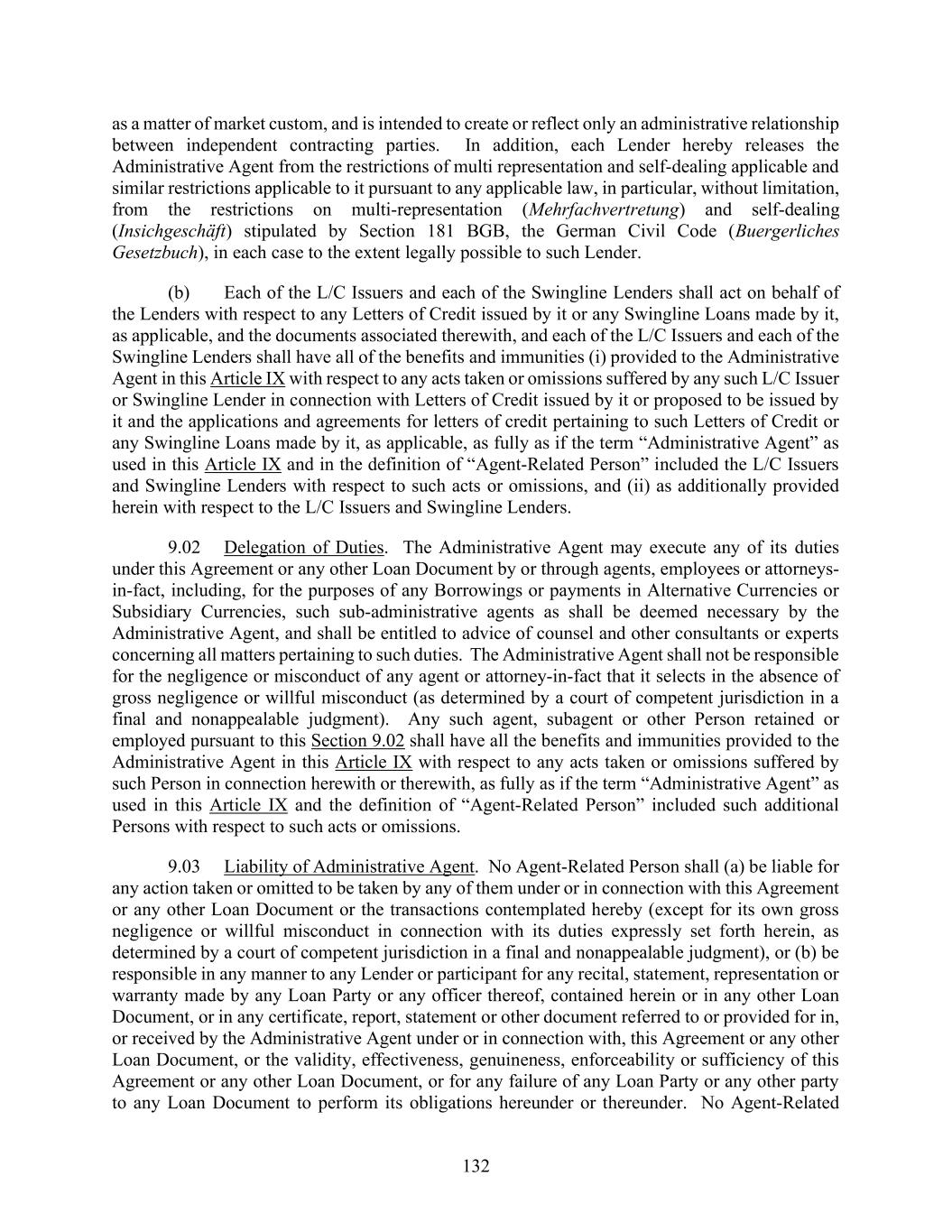 132 as a matter of market custom, and is intended to create or reflect only an administrative relationship between independent contracting parties. In addition, each Lender hereby releases the Administrative Agent from the restrictions of multi representation and self-dealing applicable and similar restrictions applicable to it pursuant to any applicable law, in particular, without limitation, from the restrictions on multi-representation (Mehrfachvertretung) and self-dealing (Insichgeschäft) stipulated by Section 181 BGB, the German Civil Code (Buergerliches Gesetzbuch), in each case to the extent legally possible to such Lender. (b) Each of the L/C Issuers and each of the Swingline Lenders shall act on behalf of the Lenders with respect to any Letters of Credit issued by it or any Swingline Loans made by it, as applicable, and the documents associated therewith, and each of the L/C Issuers and each of the Swingline Lenders shall have all of the benefits and immunities (i) provided to the Administrative Agent in this Article IX with respect to any acts taken or omissions suffered by any such L/C Issuer or Swingline Lender in connection with Letters of Credit issued by it or proposed to be issued by it and the applications and agreements for letters of credit pertaining to such Letters of Credit or any Swingline Loans made by it, as applicable, as fully as if the term “Administrative Agent” as used in this Article IX and in the definition of “Agent-Related Person” included the L/C Issuers and Swingline Lenders with respect to such acts or omissions, and (ii) as additionally provided herein with respect to the L/C Issuers and Swingline Lenders. 9.02 Delegation of Duties. The Administrative Agent may execute any of its duties under this Agreement or any other Loan Document by or through agents, employees or attorneys- in-fact, including, for the purposes of any Borrowings or payments in Alternative Currencies or Subsidiary Currencies, such sub-administrative agents as shall be deemed necessary by the Administrative Agent, and shall be entitled to advice of counsel and other consultants or experts concerning all matters pertaining to such duties. The Administrative Agent shall not be responsible for the negligence or misconduct of any agent or attorney-in-fact that it selects in the absence of gross negligence or willful misconduct (as determined by a court of competent jurisdiction in a final and nonappealable judgment). Any such agent, subagent or other Person retained or employed pursuant to this Section 9.02 shall have all the benefits and immunities provided to the Administrative Agent in this Article IX with respect to any acts taken or omissions suffered by such Person in connection herewith or therewith, as fully as if the term “Administrative Agent” as used in this Article IX and the definition of “Agent-Related Person” included such additional Persons with respect to such acts or omissions. 9.03 Liability of Administrative Agent. No Agent-Related Person shall (a) be liable for any action taken or omitted to be taken by any of them under or in connection with this Agreement or any other Loan Document or the transactions contemplated hereby (except for its own gross negligence or willful misconduct in connection with its duties expressly set forth herein, as determined by a court of competent jurisdiction in a final and nonappealable judgment), or (b) be responsible in any manner to any Lender or participant for any recital, statement, representation or warranty made by any Loan Party or any officer thereof, contained herein or in any other Loan Document, or in any certificate, report, statement or other document referred to or provided for in, or received by the Administrative Agent under or in connection with, this Agreement or any other Loan Document, or the validity, effectiveness, genuineness, enforceability or sufficiency of this Agreement or any other Loan Document, or for any failure of any Loan Party or any other party to any Loan Document to perform its obligations hereunder or thereunder. No Agent-Related