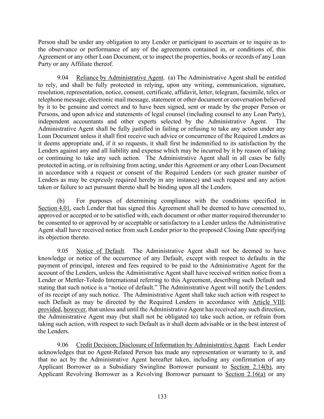 133 Person shall be under any obligation to any Lender or participant to ascertain or to inquire as to the observance or performance of any of the agreements contained in, or conditions of, this Agreement or any other Loan Document, or to inspect the properties, books or records of any Loan Party or any Affiliate thereof. 9.04 Reliance by Administrative Agent. (a) The Administrative Agent shall be entitled to rely, and shall be fully protected in relying, upon any writing, communication, signature, resolution, representation, notice, consent, certificate, affidavit, letter, telegram, facsimile, telex or telephone message, electronic mail message, statement or other document or conversation believed by it to be genuine and correct and to have been signed, sent or made by the proper Person or Persons, and upon advice and statements of legal counsel (including counsel to any Loan Party), independent accountants and other experts selected by the Administrative Agent. The Administrative Agent shall be fully justified in failing or refusing to take any action under any Loan Document unless it shall first receive such advice or concurrence of the Required Lenders as it deems appropriate and, if it so requests, it shall first be indemnified to its satisfaction by the Lenders against any and all liability and expense which may be incurred by it by reason of taking or continuing to take any such action. The Administrative Agent shall in all cases be fully protected in acting, or in refraining from acting, under this Agreement or any other Loan Document in accordance with a request or consent of the Required Lenders (or such greater number of Lenders as may be expressly required hereby in any instance) and such request and any action taken or failure to act pursuant thereto shall be binding upon all the Lenders. (b) For purposes of determining compliance with the conditions specified in Section 4.01, each Lender that has signed this Agreement shall be deemed to have consented to, approved or accepted or to be satisfied with, each document or other matter required thereunder to be consented to or approved by or acceptable or satisfactory to a Lender unless the Administrative Agent shall have received notice from such Lender prior to the proposed Closing Date specifying its objection thereto. 9.05 Notice of Default. The Administrative Agent shall not be deemed to have knowledge or notice of the occurrence of any Default, except with respect to defaults in the payment of principal, interest and fees required to be paid to the Administrative Agent for the account of the Lenders, unless the Administrative Agent shall have received written notice from a Lender or Mettler-Toledo International referring to this Agreement, describing such Default and stating that such notice is a “notice of default.” The Administrative Agent will notify the Lenders of its receipt of any such notice. The Administrative Agent shall take such action with respect to such Default as may be directed by the Required Lenders in accordance with Article VIII; provided, however, that unless and until the Administrative Agent has received any such direction, the Administrative Agent may (but shall not be obligated to) take such action, or refrain from taking such action, with respect to such Default as it shall deem advisable or in the best interest of the Lenders. 9.06 Credit Decision; Disclosure of Information by Administrative Agent. Each Lender acknowledges that no Agent-Related Person has made any representation or warranty to it, and that no act by the Administrative Agent hereafter taken, including any confirmation of any Applicant Borrower as a Subsidiary Swingline Borrower pursuant to Section 2.14(b), any Applicant Revolving Borrower as a Revolving Borrower pursuant to Section 2.16(a) or any
