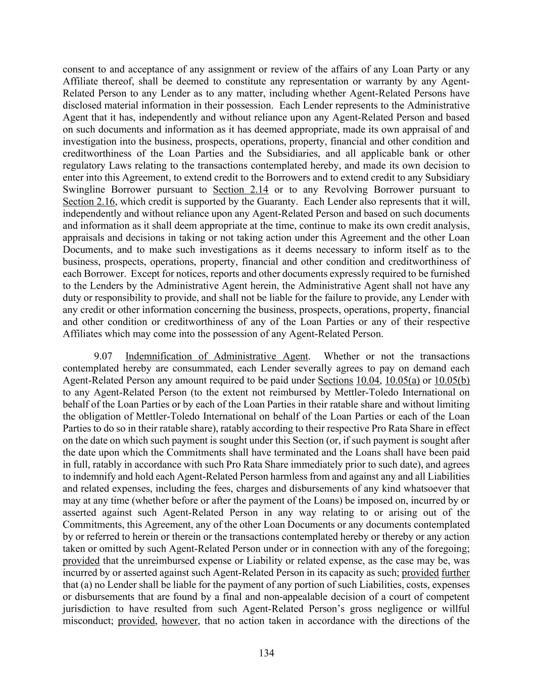 134 consent to and acceptance of any assignment or review of the affairs of any Loan Party or any Affiliate thereof, shall be deemed to constitute any representation or warranty by any Agent- Related Person to any Lender as to any matter, including whether Agent-Related Persons have disclosed material information in their possession. Each Lender represents to the Administrative Agent that it has, independently and without reliance upon any Agent-Related Person and based on such documents and information as it has deemed appropriate, made its own appraisal of and investigation into the business, prospects, operations, property, financial and other condition and creditworthiness of the Loan Parties and the Subsidiaries, and all applicable bank or other regulatory Laws relating to the transactions contemplated hereby, and made its own decision to enter into this Agreement, to extend credit to the Borrowers and to extend credit to any Subsidiary Swingline Borrower pursuant to Section 2.14 or to any Revolving Borrower pursuant to Section 2.16, which credit is supported by the Guaranty. Each Lender also represents that it will, independently and without reliance upon any Agent-Related Person and based on such documents and information as it shall deem appropriate at the time, continue to make its own credit analysis, appraisals and decisions in taking or not taking action under this Agreement and the other Loan Documents, and to make such investigations as it deems necessary to inform itself as to the business, prospects, operations, property, financial and other condition and creditworthiness of each Borrower. Except for notices, reports and other documents expressly required to be furnished to the Lenders by the Administrative Agent herein, the Administrative Agent shall not have any duty or responsibility to provide, and shall not be liable for the failure to provide, any Lender with any credit or other information concerning the business, prospects, operations, property, financial and other condition or creditworthiness of any of the Loan Parties or any of their respective Affiliates which may come into the possession of any Agent-Related Person. 9.07 Indemnification of Administrative Agent. Whether or not the transactions contemplated hereby are consummated, each Lender severally agrees to pay on demand each Agent-Related Person any amount required to be paid under Sections 10.04, 10.05(a) or 10.05(b) to any Agent-Related Person (to the extent not reimbursed by Mettler-Toledo International on behalf of the Loan Parties or by each of the Loan Parties in their ratable share and without limiting the obligation of Mettler-Toledo International on behalf of the Loan Parties or each of the Loan Parties to do so in their ratable share), ratably according to their respective Pro Rata Share in effect on the date on which such payment is sought under this Section (or, if such payment is sought after the date upon which the Commitments shall have terminated and the Loans shall have been paid in full, ratably in accordance with such Pro Rata Share immediately prior to such date), and agrees to indemnify and hold each Agent-Related Person harmless from and against any and all Liabilities and related expenses, including the fees, charges and disbursements of any kind whatsoever that may at any time (whether before or after the payment of the Loans) be imposed on, incurred by or asserted against such Agent-Related Person in any way relating to or arising out of the Commitments, this Agreement, any of the other Loan Documents or any documents contemplated by or referred to herein or therein or the transactions contemplated hereby or thereby or any action taken or omitted by such Agent-Related Person under or in connection with any of the foregoing; provided that the unreimbursed expense or Liability or related expense, as the case may be, was incurred by or asserted against such Agent-Related Person in its capacity as such; provided further that (a) no Lender shall be liable for the payment of any portion of such Liabilities, costs, expenses or disbursements that are found by a final and non-appealable decision of a court of competent jurisdiction to have resulted from such Agent-Related Person’s gross negligence or willful misconduct; provided, however, that no action taken in accordance with the directions of the
