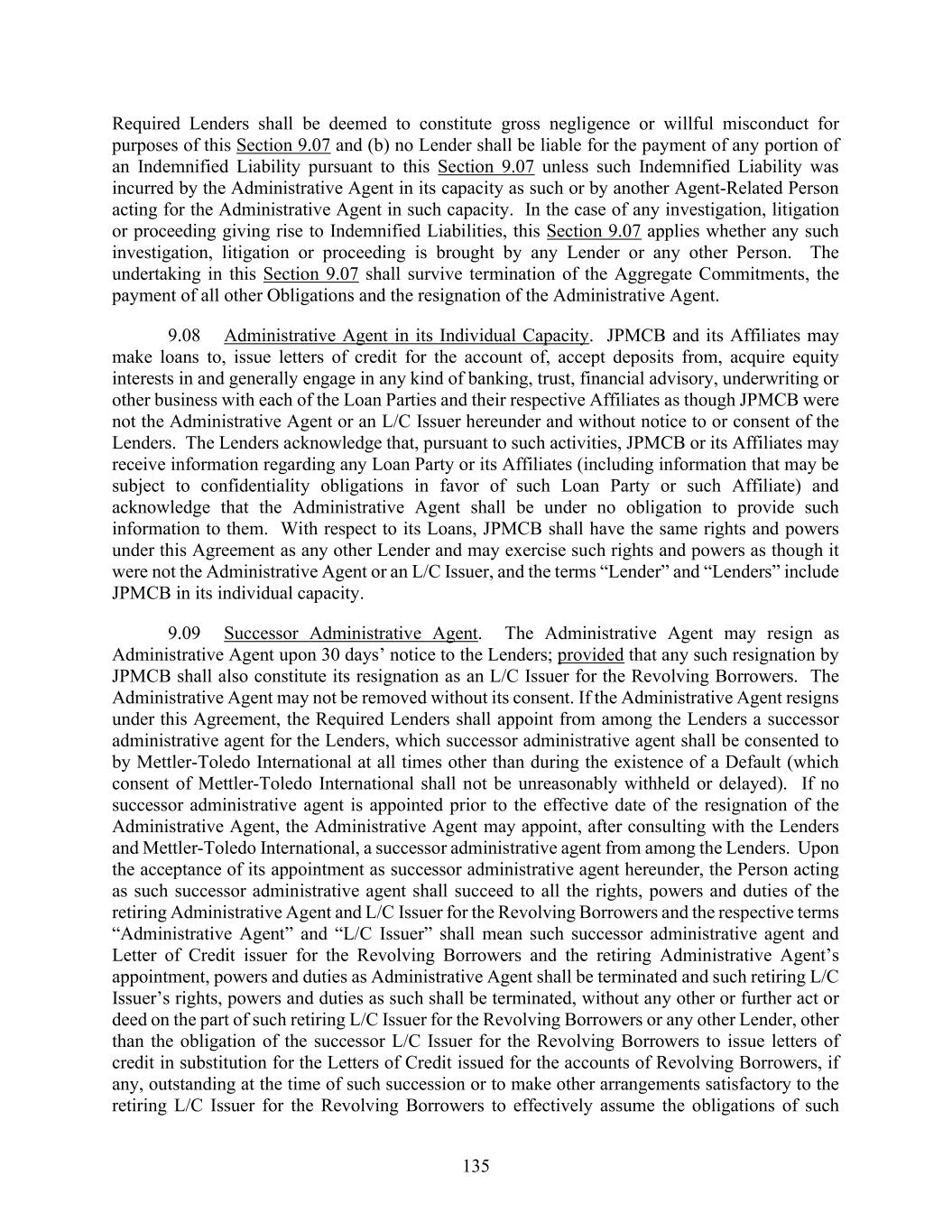 135 Required Lenders shall be deemed to constitute gross negligence or willful misconduct for purposes of this Section 9.07 and (b) no Lender shall be liable for the payment of any portion of an Indemnified Liability pursuant to this Section 9.07 unless such Indemnified Liability was incurred by the Administrative Agent in its capacity as such or by another Agent-Related Person acting for the Administrative Agent in such capacity. In the case of any investigation, litigation or proceeding giving rise to Indemnified Liabilities, this Section 9.07 applies whether any such investigation, litigation or proceeding is brought by any Lender or any other Person. The undertaking in this Section 9.07 shall survive termination of the Aggregate Commitments, the payment of all other Obligations and the resignation of the Administrative Agent. 9.08 Administrative Agent in its Individual Capacity. JPMCB and its Affiliates may make loans to, issue letters of credit for the account of, accept deposits from, acquire equity interests in and generally engage in any kind of banking, trust, financial advisory, underwriting or other business with each of the Loan Parties and their respective Affiliates as though JPMCB were not the Administrative Agent or an L/C Issuer hereunder and without notice to or consent of the Lenders. The Lenders acknowledge that, pursuant to such activities, JPMCB or its Affiliates may receive information regarding any Loan Party or its Affiliates (including information that may be subject to confidentiality obligations in favor of such Loan Party or such Affiliate) and acknowledge that the Administrative Agent shall be under no obligation to provide such information to them. With respect to its Loans, JPMCB shall have the same rights and powers under this Agreement as any other Lender and may exercise such rights and powers as though it were not the Administrative Agent or an L/C Issuer, and the terms “Lender” and “Lenders” include JPMCB in its individual capacity. 9.09 Successor Administrative Agent. The Administrative Agent may resign as Administrative Agent upon 30 days’ notice to the Lenders; provided that any such resignation by JPMCB shall also constitute its resignation as an L/C Issuer for the Revolving Borrowers. The Administrative Agent may not be removed without its consent. If the Administrative Agent resigns under this Agreement, the Required Lenders shall appoint from among the Lenders a successor administrative agent for the Lenders, which successor administrative agent shall be consented to by Mettler-Toledo International at all times other than during the existence of a Default (which consent of Mettler-Toledo International shall not be unreasonably withheld or delayed). If no successor administrative agent is appointed prior to the effective date of the resignation of the Administrative Agent, the Administrative Agent may appoint, after consulting with the Lenders and Mettler-Toledo International, a successor administrative agent from among the Lenders. Upon the acceptance of its appointment as successor administrative agent hereunder, the Person acting as such successor administrative agent shall succeed to all the rights, powers and duties of the retiring Administrative Agent and L/C Issuer for the Revolving Borrowers and the respective terms “Administrative Agent” and “L/C Issuer” shall mean such successor administrative agent and Letter of Credit issuer for the Revolving Borrowers and the retiring Administrative Agent’s appointment, powers and duties as Administrative Agent shall be terminated and such retiring L/C Issuer’s rights, powers and duties as such shall be terminated, without any other or further act or deed on the part of such retiring L/C Issuer for the Revolving Borrowers or any other Lender, other than the obligation of the successor L/C Issuer for the Revolving Borrowers to issue letters of credit in substitution for the Letters of Credit issued for the accounts of Revolving Borrowers, if any, outstanding at the time of such succession or to make other arrangements satisfactory to the retiring L/C Issuer for the Revolving Borrowers to effectively assume the obligations of such