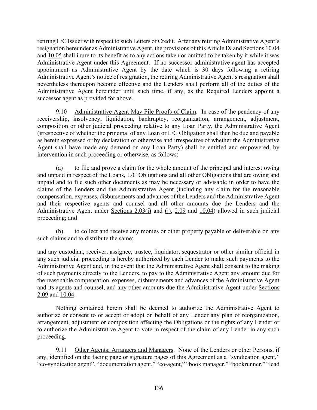 136 retiring L/C Issuer with respect to such Letters of Credit. After any retiring Administrative Agent’s resignation hereunder as Administrative Agent, the provisions of this Article IX and Sections 10.04 and 10.05 shall inure to its benefit as to any actions taken or omitted to be taken by it while it was Administrative Agent under this Agreement. If no successor administrative agent has accepted appointment as Administrative Agent by the date which is 30 days following a retiring Administrative Agent’s notice of resignation, the retiring Administrative Agent’s resignation shall nevertheless thereupon become effective and the Lenders shall perform all of the duties of the Administrative Agent hereunder until such time, if any, as the Required Lenders appoint a successor agent as provided for above. 9.10 Administrative Agent May File Proofs of Claim. In case of the pendency of any receivership, insolvency, liquidation, bankruptcy, reorganization, arrangement, adjustment, composition or other judicial proceeding relative to any Loan Party, the Administrative Agent (irrespective of whether the principal of any Loan or L/C Obligation shall then be due and payable as herein expressed or by declaration or otherwise and irrespective of whether the Administrative Agent shall have made any demand on any Loan Party) shall be entitled and empowered, by intervention in such proceeding or otherwise, as follows: (a) to file and prove a claim for the whole amount of the principal and interest owing and unpaid in respect of the Loans, L/C Obligations and all other Obligations that are owing and unpaid and to file such other documents as may be necessary or advisable in order to have the claims of the Lenders and the Administrative Agent (including any claim for the reasonable compensation, expenses, disbursements and advances of the Lenders and the Administrative Agent and their respective agents and counsel and all other amounts due the Lenders and the Administrative Agent under Sections 2.03(i) and (j), 2.09 and 10.04) allowed in such judicial proceeding; and (b) to collect and receive any monies or other property payable or deliverable on any such claims and to distribute the same; and any custodian, receiver, assignee, trustee, liquidator, sequestrator or other similar official in any such judicial proceeding is hereby authorized by each Lender to make such payments to the Administrative Agent and, in the event that the Administrative Agent shall consent to the making of such payments directly to the Lenders, to pay to the Administrative Agent any amount due for the reasonable compensation, expenses, disbursements and advances of the Administrative Agent and its agents and counsel, and any other amounts due the Administrative Agent under Sections 2.09 and 10.04. Nothing contained herein shall be deemed to authorize the Administrative Agent to authorize or consent to or accept or adopt on behalf of any Lender any plan of reorganization, arrangement, adjustment or composition affecting the Obligations or the rights of any Lender or to authorize the Administrative Agent to vote in respect of the claim of any Lender in any such proceeding. 9.11 Other Agents; Arrangers and Managers. None of the Lenders or other Persons, if any, identified on the facing page or signature pages of this Agreement as a “syndication agent,” “co-syndication agent”, “documentation agent,” “co-agent,” “book manager,” “bookrunner,” “lead