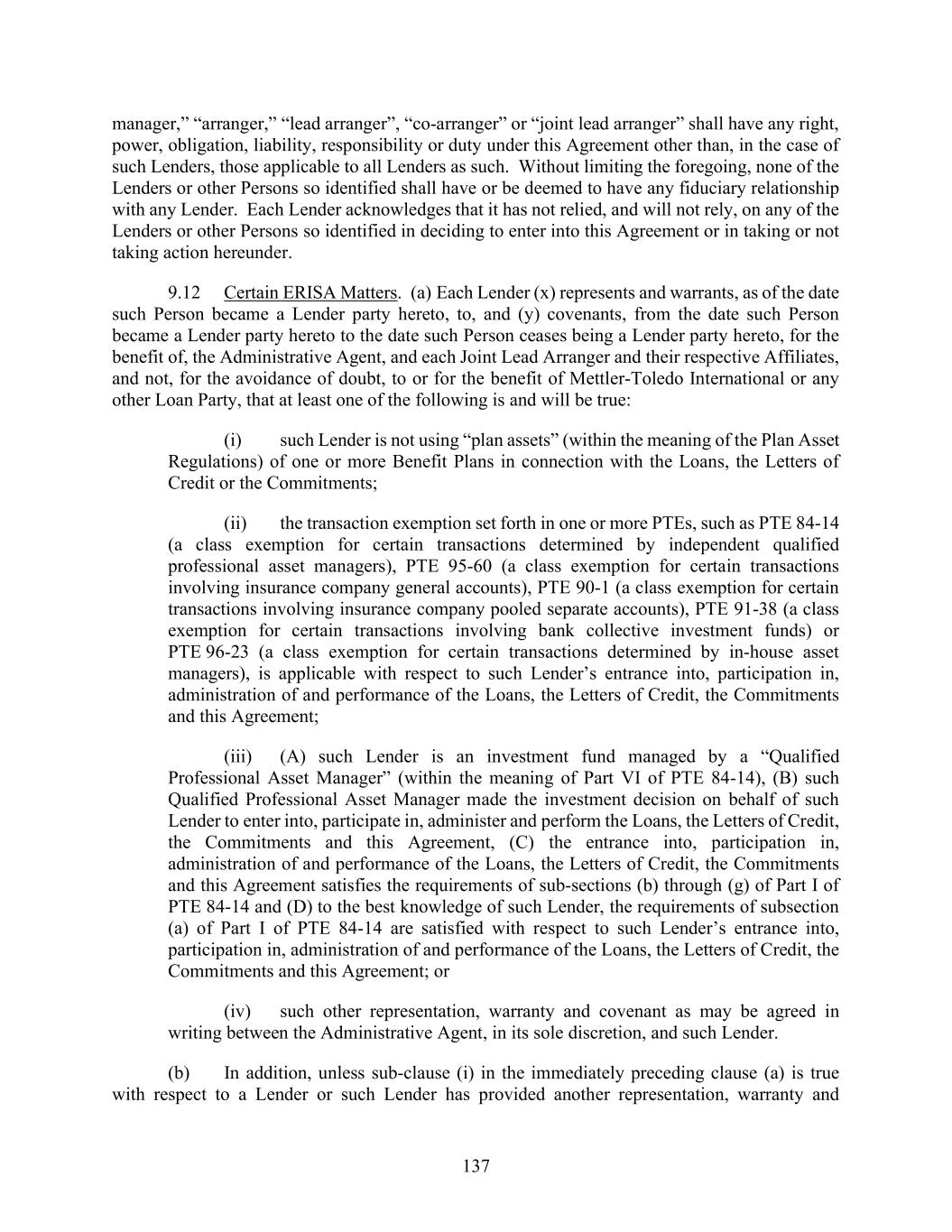 137 manager,” “arranger,” “lead arranger”, “co-arranger” or “joint lead arranger” shall have any right, power, obligation, liability, responsibility or duty under this Agreement other than, in the case of such Lenders, those applicable to all Lenders as such. Without limiting the foregoing, none of the Lenders or other Persons so identified shall have or be deemed to have any fiduciary relationship with any Lender. Each Lender acknowledges that it has not relied, and will not rely, on any of the Lenders or other Persons so identified in deciding to enter into this Agreement or in taking or not taking action hereunder. 9.12 Certain ERISA Matters. (a) Each Lender (x) represents and warrants, as of the date such Person became a Lender party hereto, to, and (y) covenants, from the date such Person became a Lender party hereto to the date such Person ceases being a Lender party hereto, for the benefit of, the Administrative Agent, and each Joint Lead Arranger and their respective Affiliates, and not, for the avoidance of doubt, to or for the benefit of Mettler-Toledo International or any other Loan Party, that at least one of the following is and will be true: (i) such Lender is not using “plan assets” (within the meaning of the Plan Asset Regulations) of one or more Benefit Plans in connection with the Loans, the Letters of Credit or the Commitments; (ii) the transaction exemption set forth in one or more PTEs, such as PTE 84-14 (a class exemption for certain transactions determined by independent qualified professional asset managers), PTE 95-60 (a class exemption for certain transactions involving insurance company general accounts), PTE 90-1 (a class exemption for certain transactions involving insurance company pooled separate accounts), PTE 91-38 (a class exemption for certain transactions involving bank collective investment funds) or PTE 96-23 (a class exemption for certain transactions determined by in-house asset managers), is applicable with respect to such Lender’s entrance into, participation in, administration of and performance of the Loans, the Letters of Credit, the Commitments and this Agreement; (iii) (A) such Lender is an investment fund managed by a “Qualified Professional Asset Manager” (within the meaning of Part VI of PTE 84-14), (B) such Qualified Professional Asset Manager made the investment decision on behalf of such Lender to enter into, participate in, administer and perform the Loans, the Letters of Credit, the Commitments and this Agreement, (C) the entrance into, participation in, administration of and performance of the Loans, the Letters of Credit, the Commitments and this Agreement satisfies the requirements of sub-sections (b) through (g) of Part I of PTE 84-14 and (D) to the best knowledge of such Lender, the requirements of subsection (a) of Part I of PTE 84-14 are satisfied with respect to such Lender’s entrance into, participation in, administration of and performance of the Loans, the Letters of Credit, the Commitments and this Agreement; or (iv) such other representation, warranty and covenant as may be agreed in writing between the Administrative Agent, in its sole discretion, and such Lender. (b) In addition, unless sub-clause (i) in the immediately preceding clause (a) is true with respect to a Lender or such Lender has provided another representation, warranty and