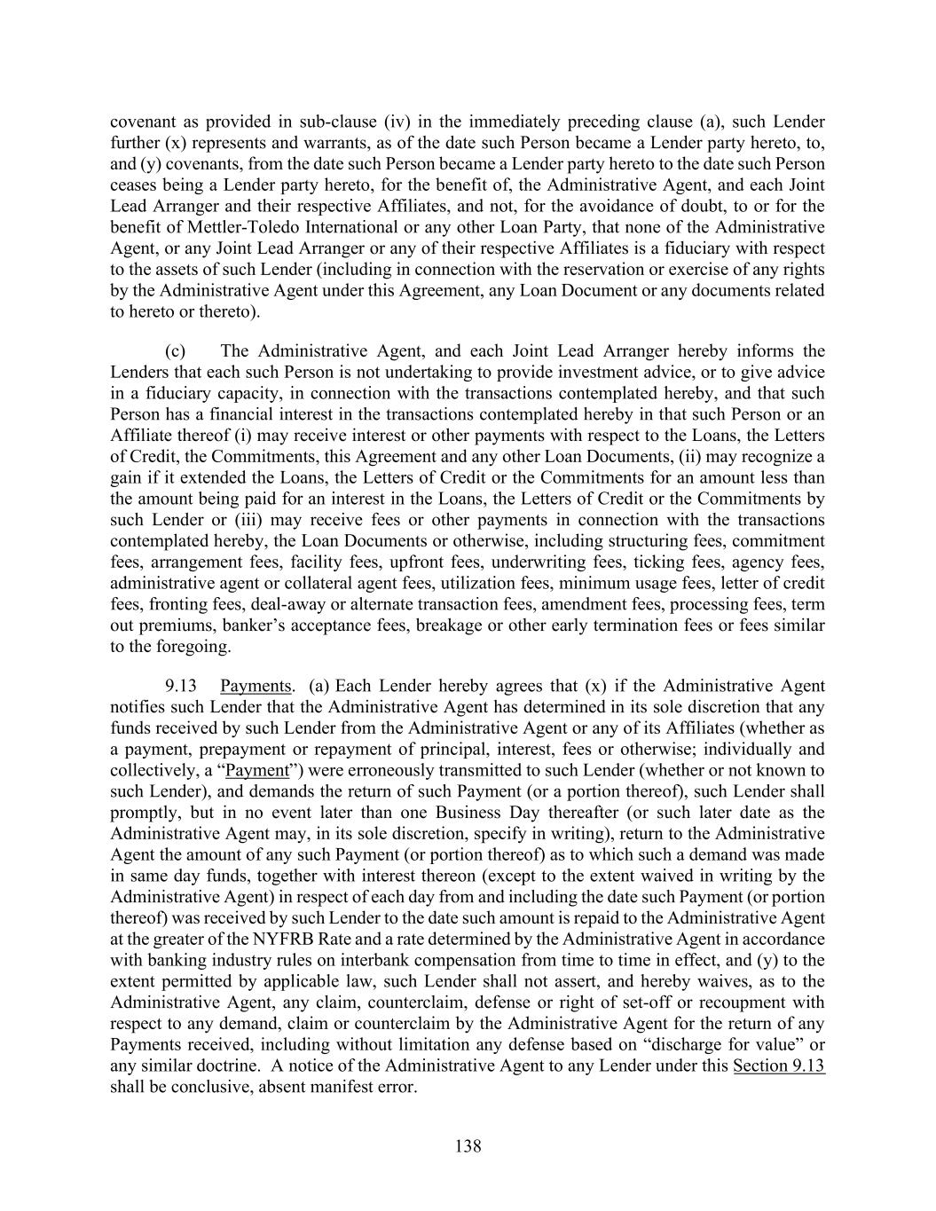 138 covenant as provided in sub-clause (iv) in the immediately preceding clause (a), such Lender further (x) represents and warrants, as of the date such Person became a Lender party hereto, to, and (y) covenants, from the date such Person became a Lender party hereto to the date such Person ceases being a Lender party hereto, for the benefit of, the Administrative Agent, and each Joint Lead Arranger and their respective Affiliates, and not, for the avoidance of doubt, to or for the benefit of Mettler-Toledo International or any other Loan Party, that none of the Administrative Agent, or any Joint Lead Arranger or any of their respective Affiliates is a fiduciary with respect to the assets of such Lender (including in connection with the reservation or exercise of any rights by the Administrative Agent under this Agreement, any Loan Document or any documents related to hereto or thereto). (c) The Administrative Agent, and each Joint Lead Arranger hereby informs the Lenders that each such Person is not undertaking to provide investment advice, or to give advice in a fiduciary capacity, in connection with the transactions contemplated hereby, and that such Person has a financial interest in the transactions contemplated hereby in that such Person or an Affiliate thereof (i) may receive interest or other payments with respect to the Loans, the Letters of Credit, the Commitments, this Agreement and any other Loan Documents, (ii) may recognize a gain if it extended the Loans, the Letters of Credit or the Commitments for an amount less than the amount being paid for an interest in the Loans, the Letters of Credit or the Commitments by such Lender or (iii) may receive fees or other payments in connection with the transactions contemplated hereby, the Loan Documents or otherwise, including structuring fees, commitment fees, arrangement fees, facility fees, upfront fees, underwriting fees, ticking fees, agency fees, administrative agent or collateral agent fees, utilization fees, minimum usage fees, letter of credit fees, fronting fees, deal-away or alternate transaction fees, amendment fees, processing fees, term out premiums, banker’s acceptance fees, breakage or other early termination fees or fees similar to the foregoing. 9.13 Payments. (a) Each Lender hereby agrees that (x) if the Administrative Agent notifies such Lender that the Administrative Agent has determined in its sole discretion that any funds received by such Lender from the Administrative Agent or any of its Affiliates (whether as a payment, prepayment or repayment of principal, interest, fees or otherwise; individually and collectively, a “Payment”) were erroneously transmitted to such Lender (whether or not known to such Lender), and demands the return of such Payment (or a portion thereof), such Lender shall promptly, but in no event later than one Business Day thereafter (or such later date as the Administrative Agent may, in its sole discretion, specify in writing), return to the Administrative Agent the amount of any such Payment (or portion thereof) as to which such a demand was made in same day funds, together with interest thereon (except to the extent waived in writing by the Administrative Agent) in respect of each day from and including the date such Payment (or portion thereof) was received by such Lender to the date such amount is repaid to the Administrative Agent at the greater of the NYFRB Rate and a rate determined by the Administrative Agent in accordance with banking industry rules on interbank compensation from time to time in effect, and (y) to the extent permitted by applicable law, such Lender shall not assert, and hereby waives, as to the Administrative Agent, any claim, counterclaim, defense or right of set-off or recoupment with respect to any demand, claim or counterclaim by the Administrative Agent for the return of any Payments received, including without limitation any defense based on “discharge for value” or any similar doctrine. A notice of the Administrative Agent to any Lender under this Section 9.13 shall be conclusive, absent manifest error.
