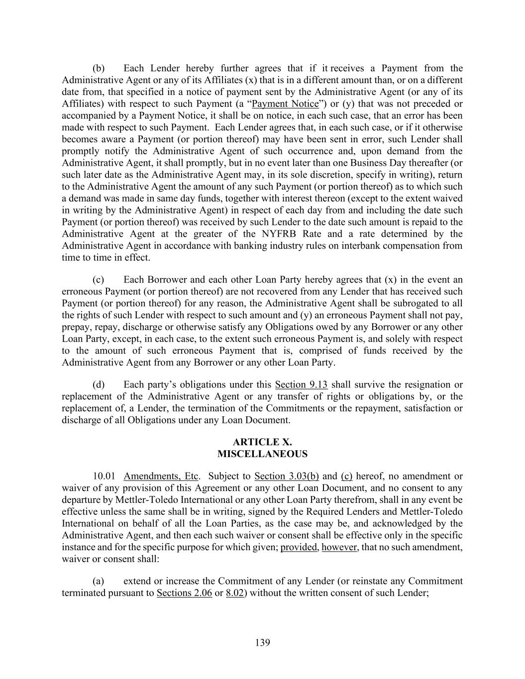 139 (b) Each Lender hereby further agrees that if it receives a Payment from the Administrative Agent or any of its Affiliates (x) that is in a different amount than, or on a different date from, that specified in a notice of payment sent by the Administrative Agent (or any of its Affiliates) with respect to such Payment (a “Payment Notice”) or (y) that was not preceded or accompanied by a Payment Notice, it shall be on notice, in each such case, that an error has been made with respect to such Payment. Each Lender agrees that, in each such case, or if it otherwise becomes aware a Payment (or portion thereof) may have been sent in error, such Lender shall promptly notify the Administrative Agent of such occurrence and, upon demand from the Administrative Agent, it shall promptly, but in no event later than one Business Day thereafter (or such later date as the Administrative Agent may, in its sole discretion, specify in writing), return to the Administrative Agent the amount of any such Payment (or portion thereof) as to which such a demand was made in same day funds, together with interest thereon (except to the extent waived in writing by the Administrative Agent) in respect of each day from and including the date such Payment (or portion thereof) was received by such Lender to the date such amount is repaid to the Administrative Agent at the greater of the NYFRB Rate and a rate determined by the Administrative Agent in accordance with banking industry rules on interbank compensation from time to time in effect. (c) Each Borrower and each other Loan Party hereby agrees that (x) in the event an erroneous Payment (or portion thereof) are not recovered from any Lender that has received such Payment (or portion thereof) for any reason, the Administrative Agent shall be subrogated to all the rights of such Lender with respect to such amount and (y) an erroneous Payment shall not pay, prepay, repay, discharge or otherwise satisfy any Obligations owed by any Borrower or any other Loan Party, except, in each case, to the extent such erroneous Payment is, and solely with respect to the amount of such erroneous Payment that is, comprised of funds received by the Administrative Agent from any Borrower or any other Loan Party. (d) Each party’s obligations under this Section 9.13 shall survive the resignation or replacement of the Administrative Agent or any transfer of rights or obligations by, or the replacement of, a Lender, the termination of the Commitments or the repayment, satisfaction or discharge of all Obligations under any Loan Document. ARTICLE X. MISCELLANEOUS 10.01 Amendments, Etc. Subject to Section 3.03(b) and (c) hereof, no amendment or waiver of any provision of this Agreement or any other Loan Document, and no consent to any departure by Mettler-Toledo International or any other Loan Party therefrom, shall in any event be effective unless the same shall be in writing, signed by the Required Lenders and Mettler-Toledo International on behalf of all the Loan Parties, as the case may be, and acknowledged by the Administrative Agent, and then each such waiver or consent shall be effective only in the specific instance and for the specific purpose for which given; provided, however, that no such amendment, waiver or consent shall: (a) extend or increase the Commitment of any Lender (or reinstate any Commitment terminated pursuant to Sections 2.06 or 8.02) without the written consent of such Lender;