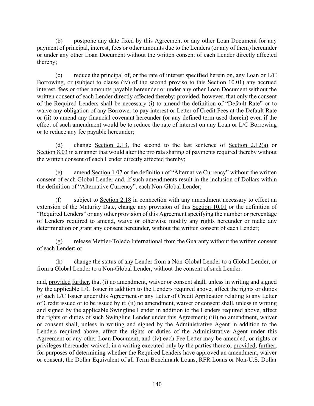 140 (b) postpone any date fixed by this Agreement or any other Loan Document for any payment of principal, interest, fees or other amounts due to the Lenders (or any of them) hereunder or under any other Loan Document without the written consent of each Lender directly affected thereby; (c) reduce the principal of, or the rate of interest specified herein on, any Loan or L/C Borrowing, or (subject to clause (iv) of the second proviso to this Section 10.01) any accrued interest, fees or other amounts payable hereunder or under any other Loan Document without the written consent of each Lender directly affected thereby; provided, however, that only the consent of the Required Lenders shall be necessary (i) to amend the definition of “Default Rate” or to waive any obligation of any Borrower to pay interest or Letter of Credit Fees at the Default Rate or (ii) to amend any financial covenant hereunder (or any defined term used therein) even if the effect of such amendment would be to reduce the rate of interest on any Loan or L/C Borrowing or to reduce any fee payable hereunder; (d) change Section 2.13, the second to the last sentence of Section 2.12(a) or Section 8.03 in a manner that would alter the pro rata sharing of payments required thereby without the written consent of each Lender directly affected thereby; (e) amend Section 1.07 or the definition of “Alternative Currency” without the written consent of each Global Lender and, if such amendments result in the inclusion of Dollars within the definition of “Alternative Currency”, each Non-Global Lender; (f) subject to Section 2.18 in connection with any amendment necessary to effect an extension of the Maturity Date, change any provision of this Section 10.01 or the definition of “Required Lenders” or any other provision of this Agreement specifying the number or percentage of Lenders required to amend, waive or otherwise modify any rights hereunder or make any determination or grant any consent hereunder, without the written consent of each Lender; (g) release Mettler-Toledo International from the Guaranty without the written consent of each Lender; or (h) change the status of any Lender from a Non-Global Lender to a Global Lender, or from a Global Lender to a Non-Global Lender, without the consent of such Lender. and, provided further, that (i) no amendment, waiver or consent shall, unless in writing and signed by the applicable L/C Issuer in addition to the Lenders required above, affect the rights or duties of such L/C Issuer under this Agreement or any Letter of Credit Application relating to any Letter of Credit issued or to be issued by it; (ii) no amendment, waiver or consent shall, unless in writing and signed by the applicable Swingline Lender in addition to the Lenders required above, affect the rights or duties of such Swingline Lender under this Agreement; (iii) no amendment, waiver or consent shall, unless in writing and signed by the Administrative Agent in addition to the Lenders required above, affect the rights or duties of the Administrative Agent under this Agreement or any other Loan Document; and (iv) each Fee Letter may be amended, or rights or privileges thereunder waived, in a writing executed only by the parties thereto; provided, further, for purposes of determining whether the Required Lenders have approved an amendment, waiver or consent, the Dollar Equivalent of all Term Benchmark Loans, RFR Loans or Non-U.S. Dollar