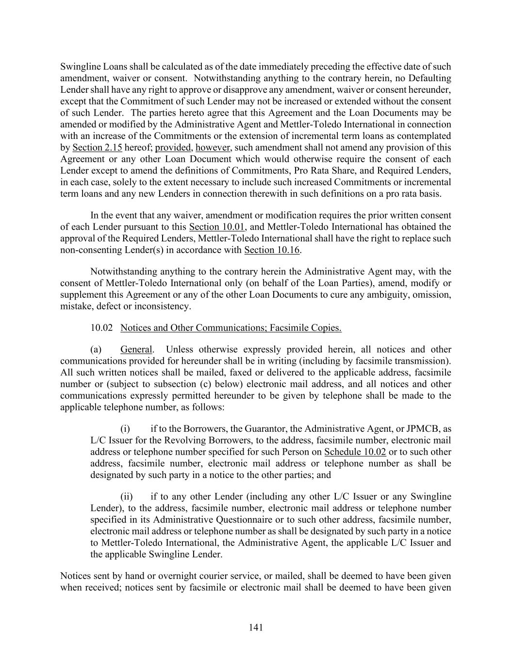 141 Swingline Loans shall be calculated as of the date immediately preceding the effective date of such amendment, waiver or consent. Notwithstanding anything to the contrary herein, no Defaulting Lender shall have any right to approve or disapprove any amendment, waiver or consent hereunder, except that the Commitment of such Lender may not be increased or extended without the consent of such Lender. The parties hereto agree that this Agreement and the Loan Documents may be amended or modified by the Administrative Agent and Mettler-Toledo International in connection with an increase of the Commitments or the extension of incremental term loans as contemplated by Section 2.15 hereof; provided, however, such amendment shall not amend any provision of this Agreement or any other Loan Document which would otherwise require the consent of each Lender except to amend the definitions of Commitments, Pro Rata Share, and Required Lenders, in each case, solely to the extent necessary to include such increased Commitments or incremental term loans and any new Lenders in connection therewith in such definitions on a pro rata basis. In the event that any waiver, amendment or modification requires the prior written consent of each Lender pursuant to this Section 10.01, and Mettler-Toledo International has obtained the approval of the Required Lenders, Mettler-Toledo International shall have the right to replace such non-consenting Lender(s) in accordance with Section 10.16. Notwithstanding anything to the contrary herein the Administrative Agent may, with the consent of Mettler-Toledo International only (on behalf of the Loan Parties), amend, modify or supplement this Agreement or any of the other Loan Documents to cure any ambiguity, omission, mistake, defect or inconsistency. 10.02 Notices and Other Communications; Facsimile Copies. (a) General. Unless otherwise expressly provided herein, all notices and other communications provided for hereunder shall be in writing (including by facsimile transmission). All such written notices shall be mailed, faxed or delivered to the applicable address, facsimile number or (subject to subsection (c) below) electronic mail address, and all notices and other communications expressly permitted hereunder to be given by telephone shall be made to the applicable telephone number, as follows: (i) if to the Borrowers, the Guarantor, the Administrative Agent, or JPMCB, as L/C Issuer for the Revolving Borrowers, to the address, facsimile number, electronic mail address or telephone number specified for such Person on Schedule 10.02 or to such other address, facsimile number, electronic mail address or telephone number as shall be designated by such party in a notice to the other parties; and (ii) if to any other Lender (including any other L/C Issuer or any Swingline Lender), to the address, facsimile number, electronic mail address or telephone number specified in its Administrative Questionnaire or to such other address, facsimile number, electronic mail address or telephone number as shall be designated by such party in a notice to Mettler-Toledo International, the Administrative Agent, the applicable L/C Issuer and the applicable Swingline Lender. Notices sent by hand or overnight courier service, or mailed, shall be deemed to have been given when received; notices sent by facsimile or electronic mail shall be deemed to have been given